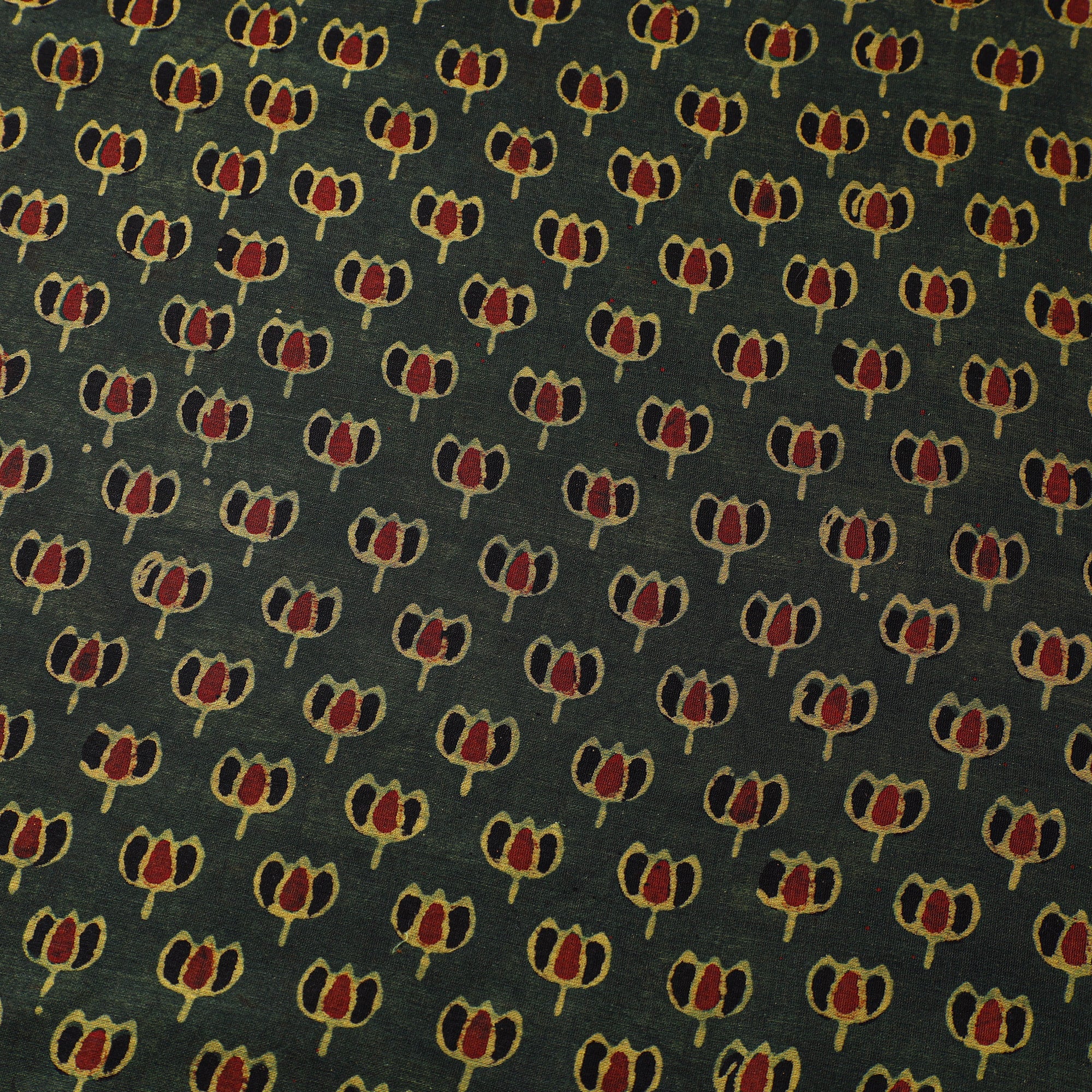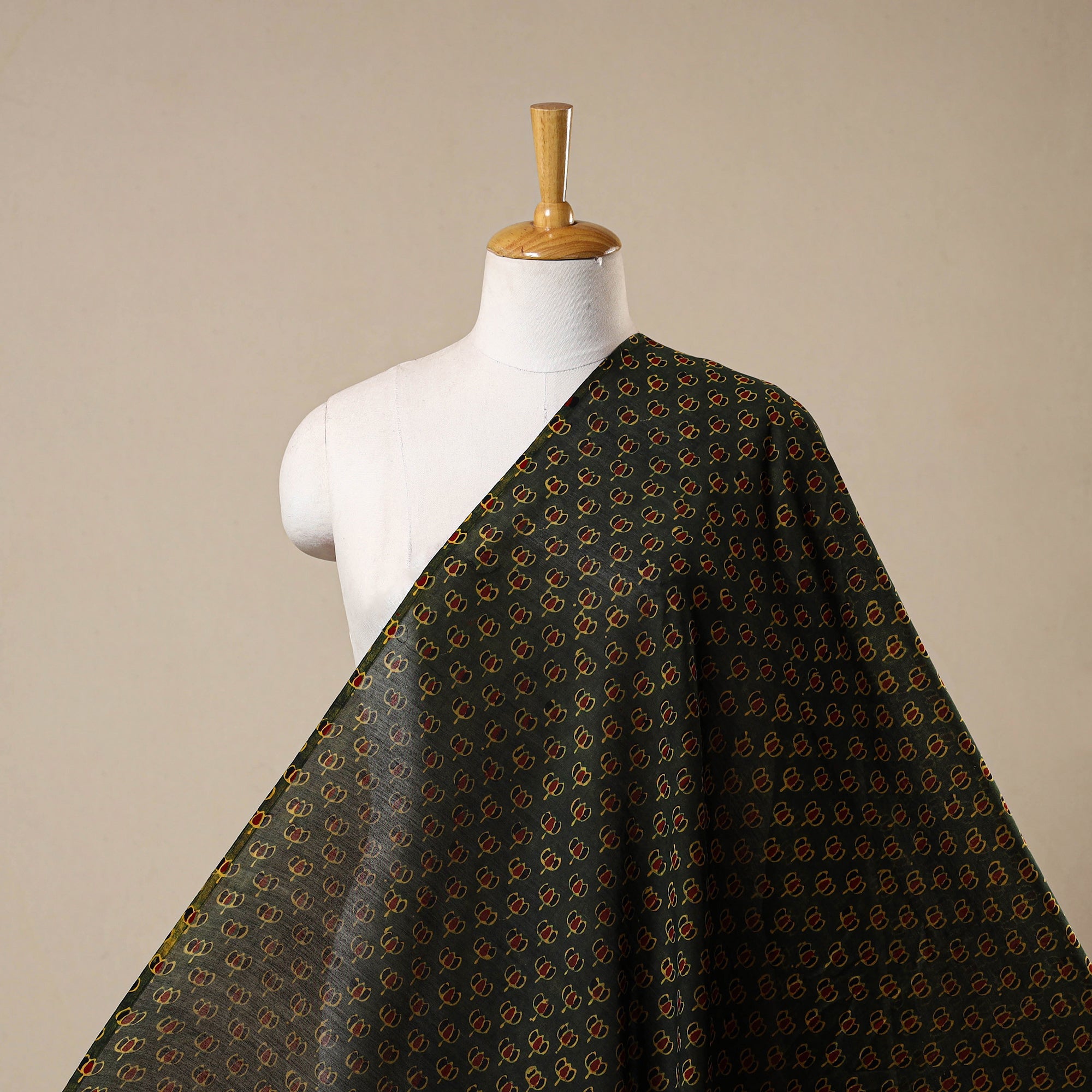 Green ajrakh fabric is hand block-printed in Kutch using natural dyes and age-old techniques passed down through generations. Crafted with precision, each motif reflects Gujarat’s rich textile heritage. Made of chanderi silk and mercerized cotton blend, it's ideal for creating kurtas, shirts, dresses, or even elegant home decor accents.