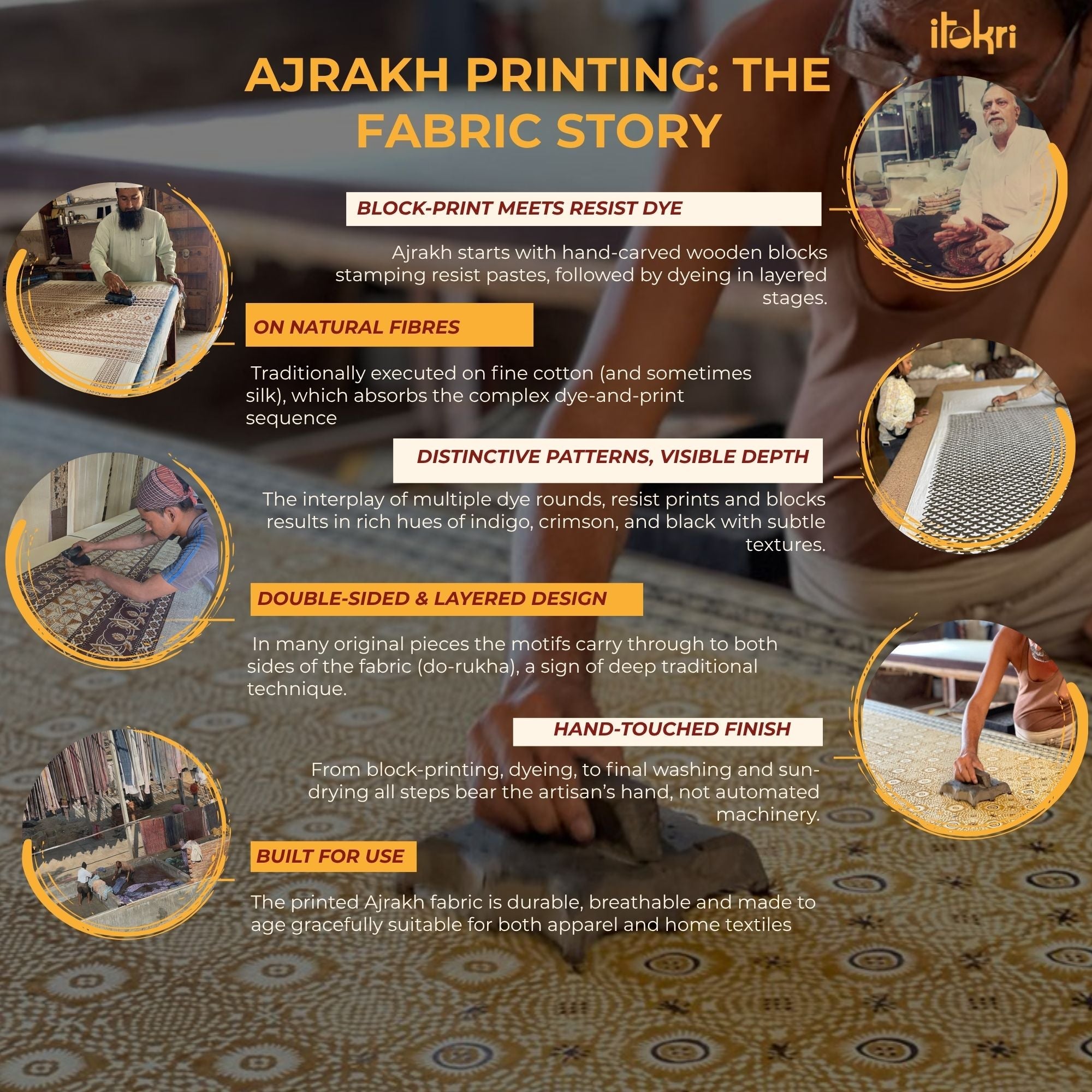 Ajrakh is a well-known traditional vegetable dyeing that resists block-printing techniques on cloth. Originated in Kutch, It is nearly around 4,500 years old practised by Khatri community of Kutch and Sikh.