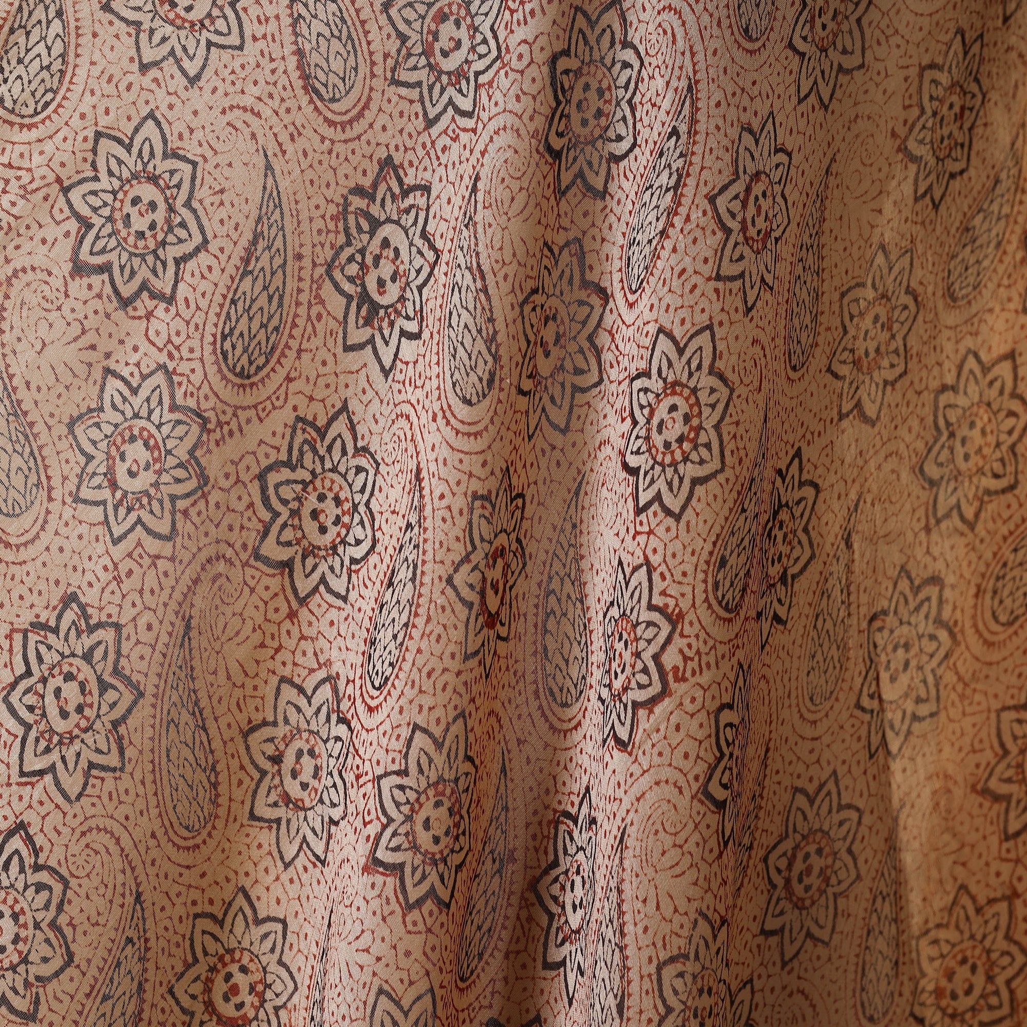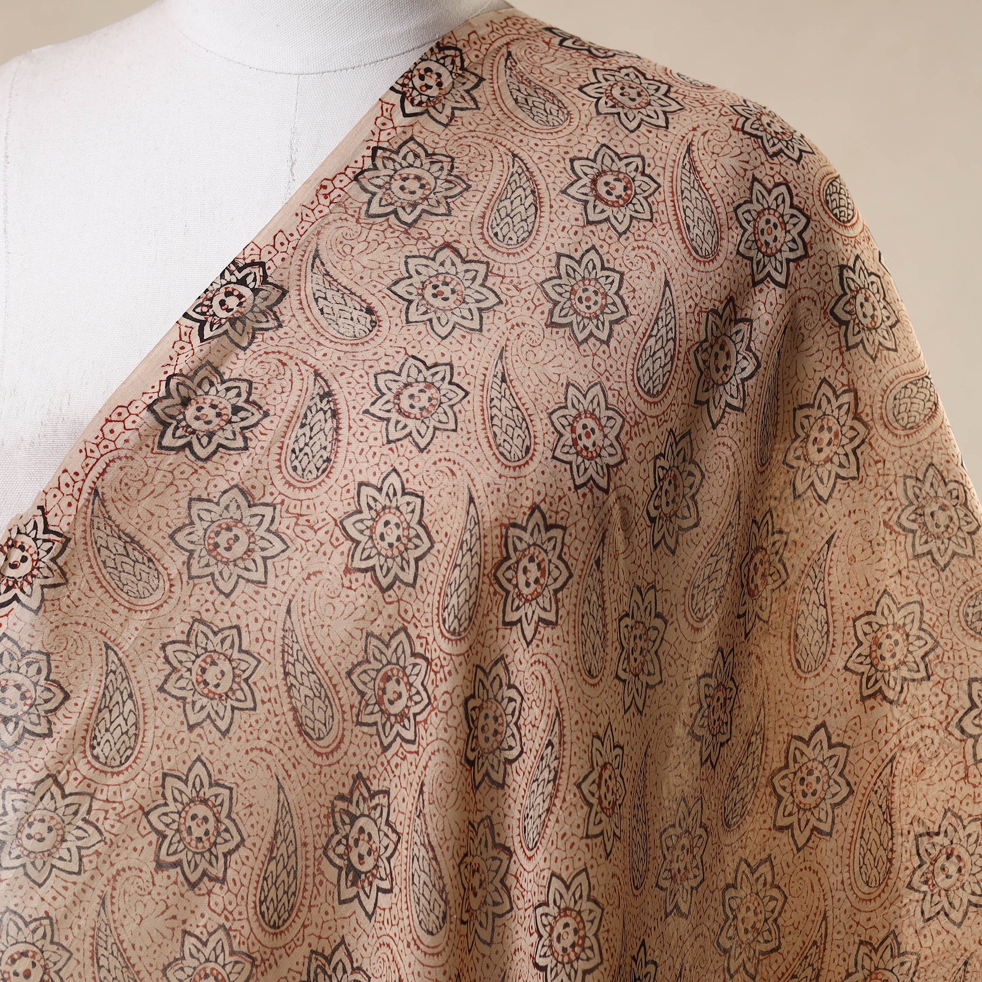 Experience the charm of Indian block printing with this beautifully crafted beige handloom chanderi silk-cotton pedana kalamkari fabric. Featuring traditional motifs and printed using natural dyes by Pedana’s master artisans, it ensures both beauty and sustainability. Perfect for creating unique garments or home decor.