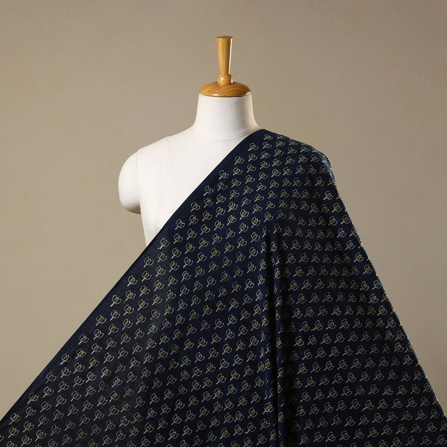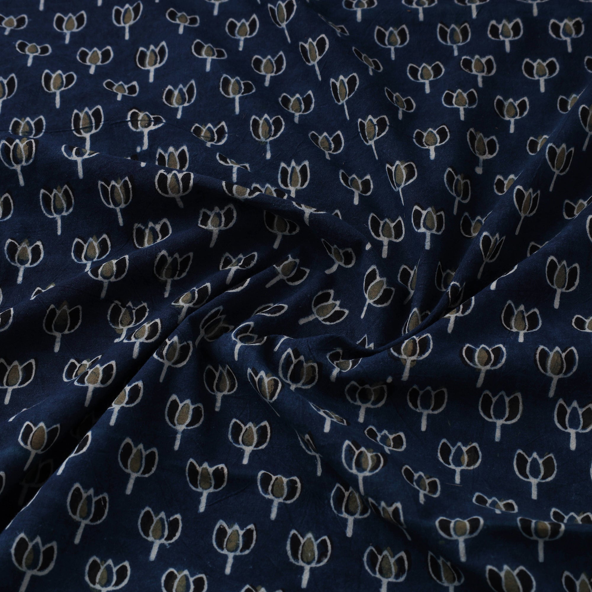 This blue ajrakh cotton fabric from Kutch, Gujarat, is made using natural dyes and an ancient resist hand-block printing technique rooted in centuries of tradition. Ajrakh is known for its earthy tones and intricate patterns, making it perfect for kurtas, dresses, or home decor.