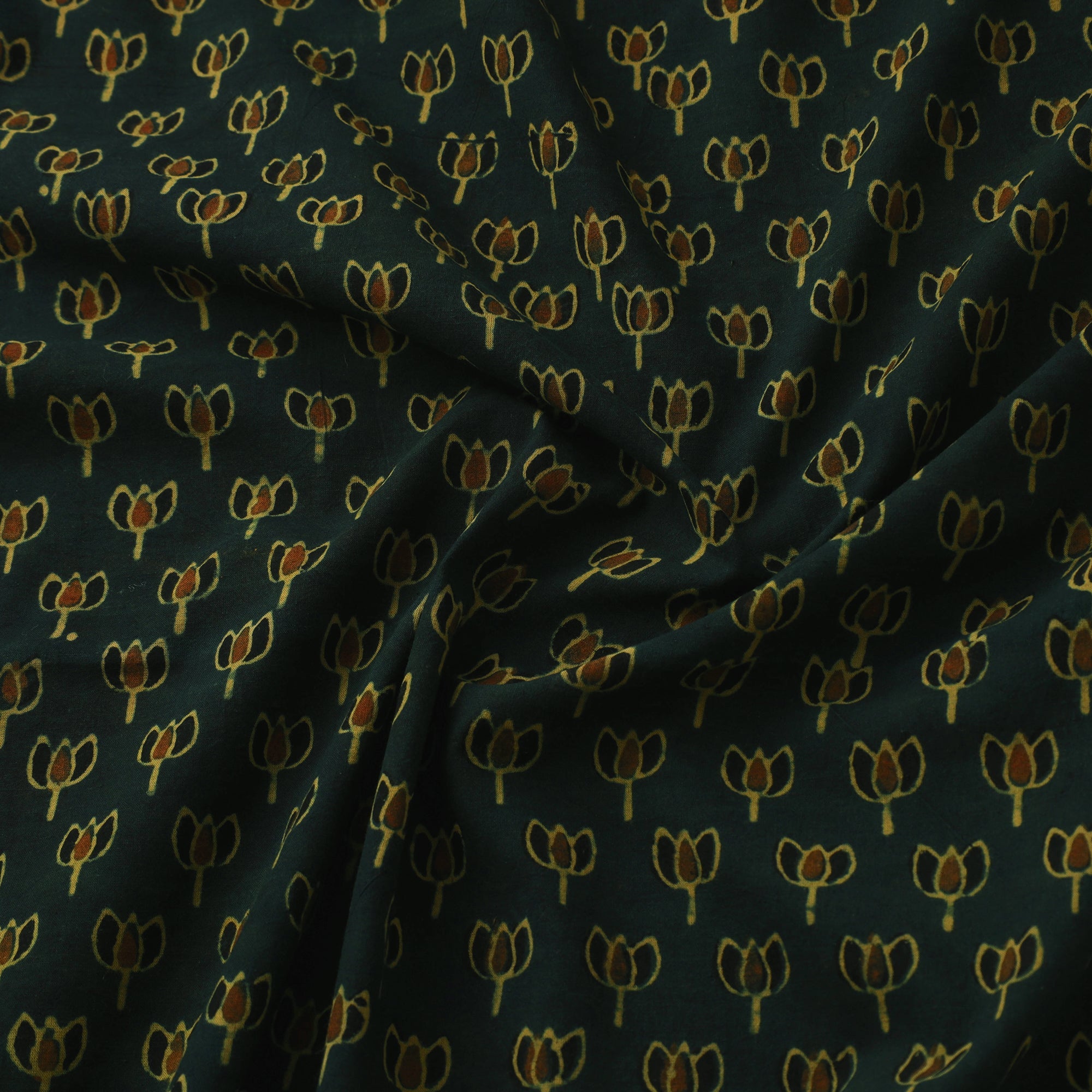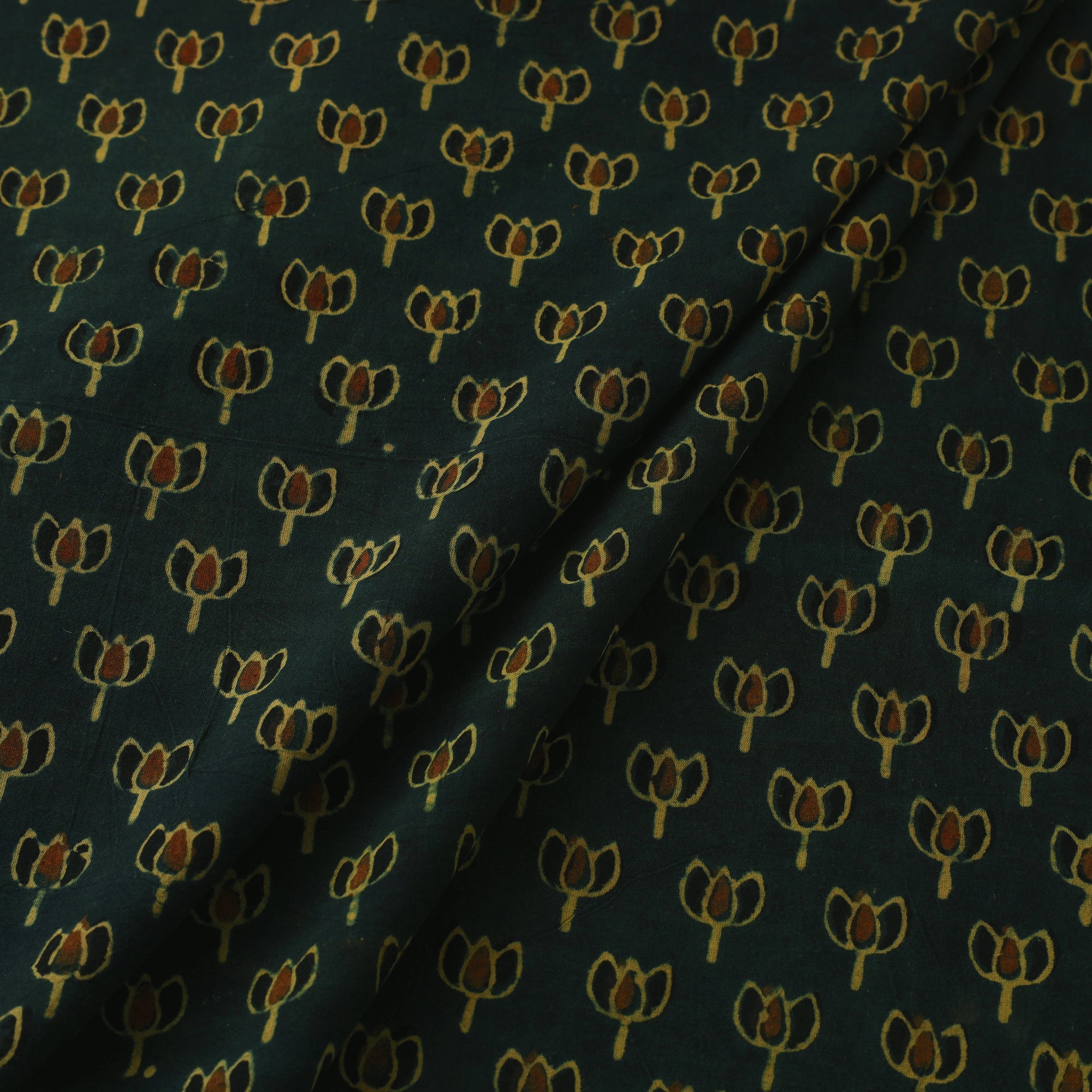 This green ajrakh cotton fabric from Kutch, Gujarat, is made using natural dyes and an ancient resist hand-block printing technique rooted in centuries of tradition. Ajrakh is known for its earthy tones and intricate patterns, making it perfect for kurtas, dresses, or home decor.
