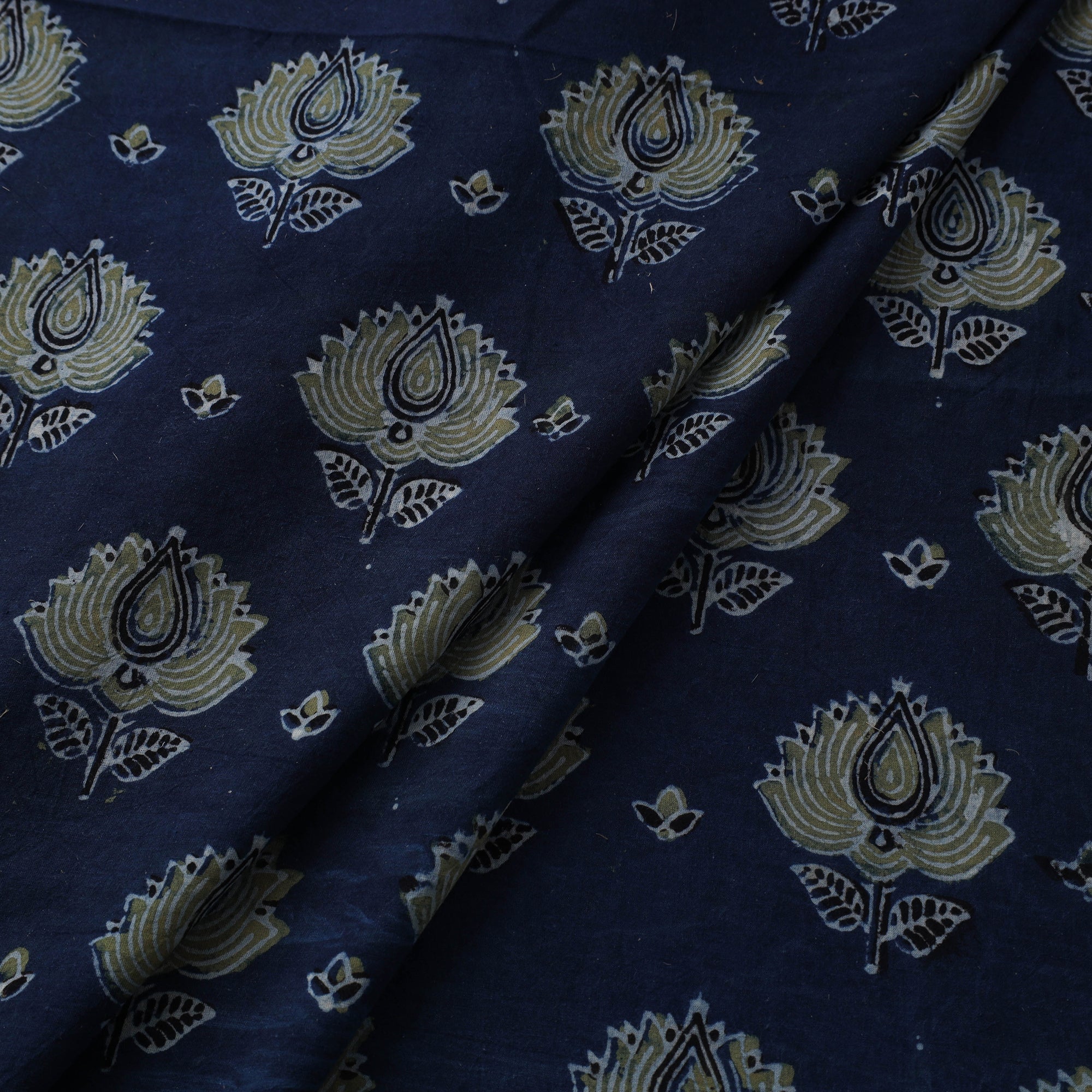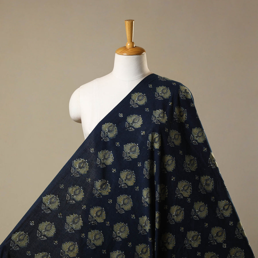 This blue ajrakh cotton fabric from Kutch, Gujarat, is made using natural dyes and an ancient resist hand-block printing technique rooted in centuries of tradition. Ajrakh is known for its earthy tones and intricate patterns, making it perfect for kurtas, dresses, or home decor.