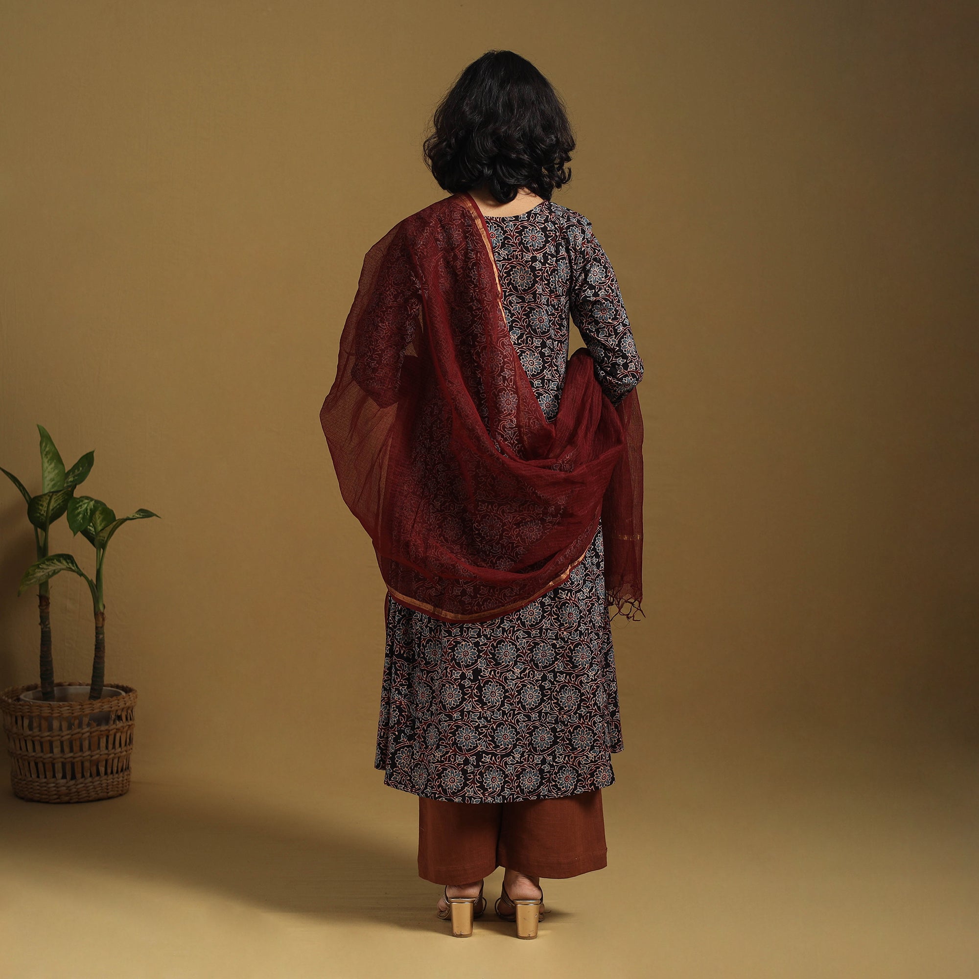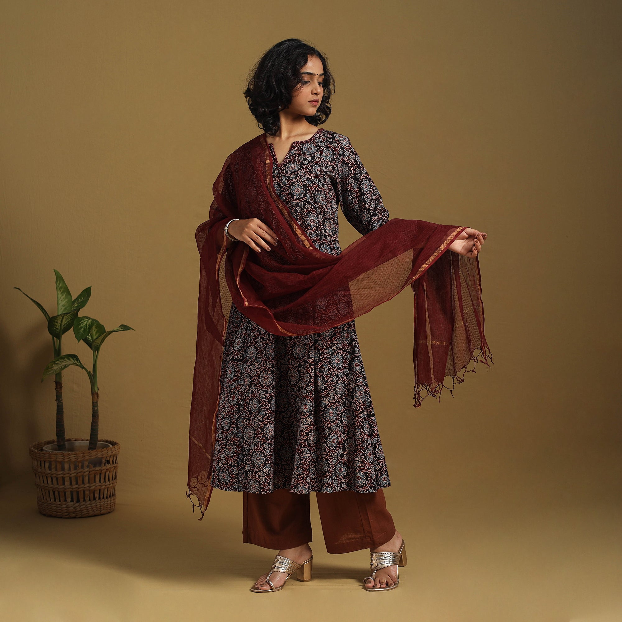 This black ajrakh cotton kurta set features a beautifully hand block-printed A-Line kurta made using traditional natural dyes. It is paired with a plain cotton palazzo and a lightweight kota doria dupatta. Designed for all-day comfort and ease, the kurta includes a handy side pocket, while the palazzo has two spacious pockets, making this three-piece set ideal for everyday elegance and small festive occasions.