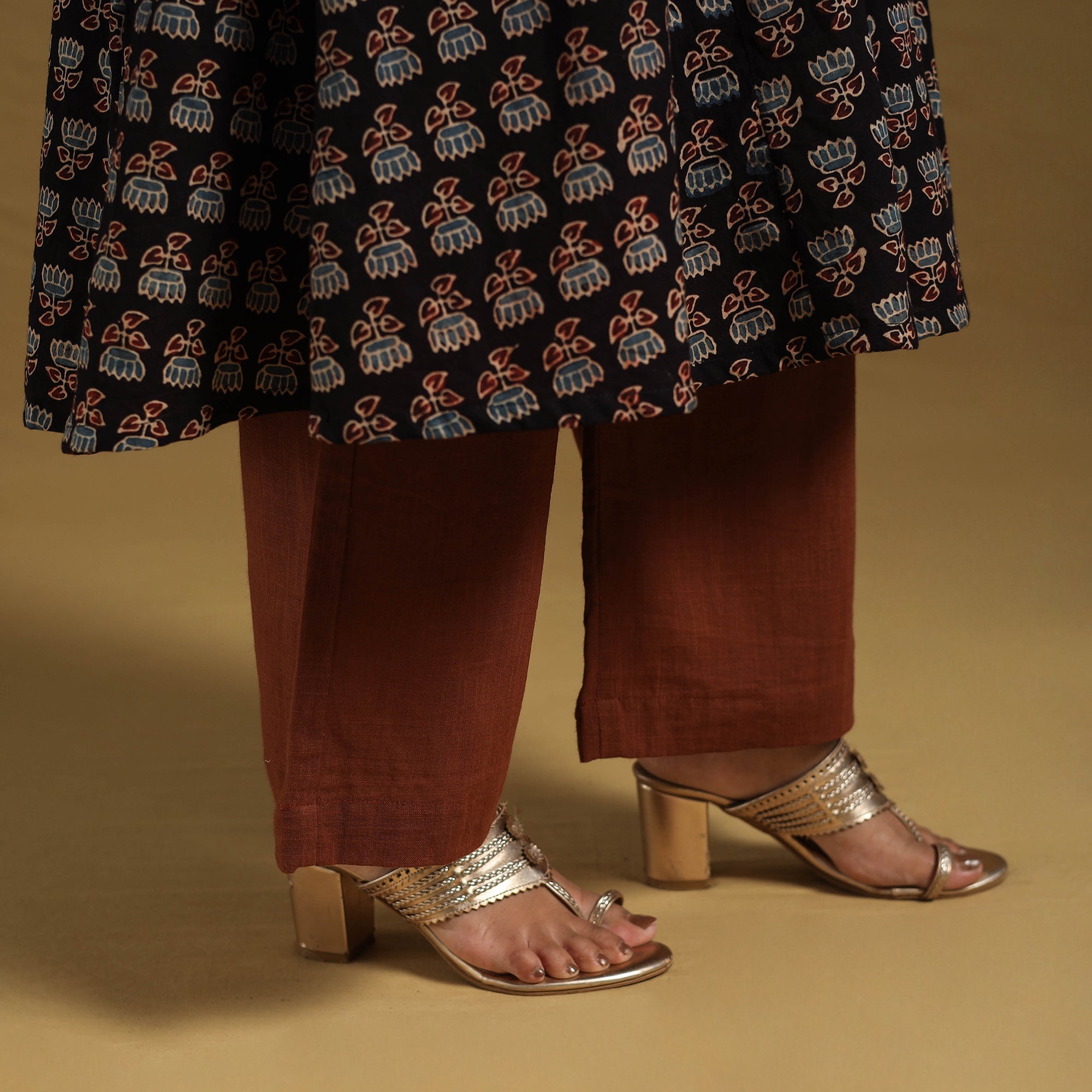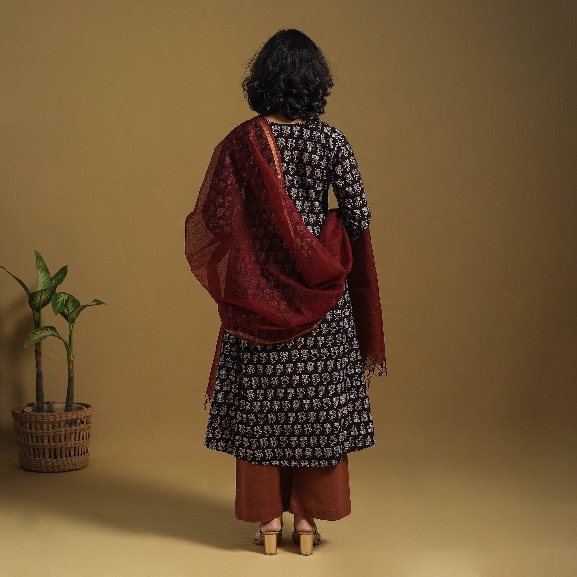 This black ajrakh cotton kurta set features a beautifully hand block-printed A-Line kurta made using traditional natural dyes. It is paired with a plain cotton palazzo and a lightweight kota doria dupatta. Designed for all-day comfort and ease, the kurta includes a handy side pocket, while the palazzo has two spacious pockets, making this three-piece set ideal for everyday elegance and small festive occasions.