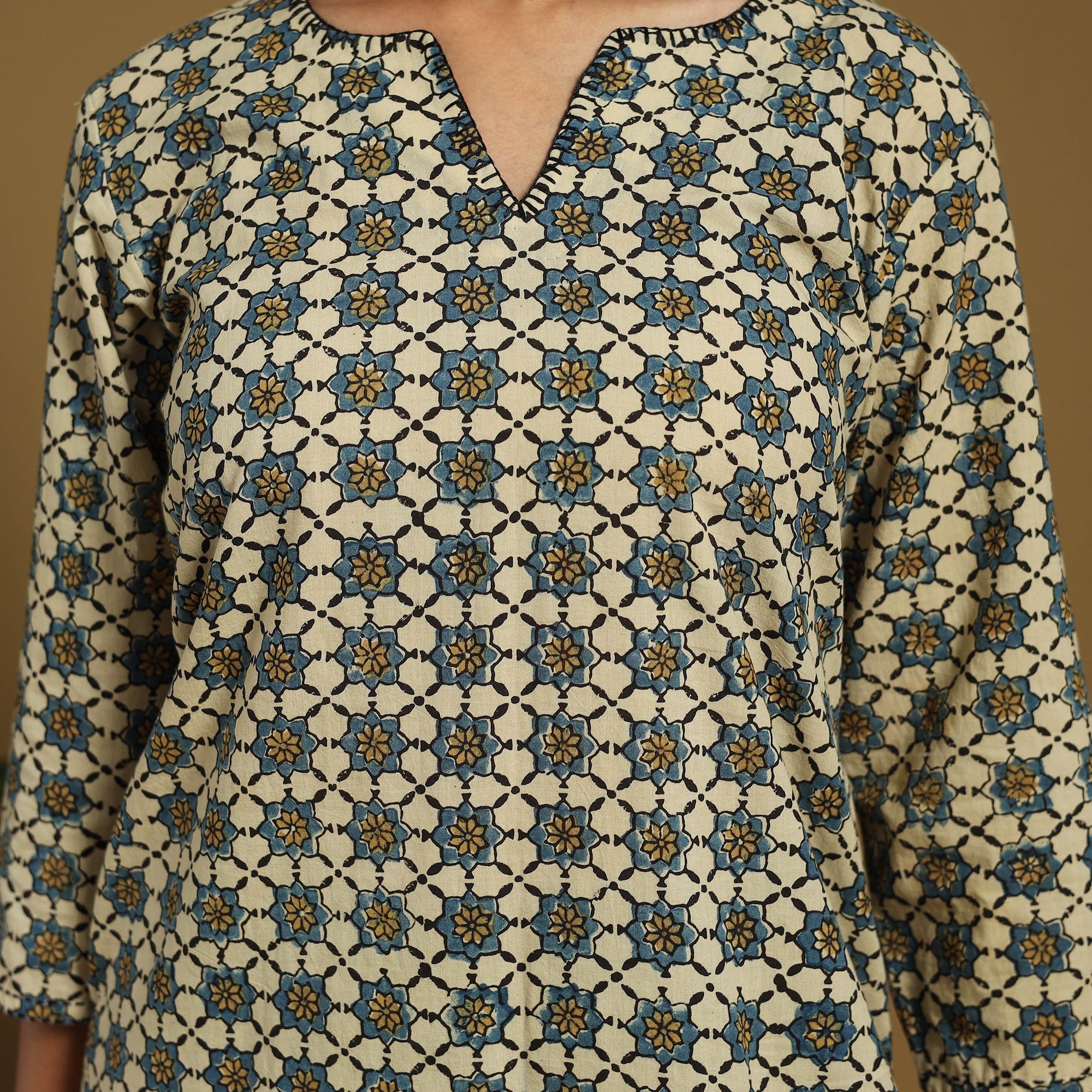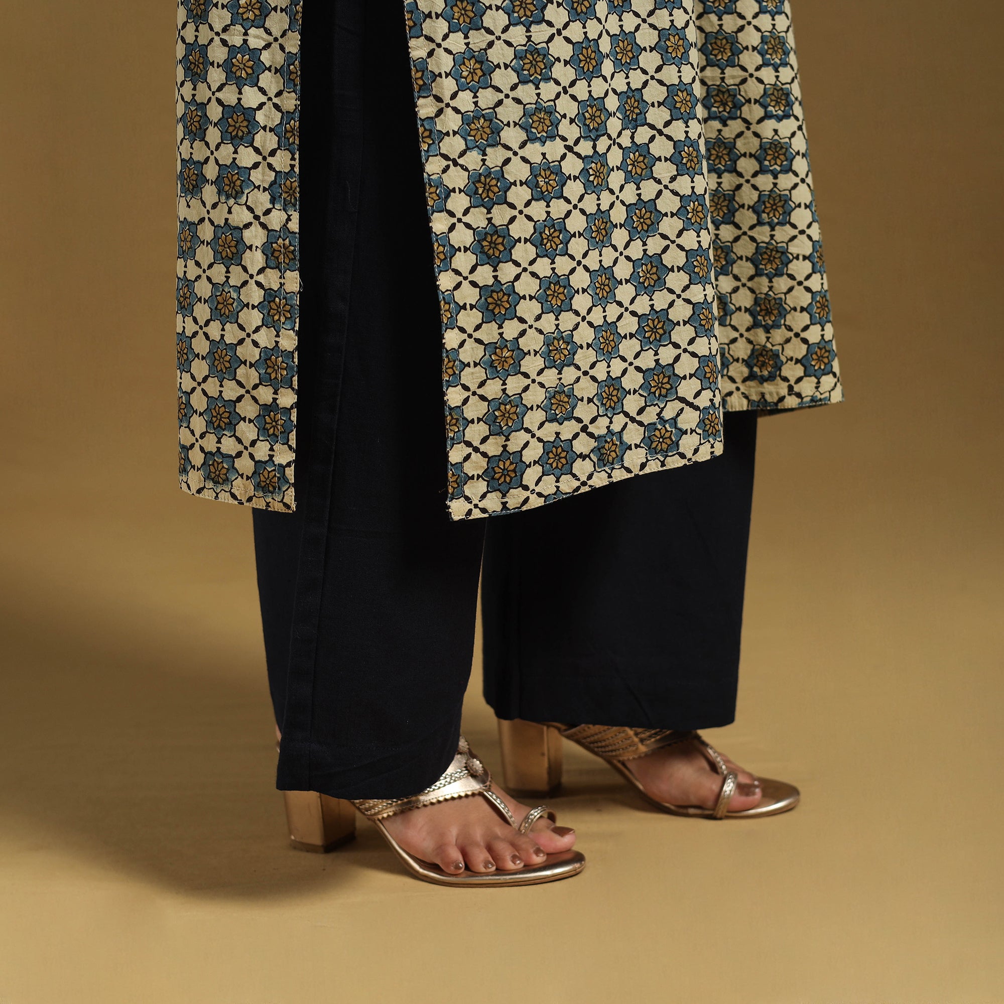 This beige ajrakh cotton kurta set features a beautifully hand block-printed straight kurta, crafted using traditional natural dyes. It is paired with a plain cotton palazzo and a lightweight kota doria dupatta, forming a complete ensemble. Designed for all-day comfort, the kurta includes a practical side pocket, while the palazzo offers two functional pockets. This thoughtfully tailored three-piece set is ideal for everyday wear and festive gatherings.