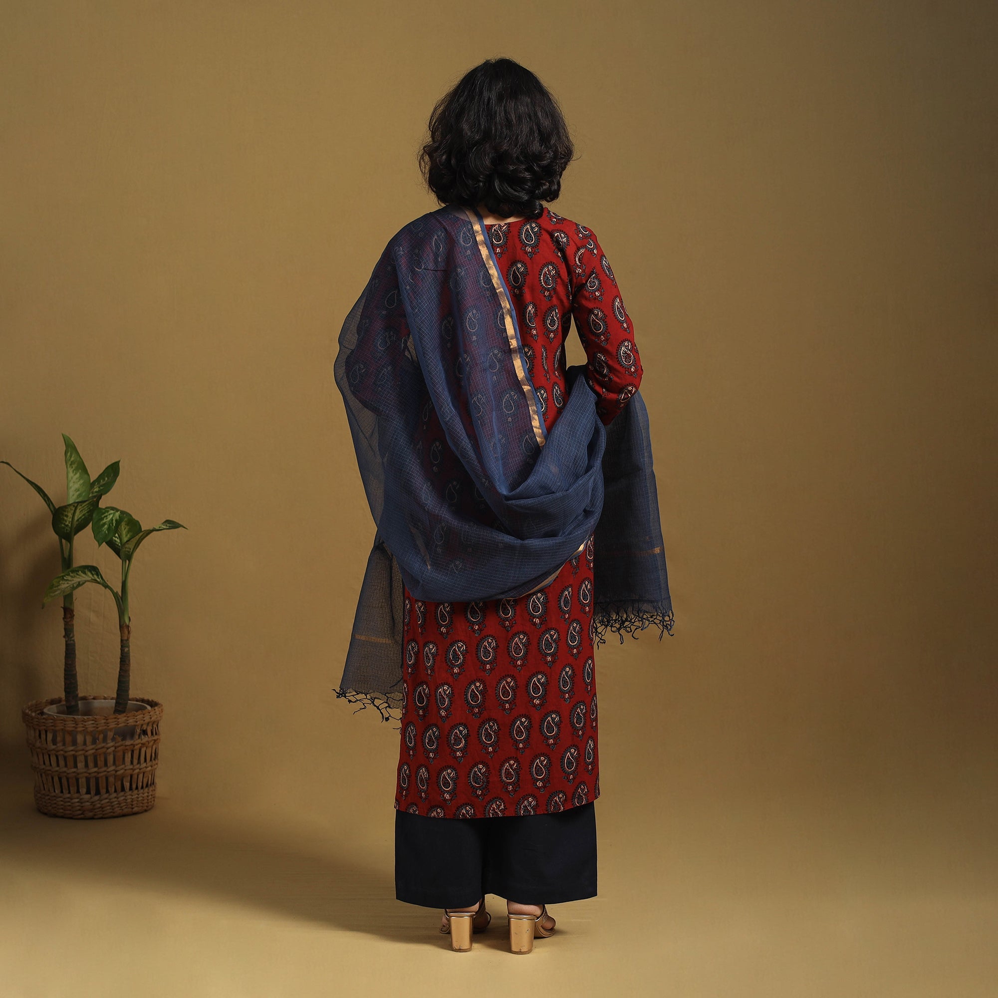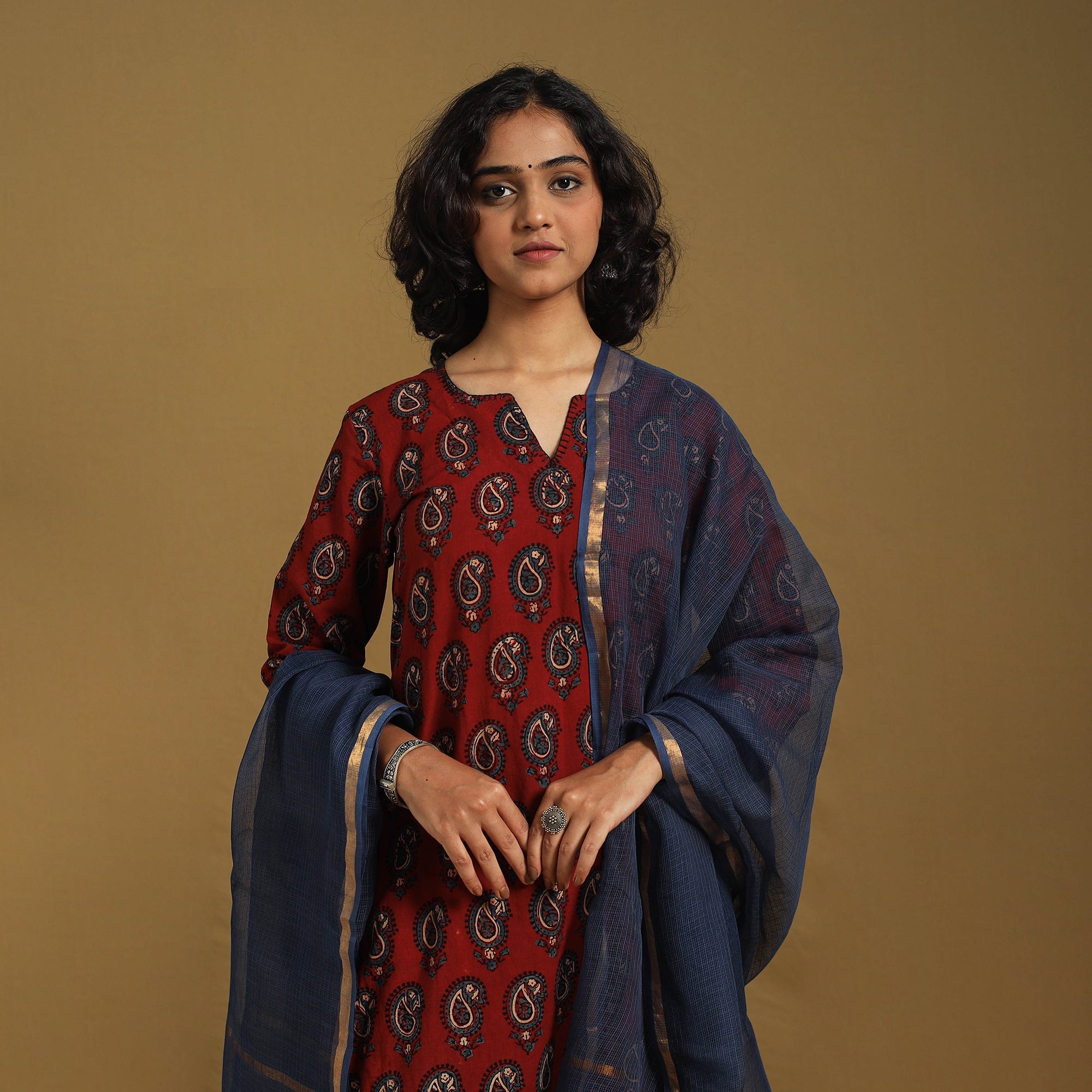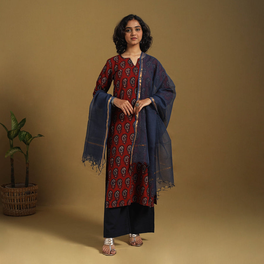 This red ajrakh cotton kurta set features a beautifully hand block-printed straight kurta, crafted using traditional natural dyes. It is paired with a plain cotton palazzo and a lightweight kota doria dupatta, forming a complete ensemble. Designed for all-day comfort, the kurta includes a practical side pocket, while the palazzo offers two functional pockets. This thoughtfully tailored three-piece set is ideal for everyday wear and festive gatherings.