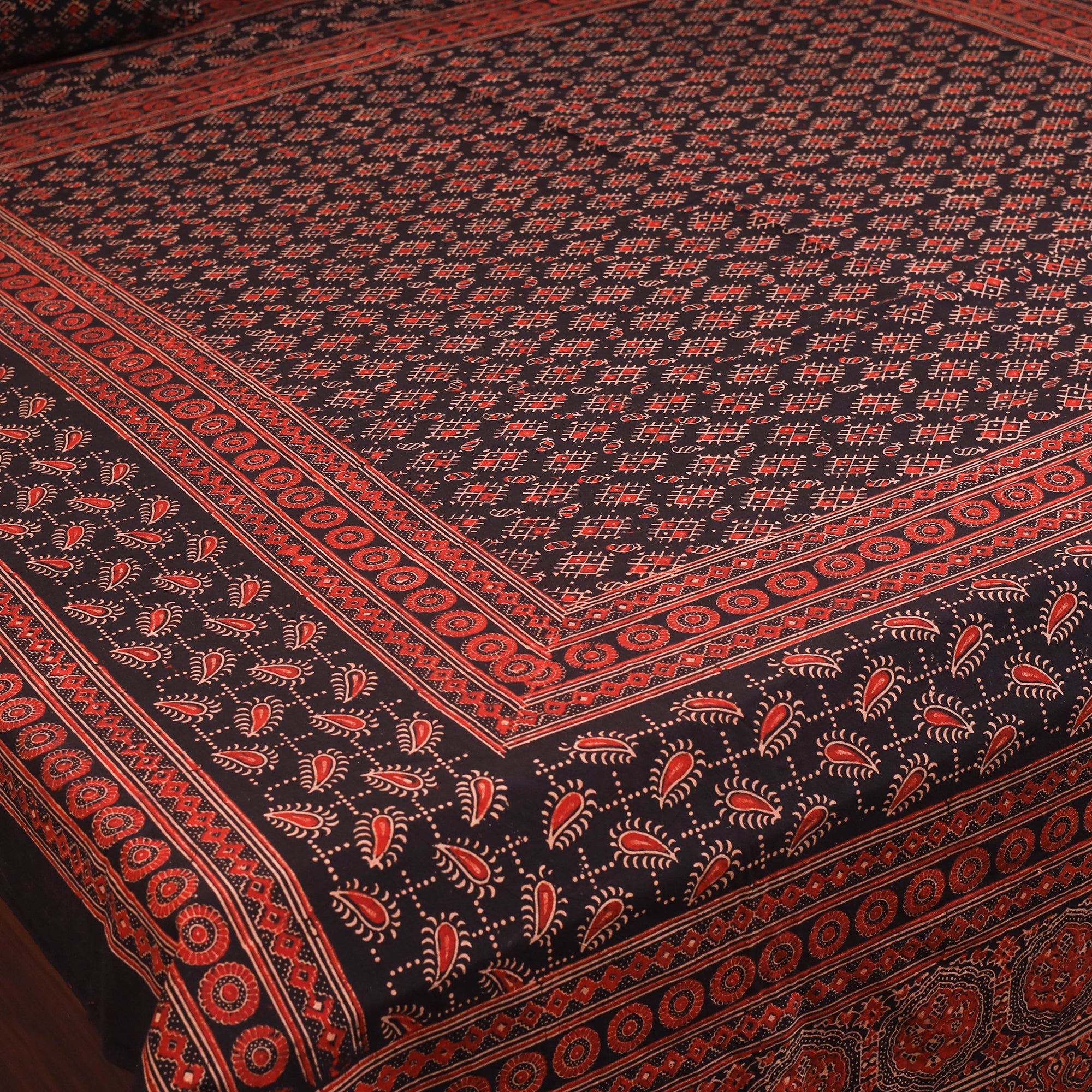Add a touch of heritage to your home with this black block print cotton double ajrakh bed sheet set, crafted by skilled artisans in the Kutch region of Gujarat. The vibrant patterns are created using traditional resist block-printing techniques with natural dyes. Complete with matching pillow covers, this set is a perfect addition to any room.