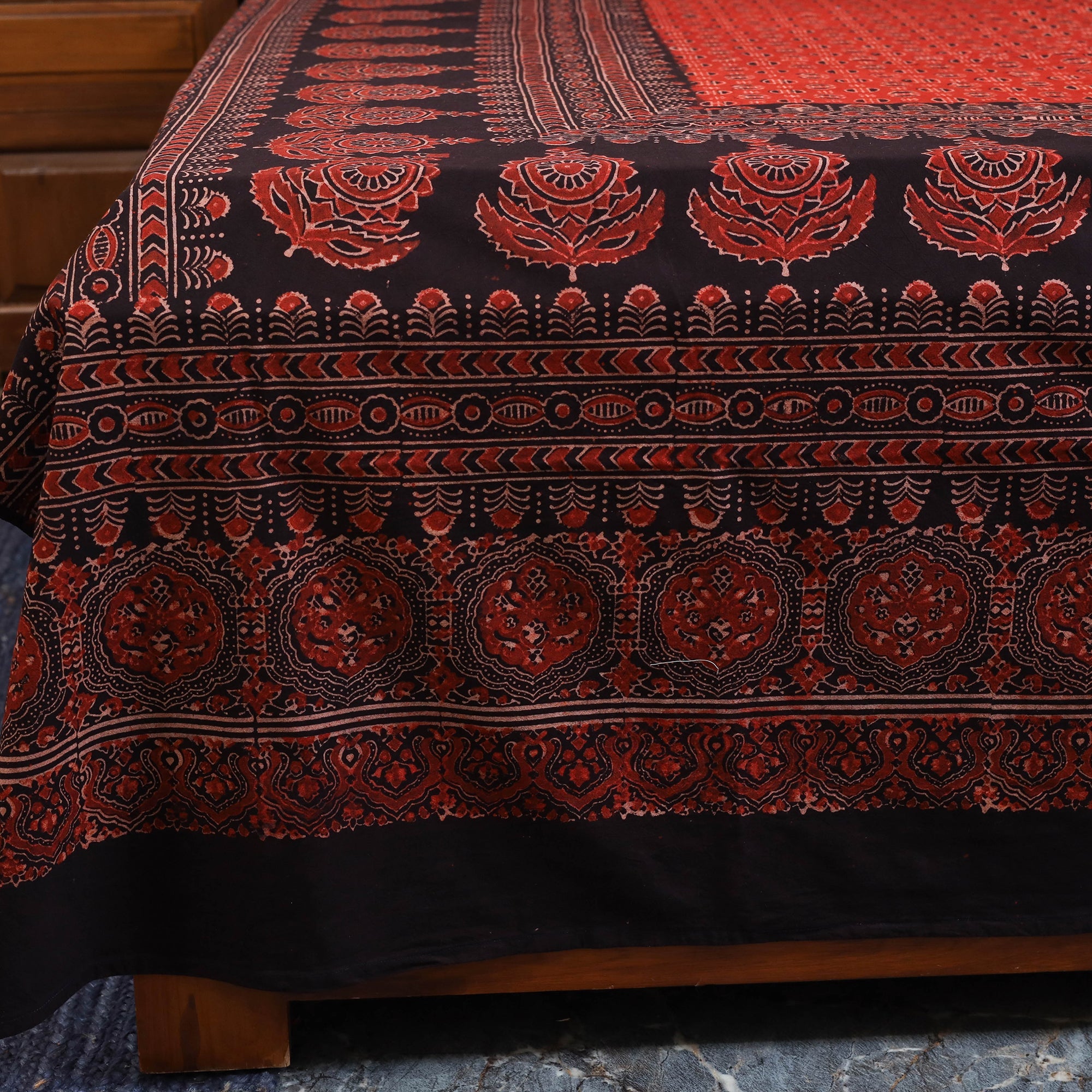 Add a touch of heritage to your home with this red block print cotton double ajrakh bed sheet set, crafted by skilled artisans in the Kutch region of Gujarat. The vibrant patterns are created using traditional resist block-printing techniques with natural dyes. Complete with matching pillow covers, this set is a perfect addition to any room.