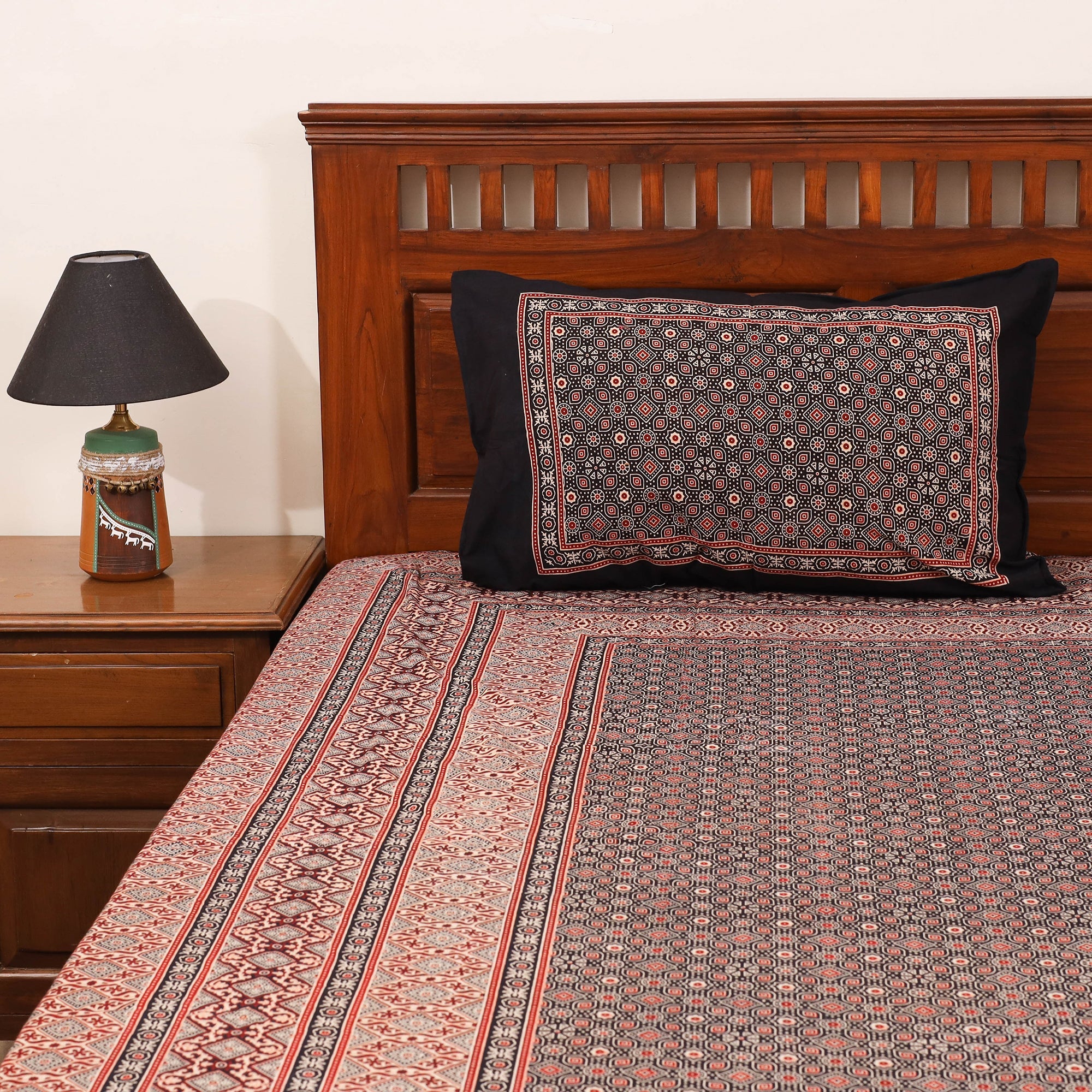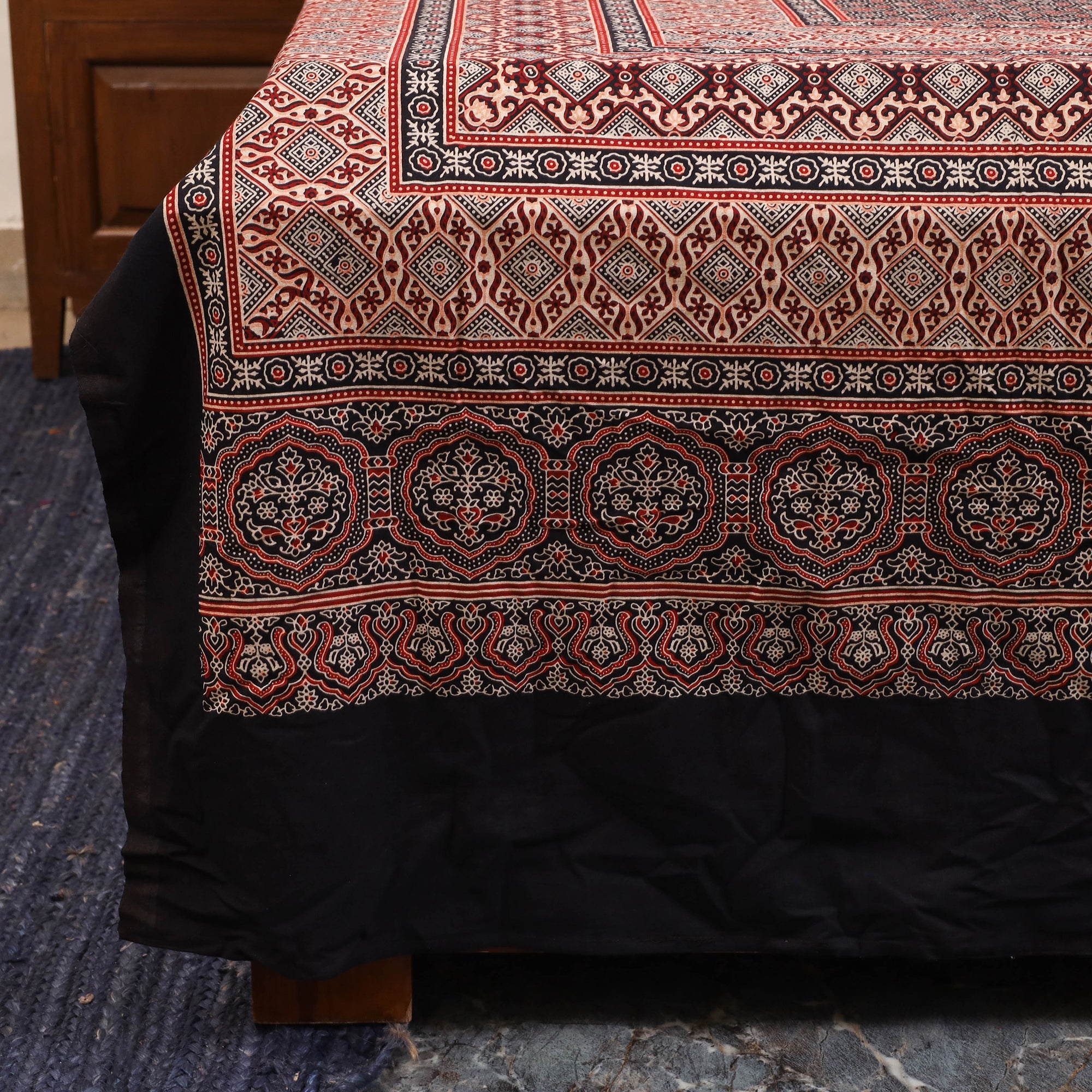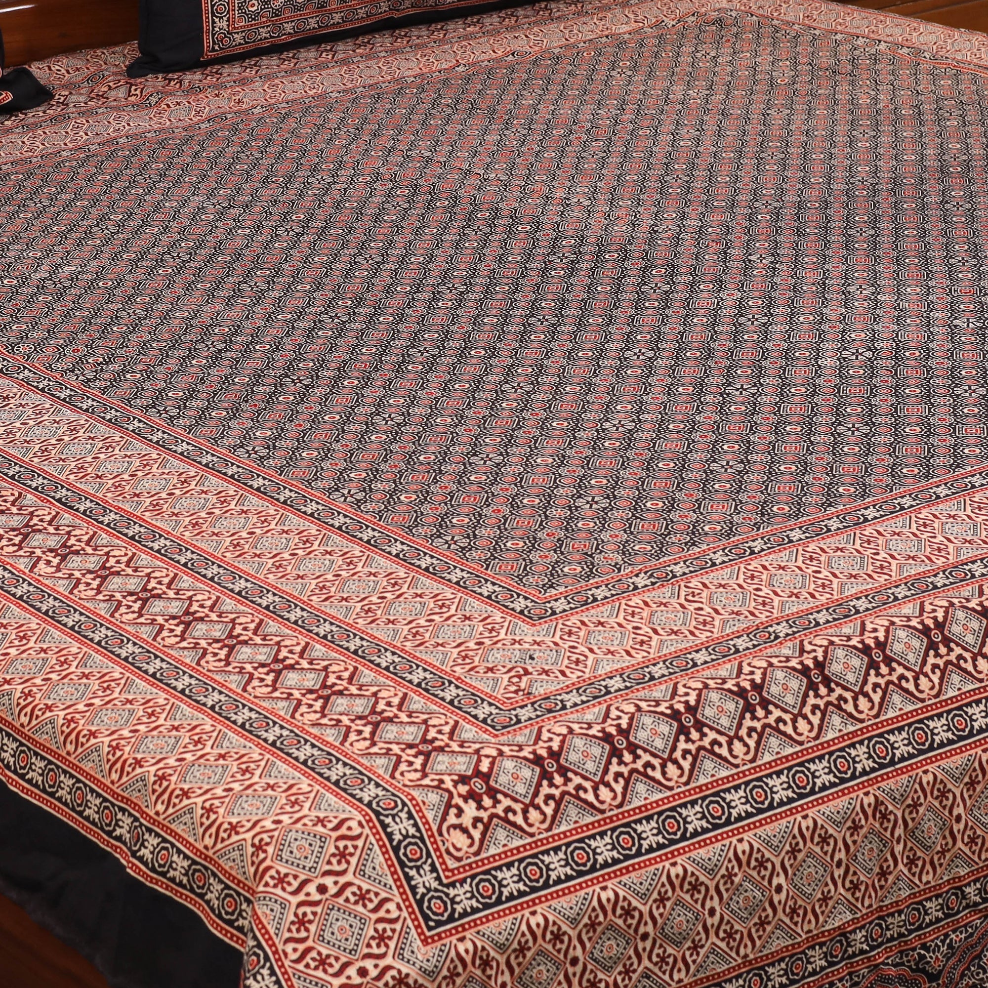 This black ajrakh block print double bedsheet set is made in Barmer, Rajasthan by skilled artisans. It is crafted using hand block printing with natural dyes. The set includes one double bedsheet and two matching pillow covers. The intricate patterns make it a stylish choice for your bedroom. Simple yet elegant, this set brings comfort and charm to your everyday home decor.