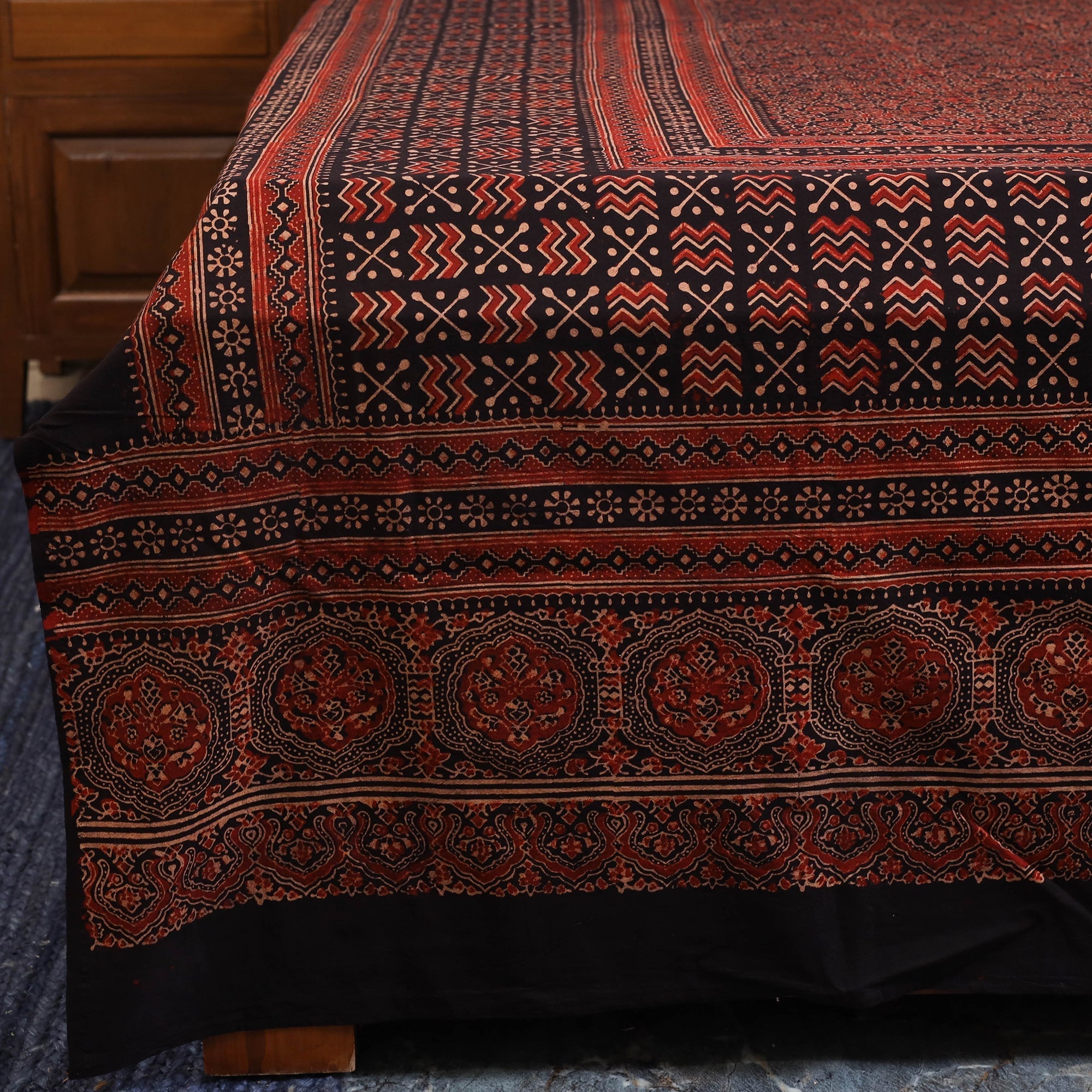 Add a touch of heritage to your home with this red block print cotton double ajrakh bed sheet set, crafted by skilled artisans in the Kutch region of Gujarat. The vibrant patterns are created using traditional resist block-printing techniques with natural dyes. Complete with matching pillow covers, this set is a perfect addition to any room.
