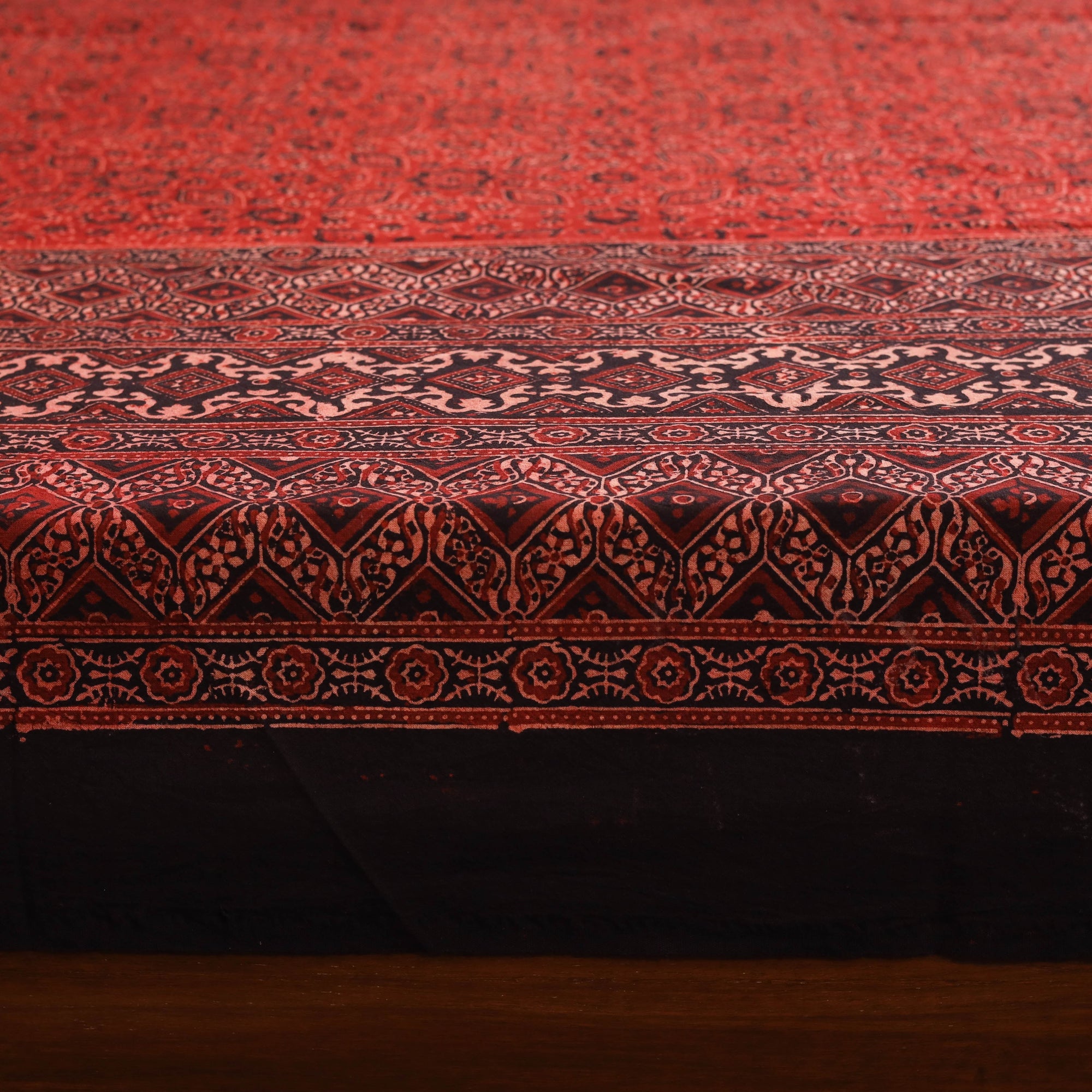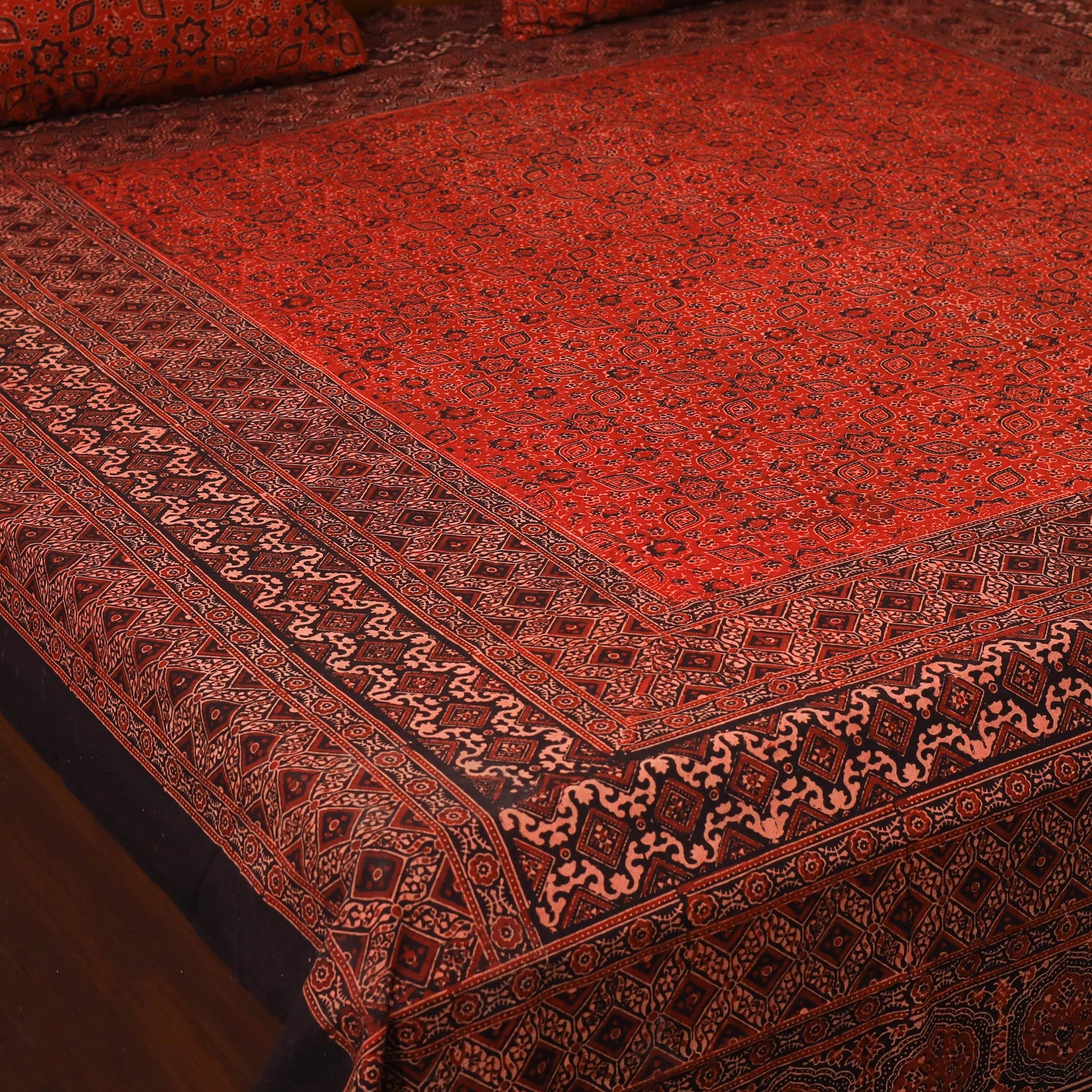 Add a touch of heritage to your home with this red block print cotton double ajrakh bed sheet set, crafted by skilled artisans in the Kutch region of Gujarat. The vibrant patterns are created using traditional resist block-printing techniques with natural dyes. Complete with matching pillow covers, this set is a perfect addition to any room.