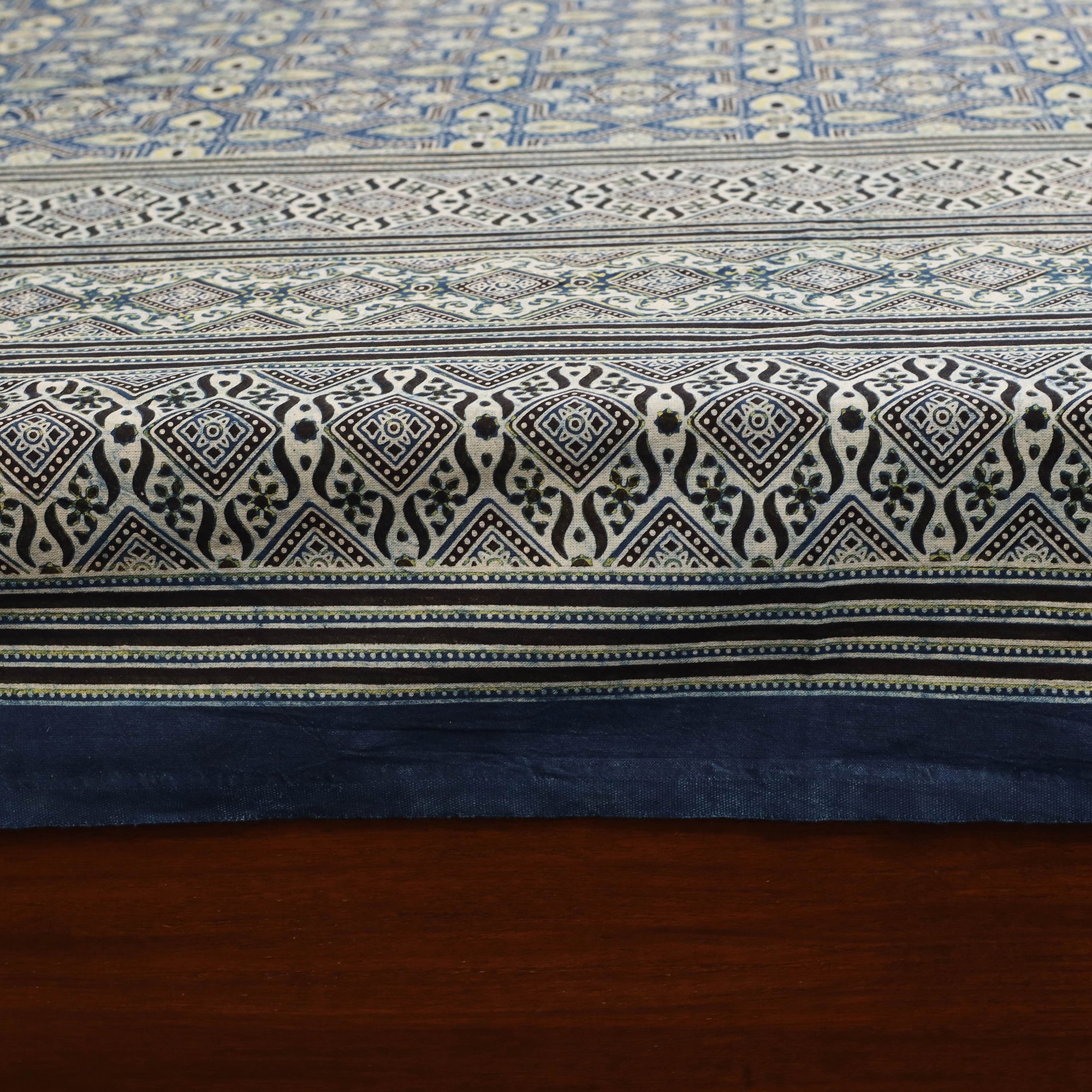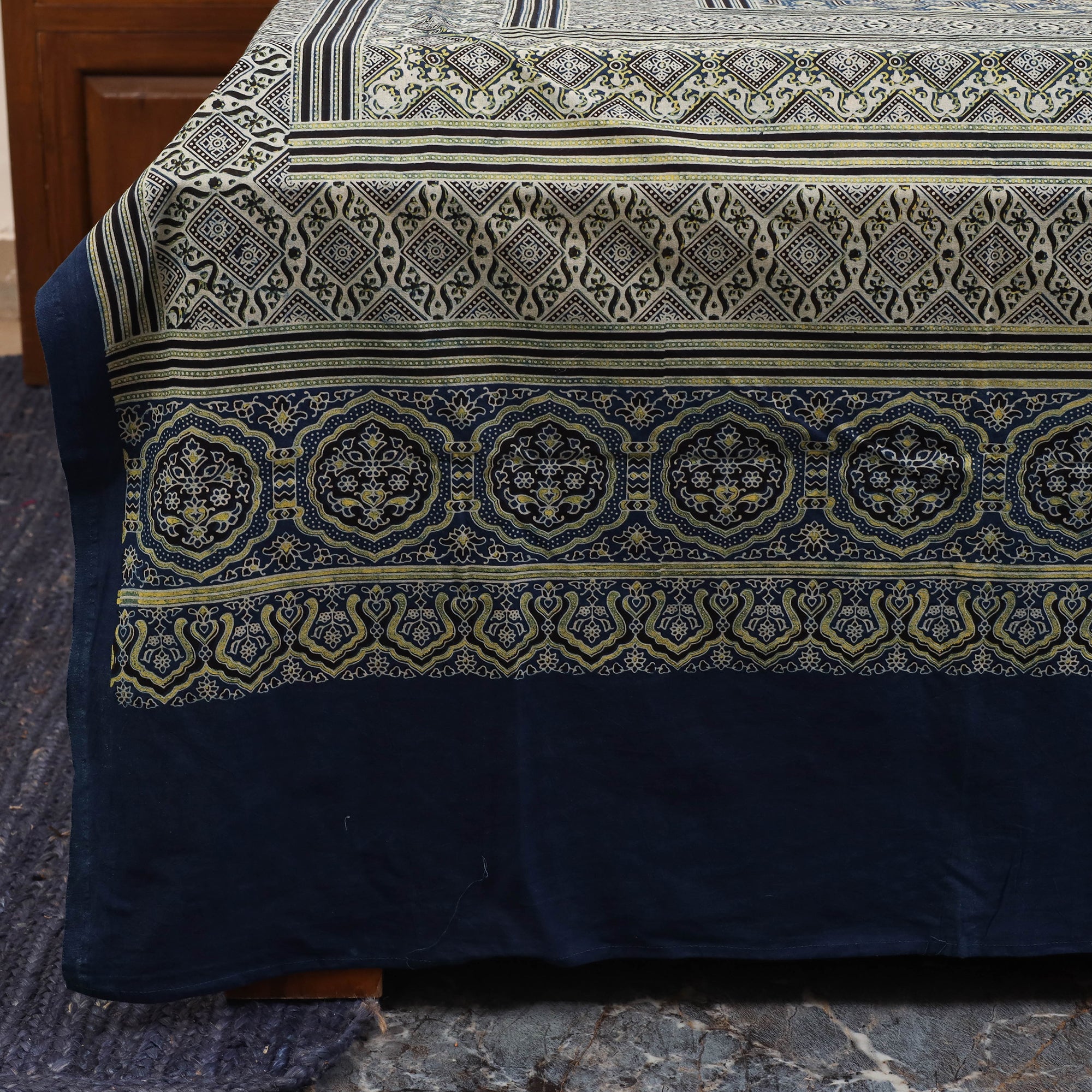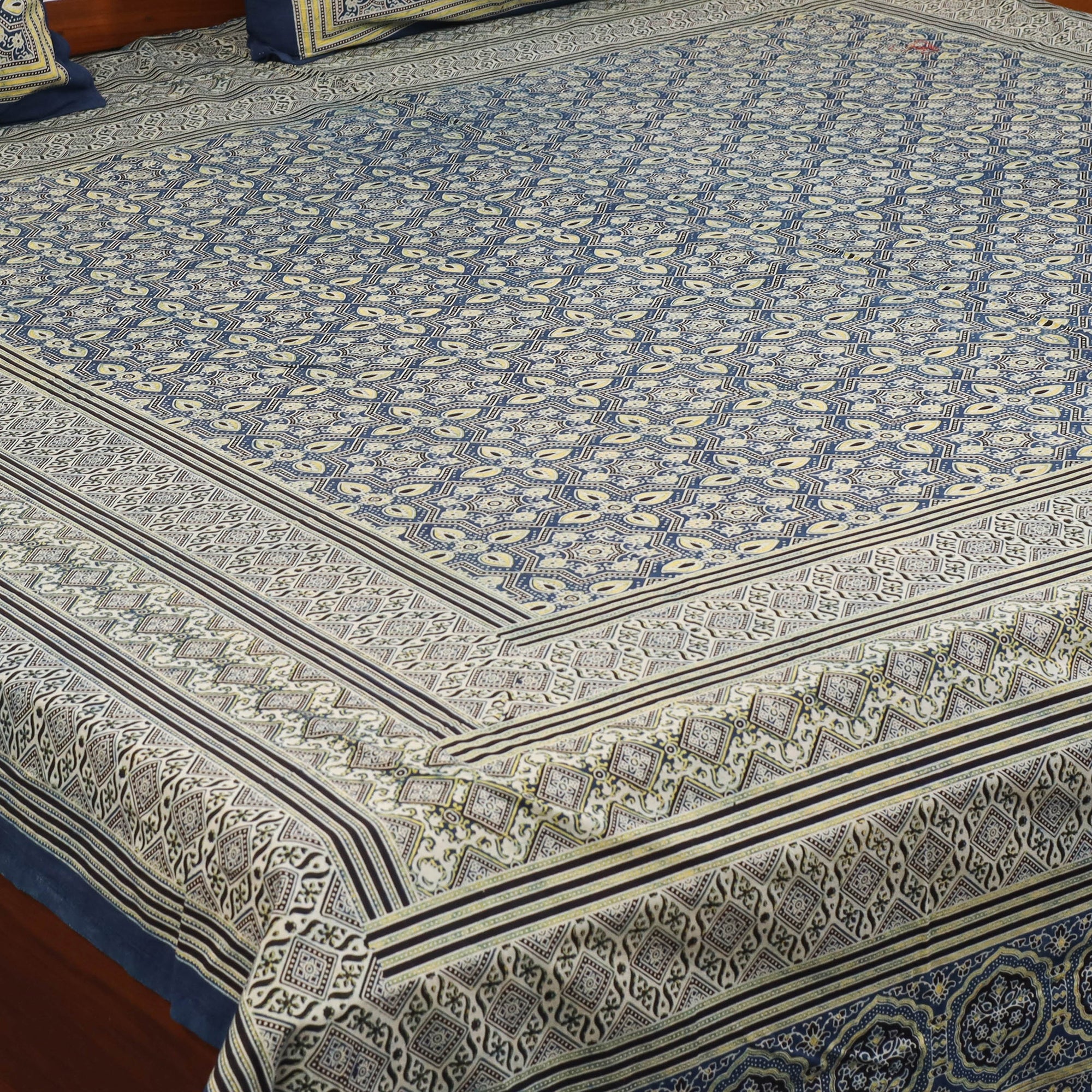 This blue ajrakh block print double bedsheet set is made in Barmer, Rajasthan by skilled artisans. It is crafted using hand block printing with natural dyes. The set includes one double bedsheet and two matching pillow covers. The intricate patterns make it a stylish choice for your bedroom. Simple yet elegant, this set brings comfort and charm to your everyday home decor.