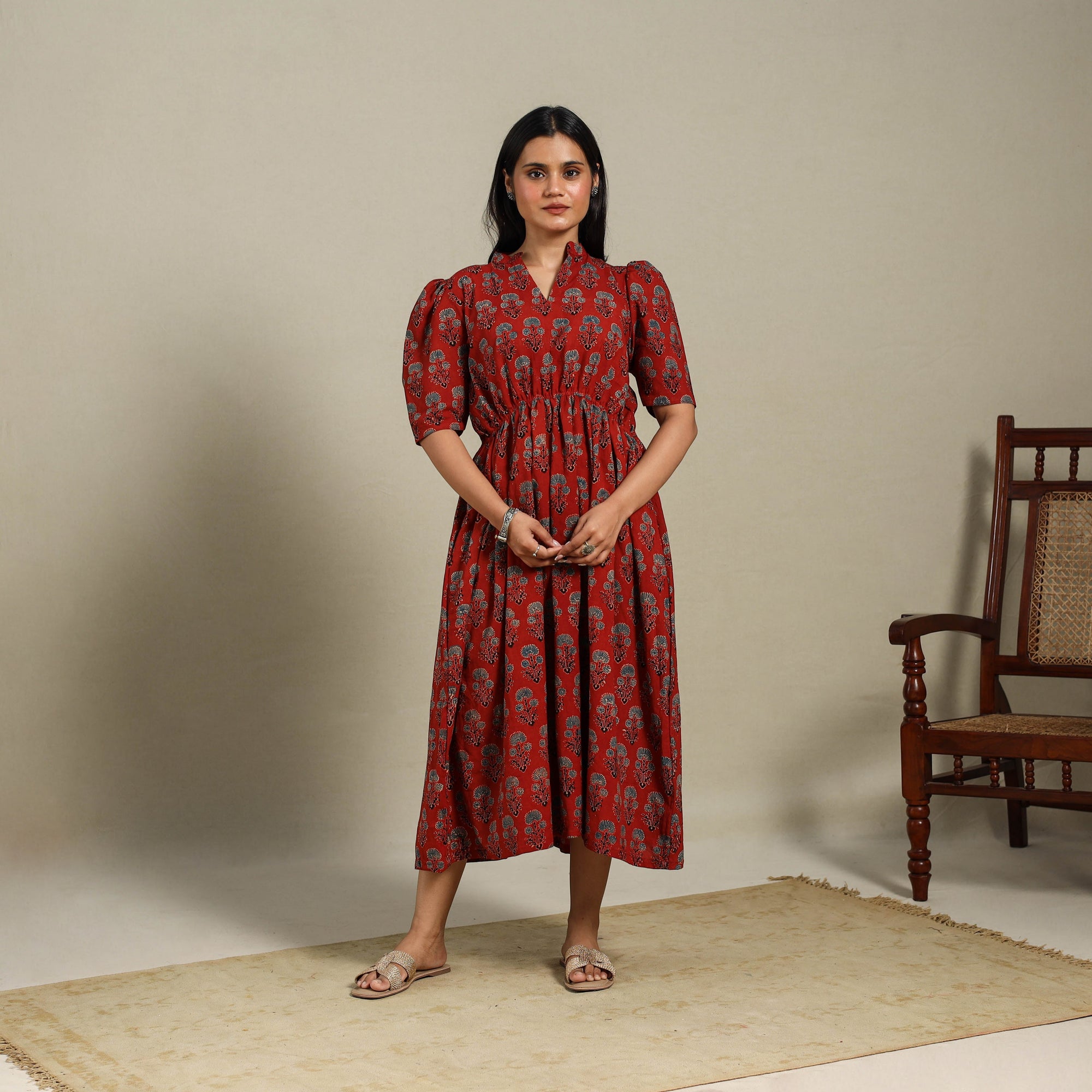 This red ajrakh hand block printed cotton fit & flare dress blends timeless tradition with everyday comfort. Crafted using authentic prints and natural dyes, it feels airy, breathable, and easy to wear all day. Featuring an elasticated waist for a flattering silhouette, it’s ideal for relaxed homewear, casual outings, or thoughtful gifting. A dress that gracefully brings together heritage, comfort, and effortless style.