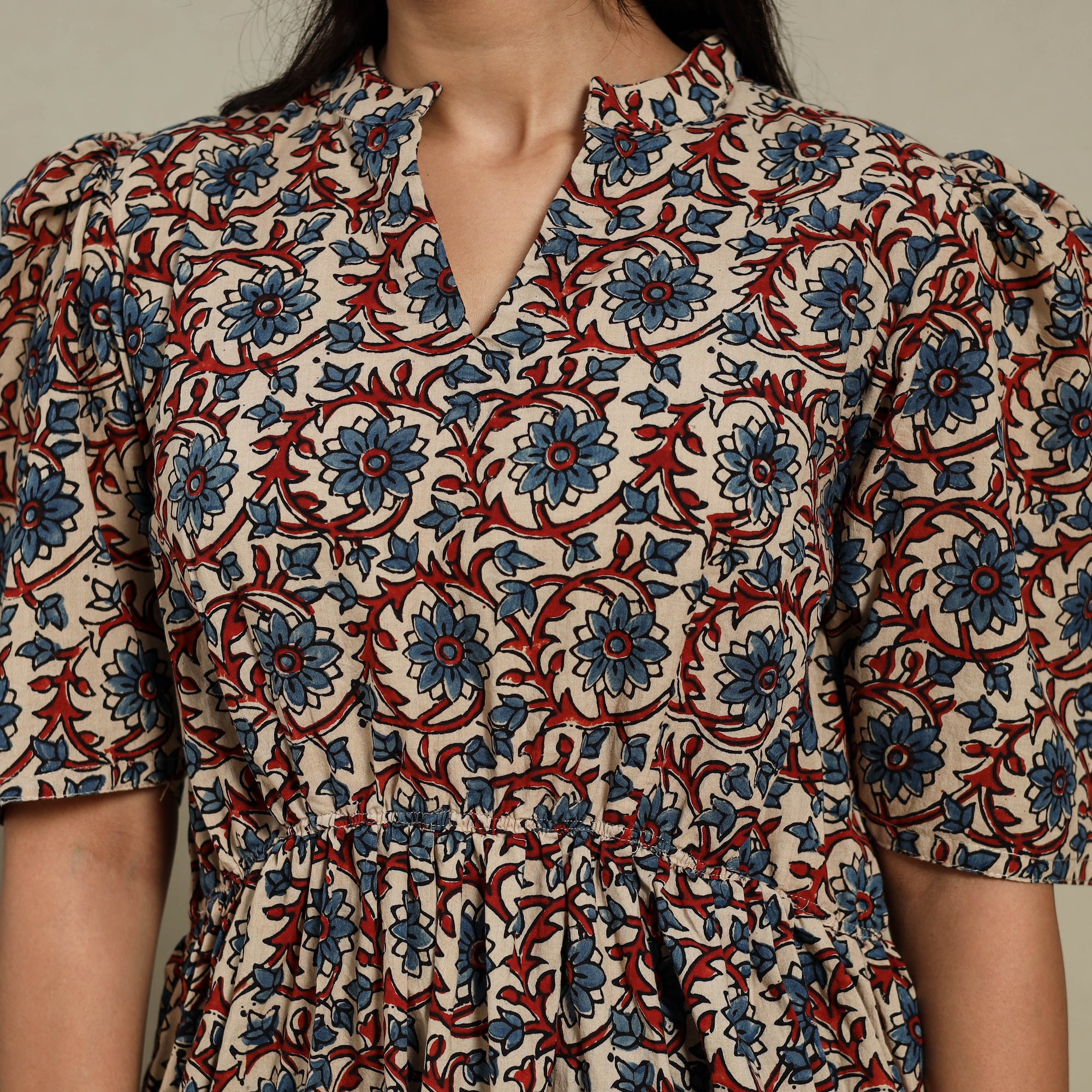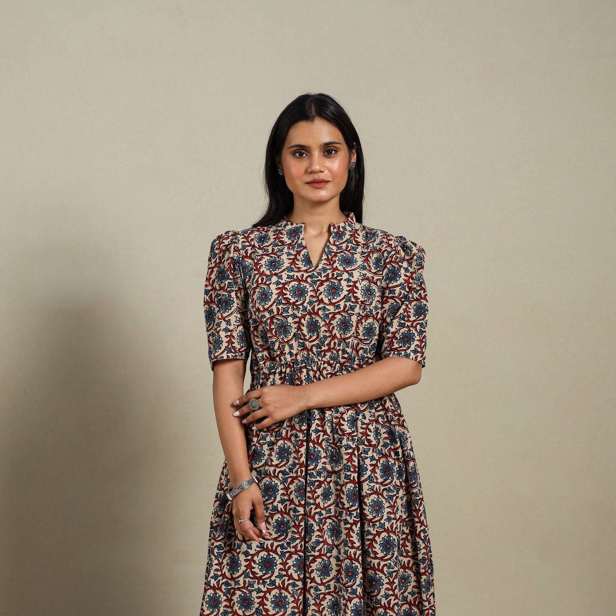 This beige ajrakh hand block printed cotton fit & flare dress blends timeless tradition with everyday comfort. Crafted using authentic prints and natural dyes, it feels airy, breathable, and easy to wear all day. Featuring an elasticated waist for a flattering silhouette, it’s ideal for relaxed homewear, casual outings, or thoughtful gifting. A dress that gracefully brings together heritage, comfort, and effortless style.