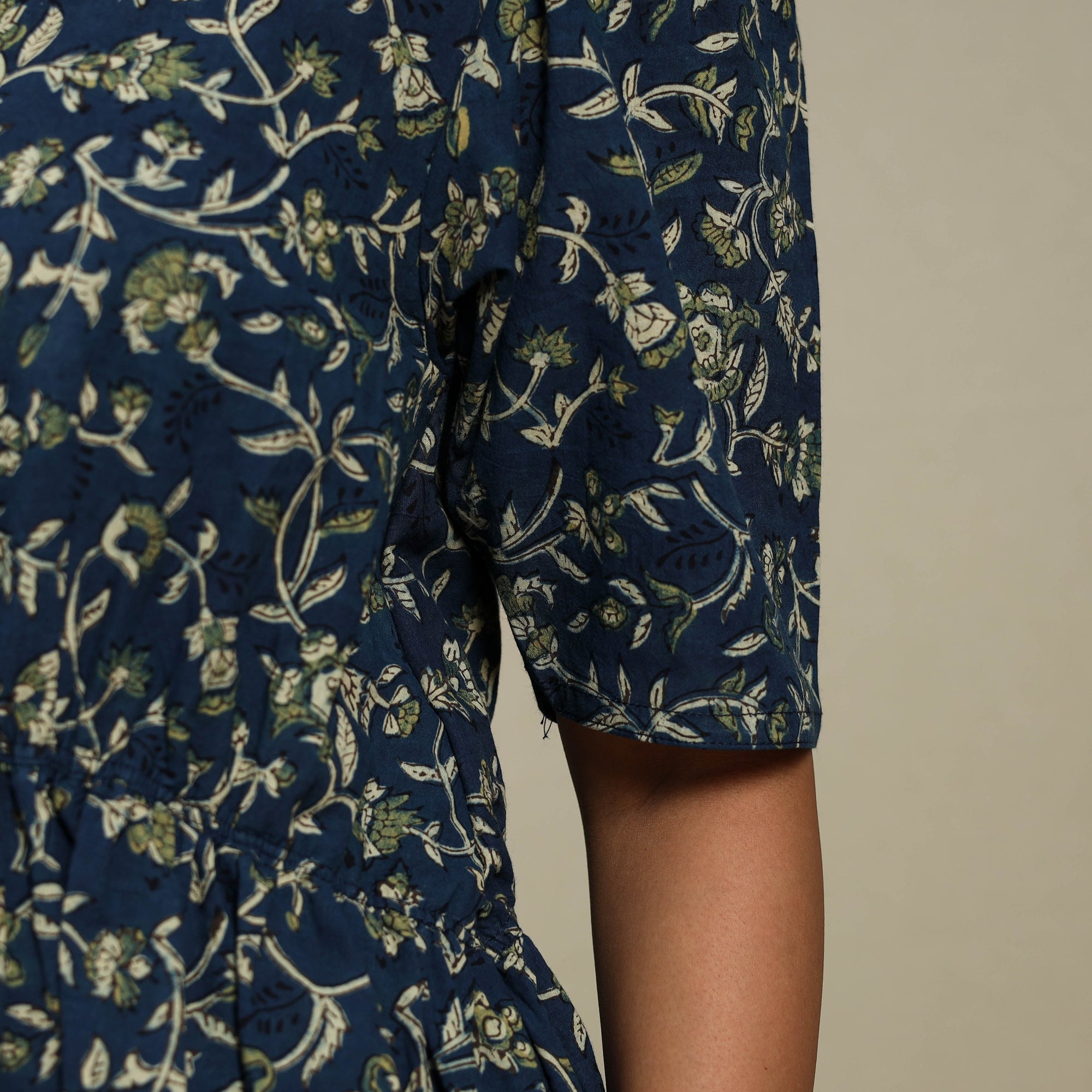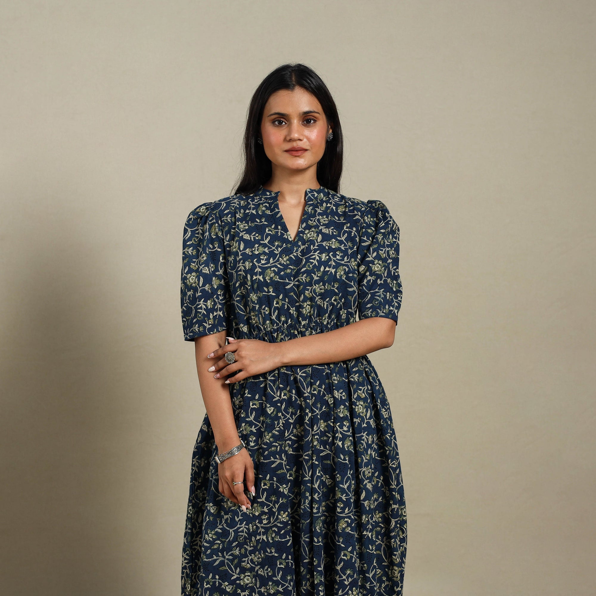 This blue ajrakh hand block printed cotton fit & flare dress blends timeless tradition with everyday comfort. Crafted using authentic prints and natural dyes, it feels airy, breathable, and easy to wear all day. Featuring an elasticated waist for a flattering silhouette, it’s ideal for relaxed homewear, casual outings, or thoughtful gifting. A dress that gracefully brings together heritage, comfort, and effortless style.