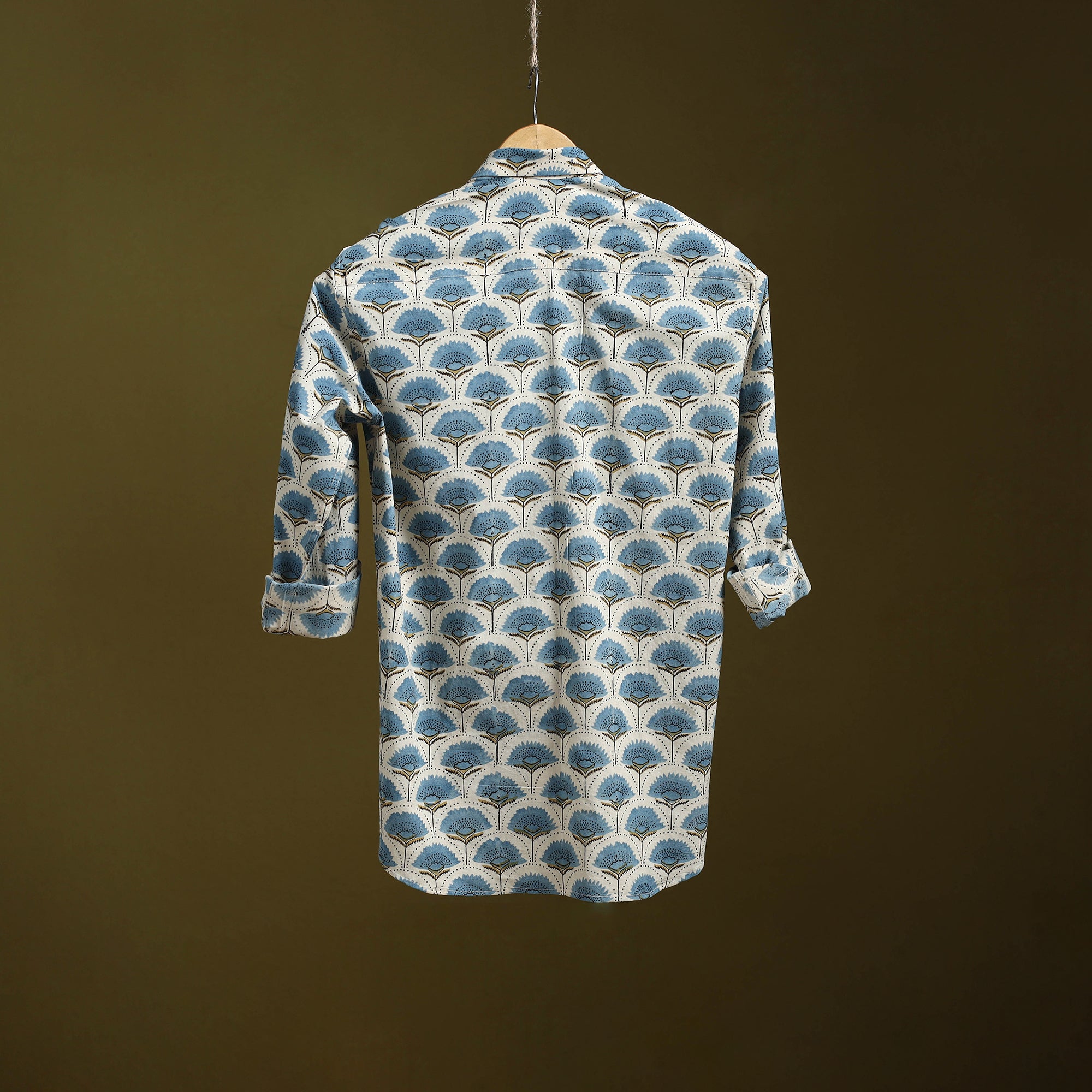 Embrace comfort and style with this white naturally dyed cotton men's ajrakh print shirt. Crafted using traditional block printing techniques, it features a full-sleeve, wooden buttons, and a practical patch pocket, making it the perfect addition to your casual wardrobe.