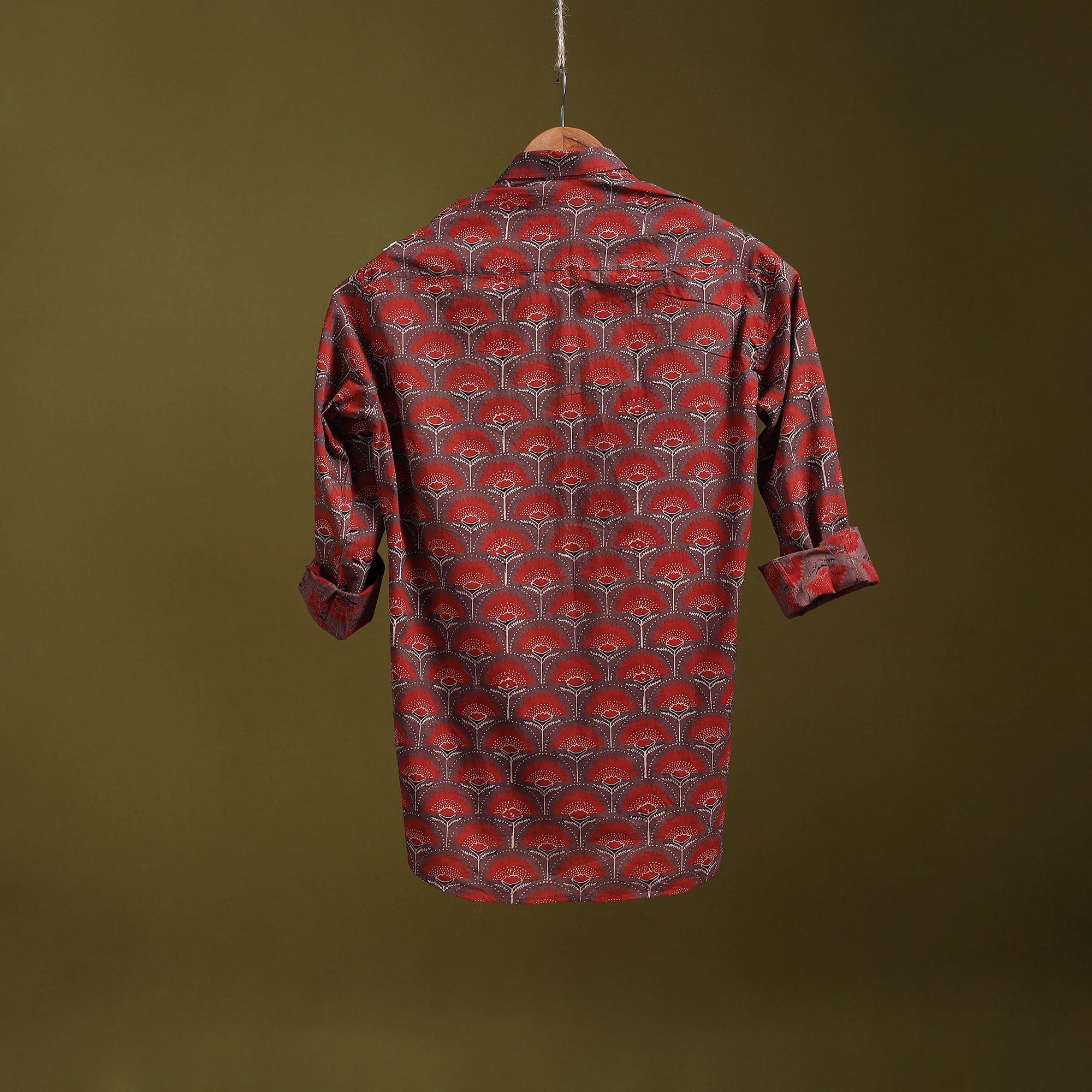 Embrace comfort and style with this red naturally dyed cotton men's ajrakh print shirt. Crafted using traditional block printing techniques, it features a full-sleeve, wooden buttons, and a practical patch pocket, making it the perfect addition to your casual wardrobe.