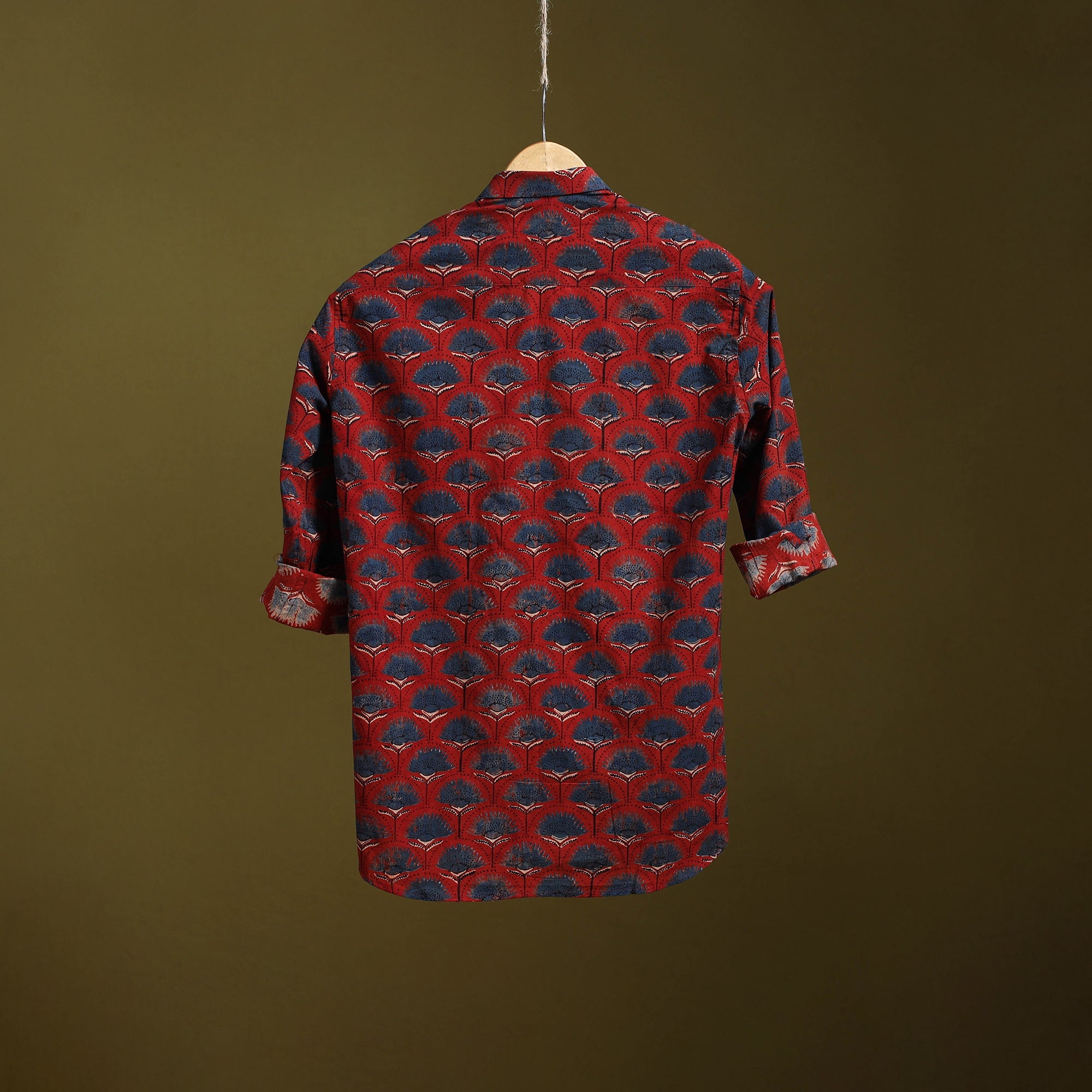 Embrace comfort and style with this naturally dyed cotton men's ajrakh print shirt. Crafted using traditional block printing techniques, it features a full-sleeve, wooden buttons, and a practical patch pocket, making it the perfect addition to your casual wardrobe.