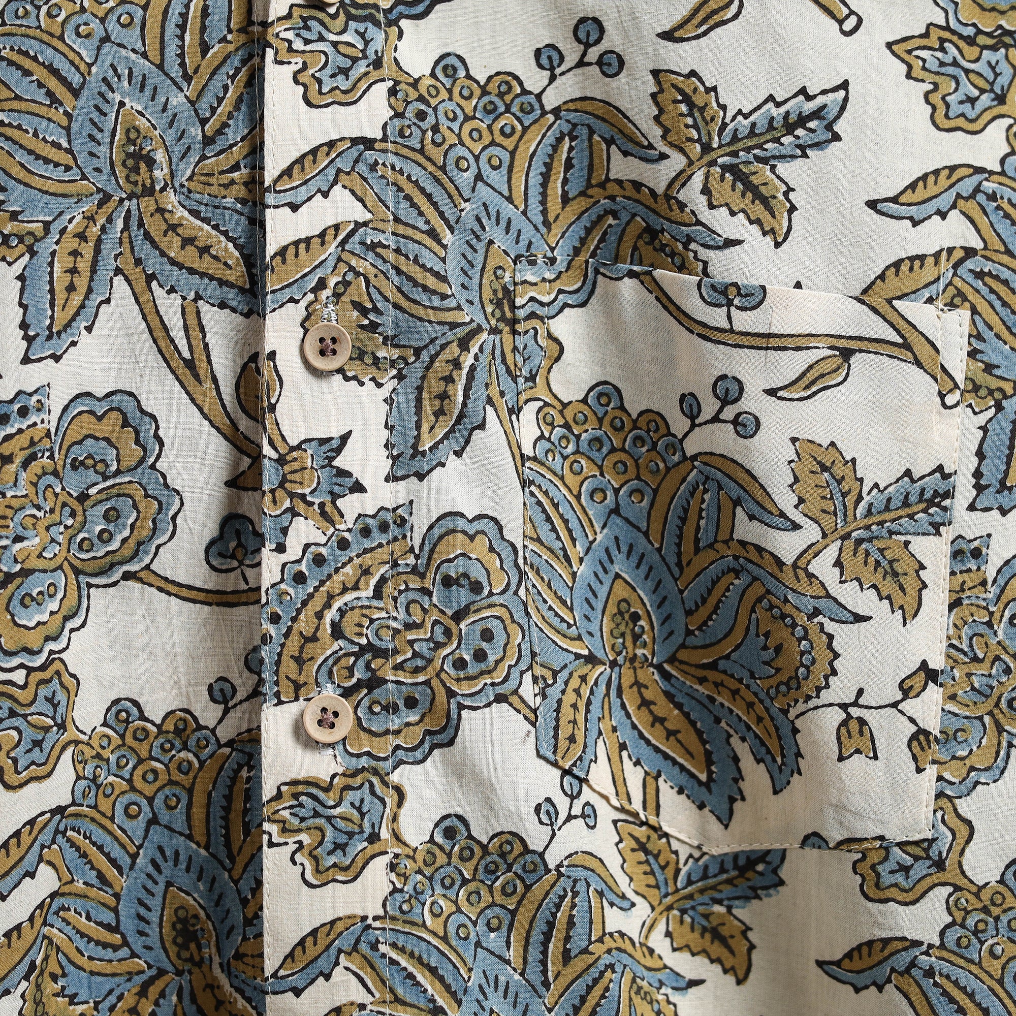 Embrace comfort and style with this white naturally dyed cotton men's ajrakh print shirt. Crafted using traditional block printing techniques, it features a full-sleeve, wooden buttons, and a practical patch pocket, making it the perfect addition to your casual wardrobe.