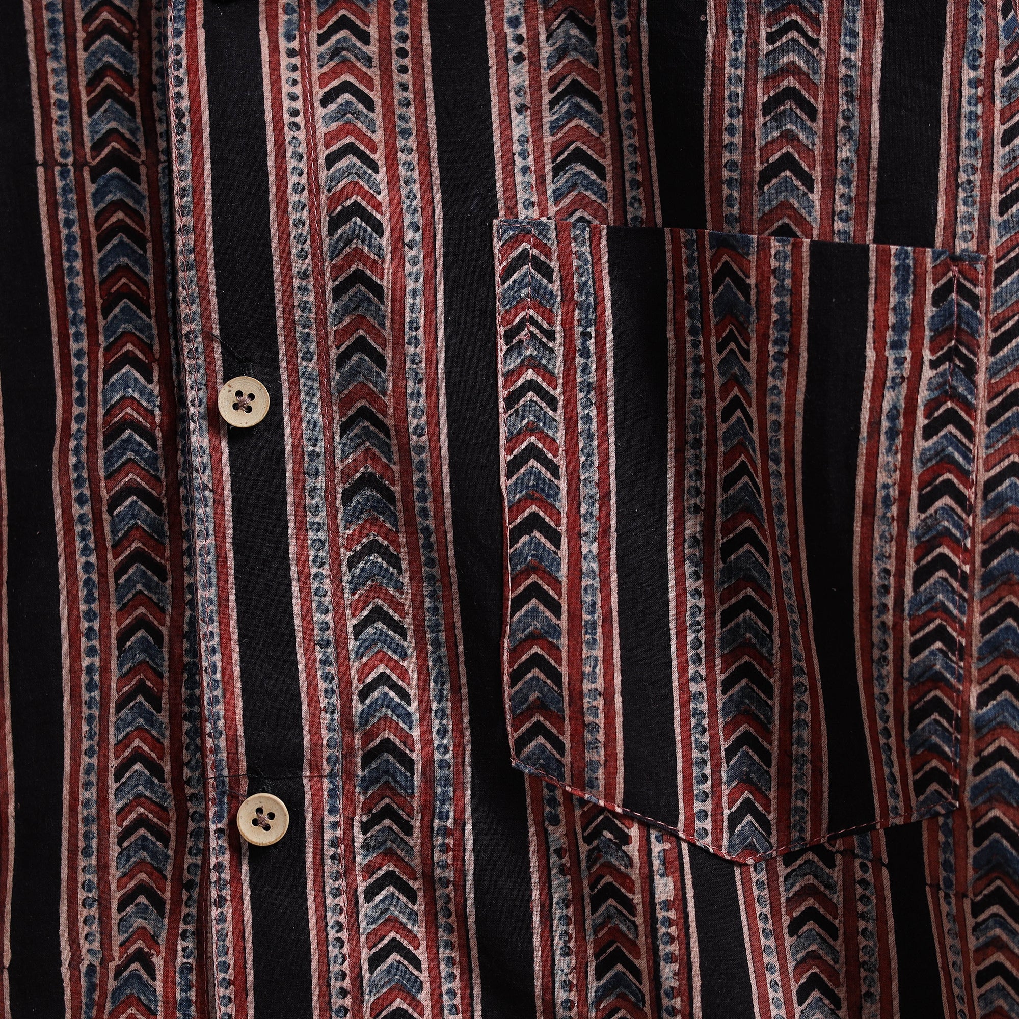 Embrace comfort and style with this brown naturally dyed cotton men's ajrakh print shirt. Crafted using traditional block printing techniques, it features a full-sleeve, wooden buttons, and a practical patch pocket, making it the perfect addition to your casual wardrobe.