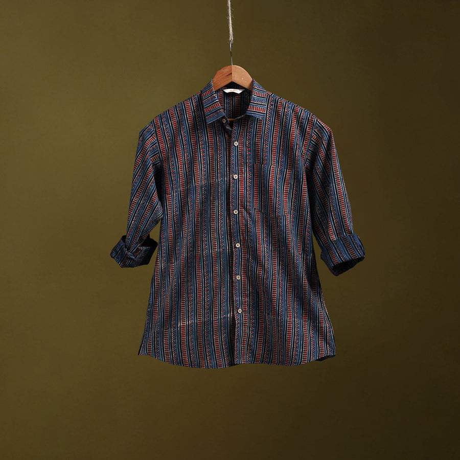 Embrace comfort and style with this blue naturally dyed cotton men's ajrakh print shirt. Crafted using traditional block printing techniques, it features a full-sleeve, wooden buttons, and a practical patch pocket, making it the perfect addition to your casual wardrobe.