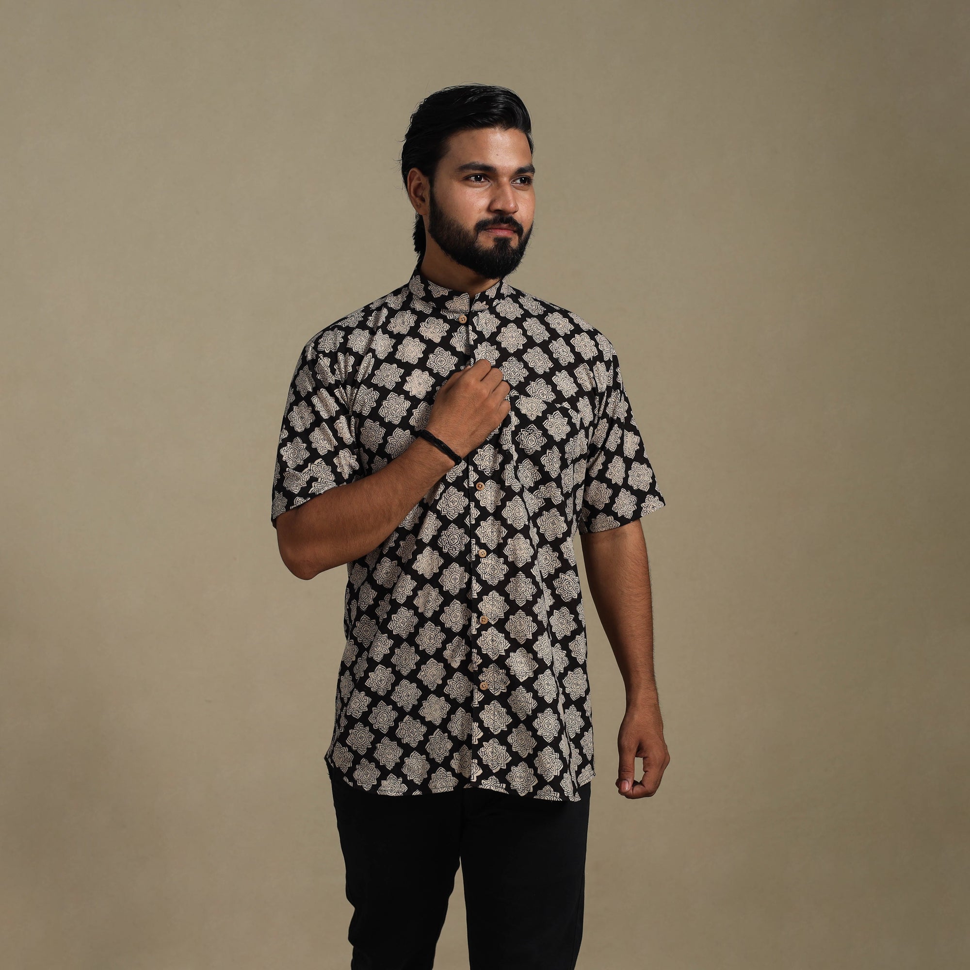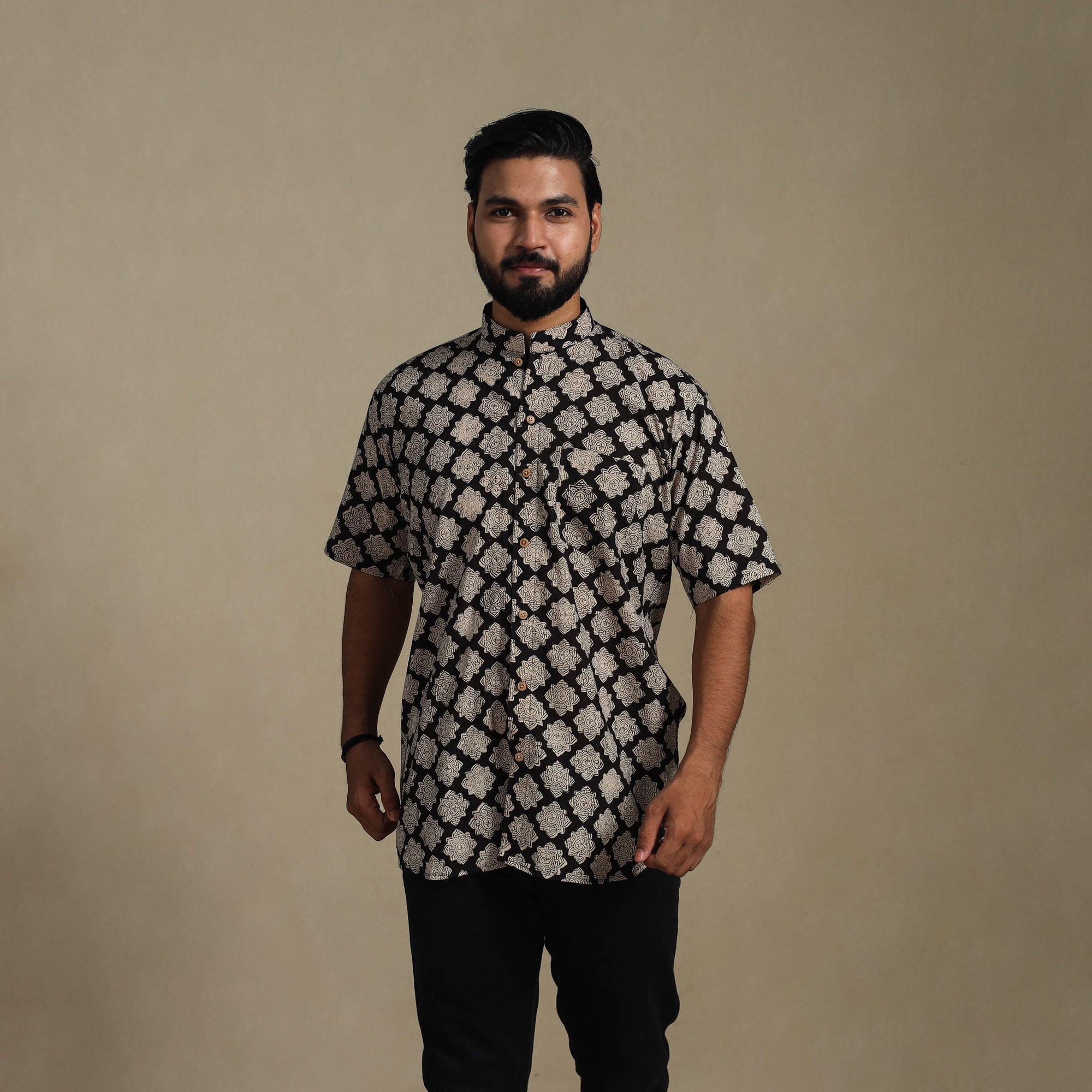 Made using the age-old bagru block printing technique from Rajasthan, this balck naturally dyed cotton shirt blends tradition with everyday ease. Designed with a regular collar, half sleeves, and a functional front pocket, it’s perfect for casual wear. Wooden buttons add a natural touch to its appeal. A thoughtful pick for those who appreciate handmade charm and Indian craftsmanship.
