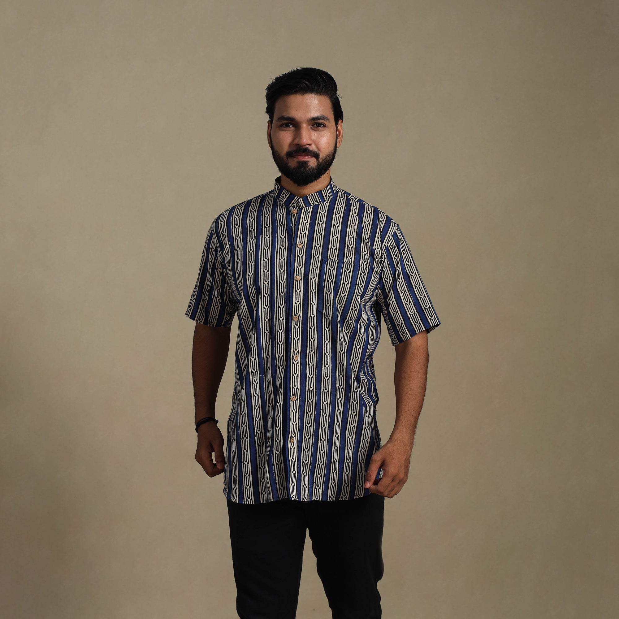 | Material | Made using the age-old bagru block printing technique from Rajasthan, this blue naturally dyed cotton shirt blends tradition with everyday ease. Designed with a regular collar, half sleeves, and a functional front pocket, it’s perfect for casual wear. Wooden buttons add a natural touch to its appeal. A thoughtful pick for those who appreciate handmade charm and Indian craftsmanship. A Note on Handmade Beauty : |