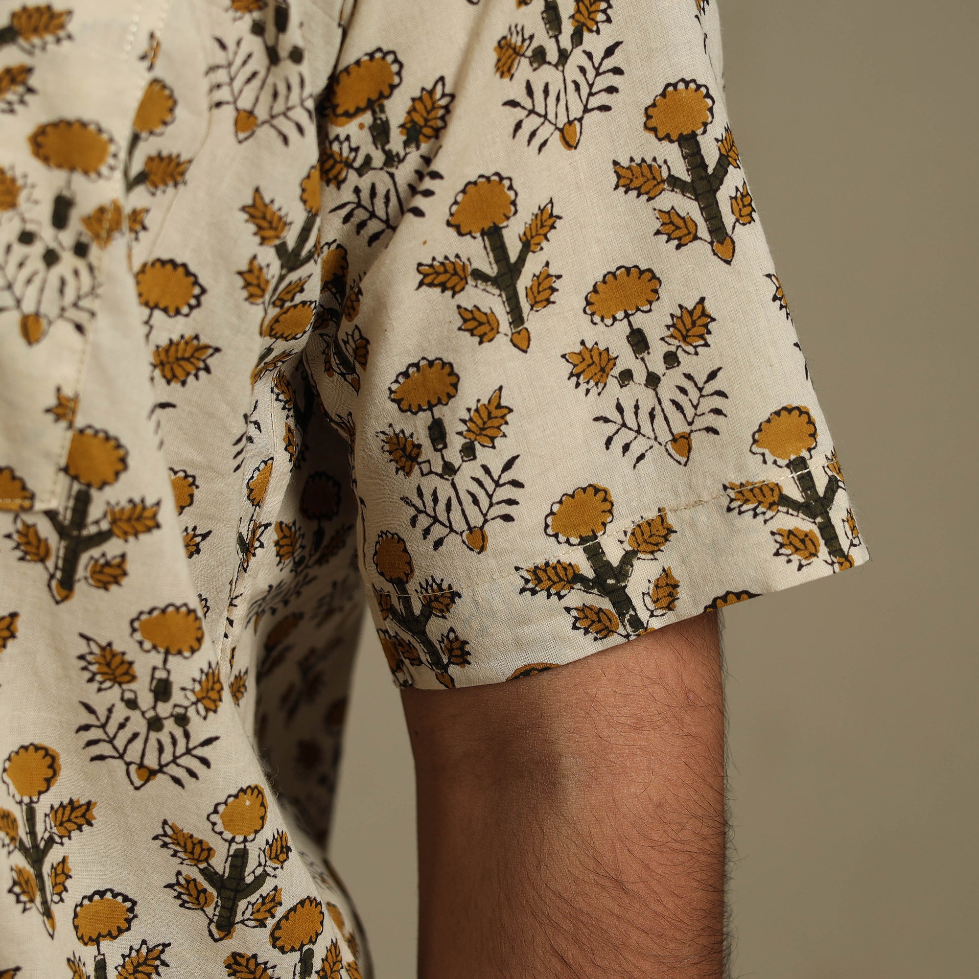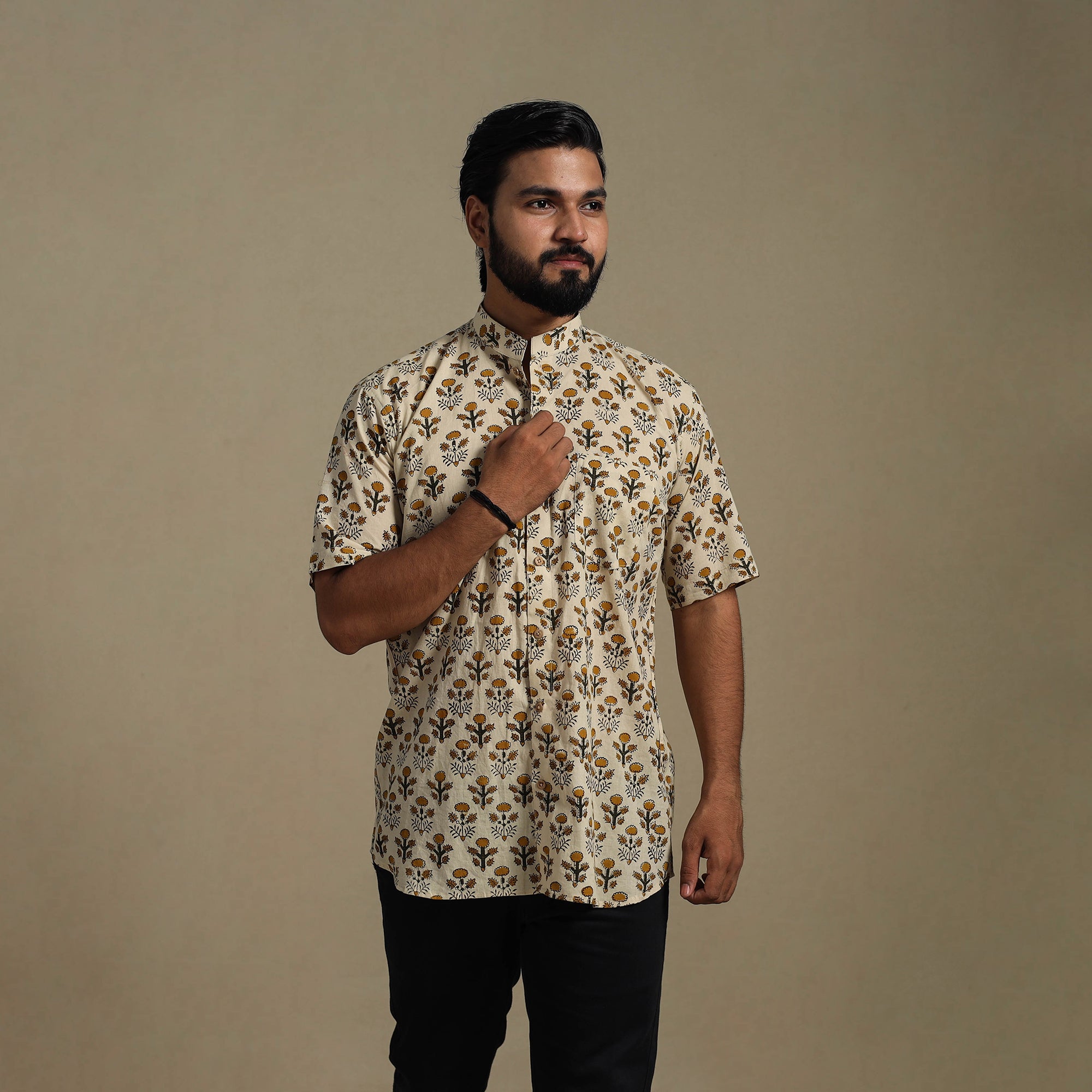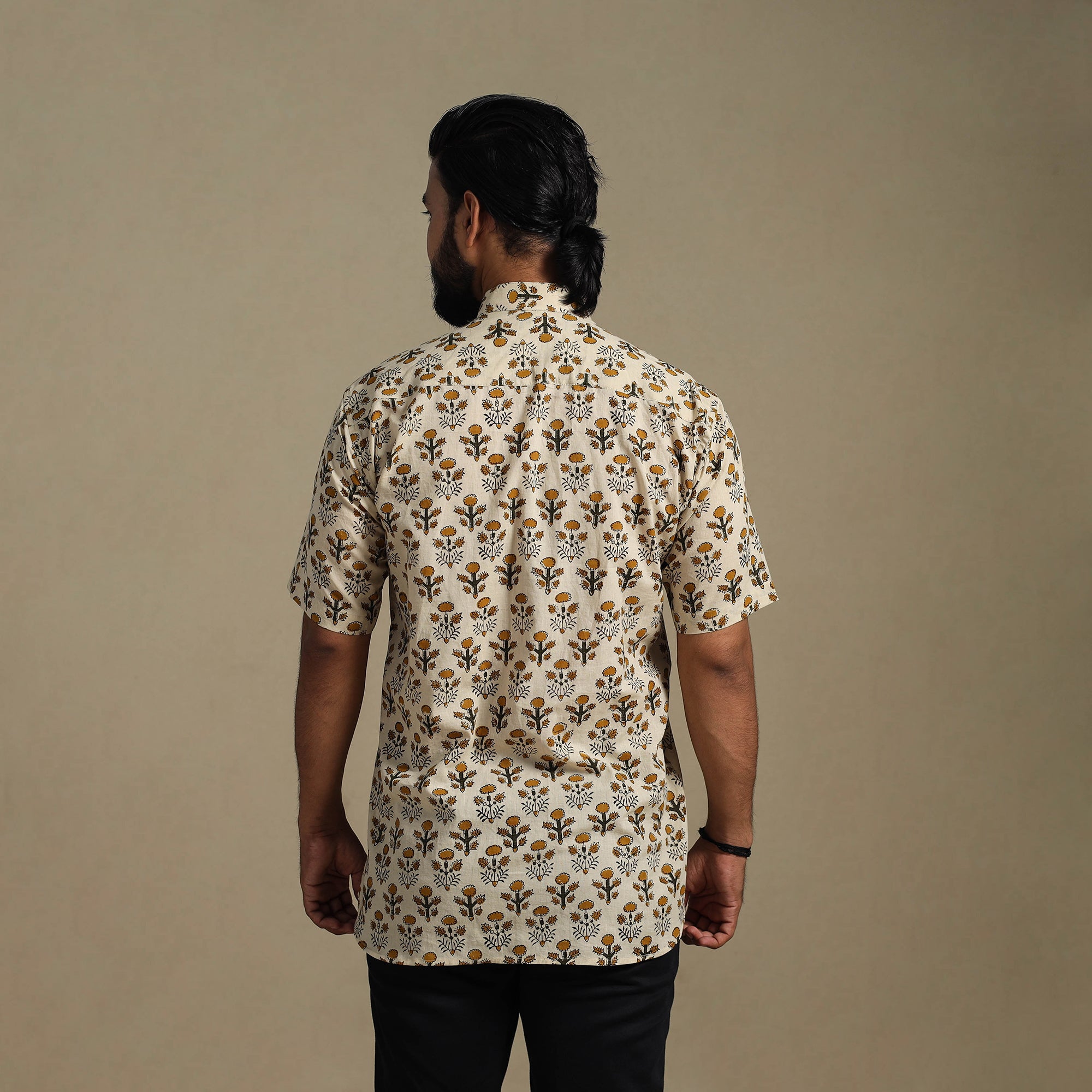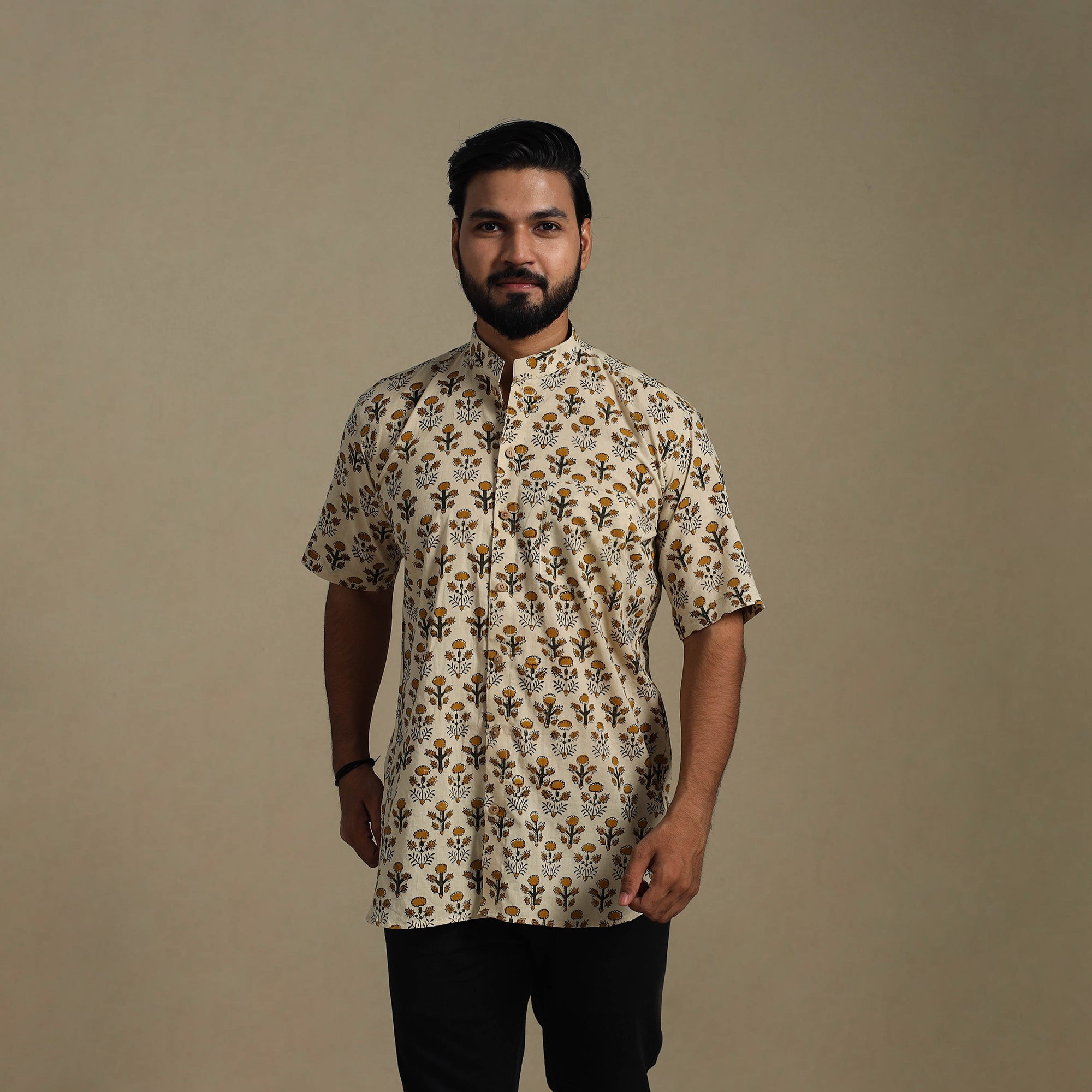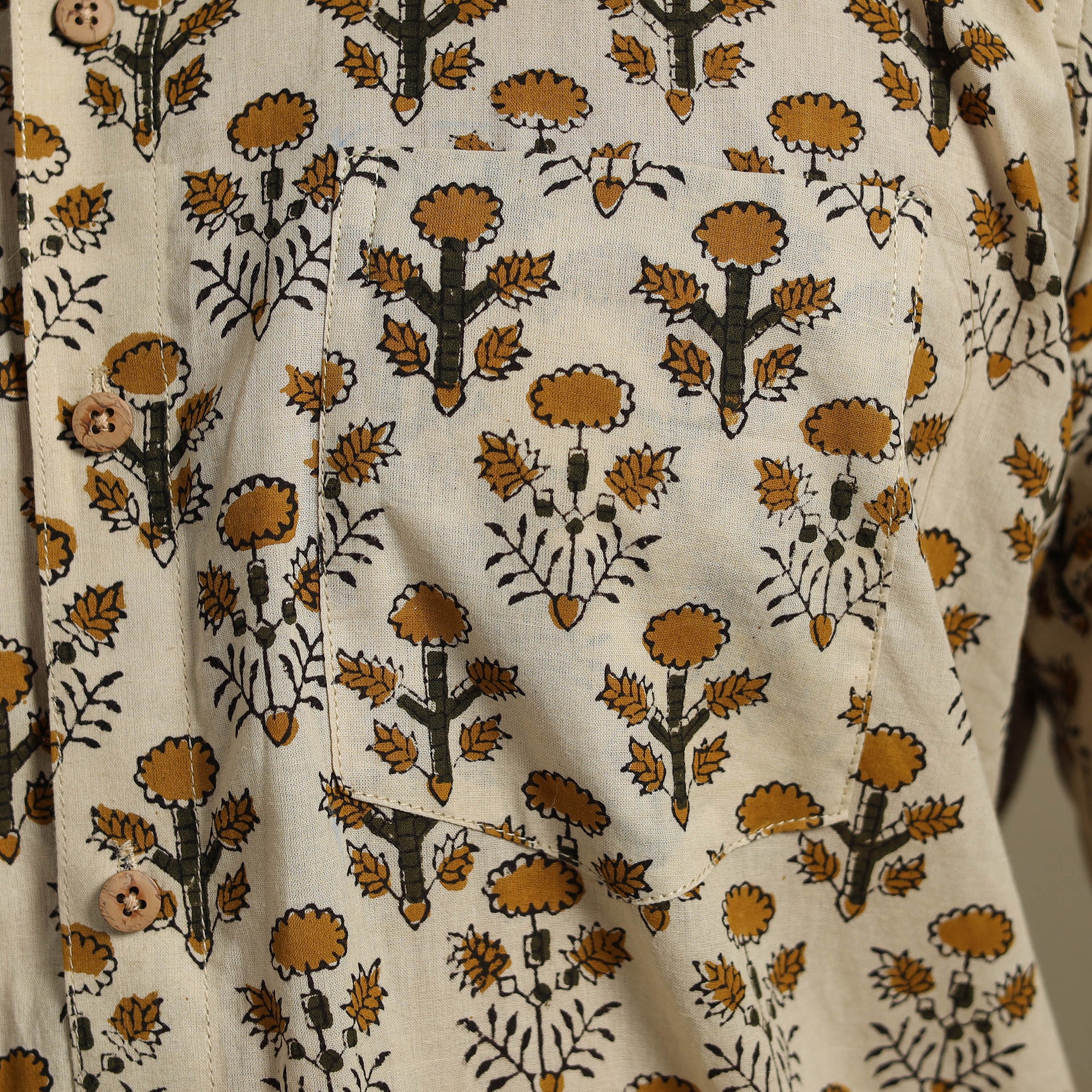Made using the age-old bagru block printing technique from Rajasthan, this beige naturally dyed cotton shirt blends tradition with everyday ease. Designed with a regular collar, half sleeves, and a functional front pocket, it’s perfect for casual wear. Wooden buttons add a natural touch to its appeal. A thoughtful pick for those who appreciate handmade charm and Indian craftsmanship.