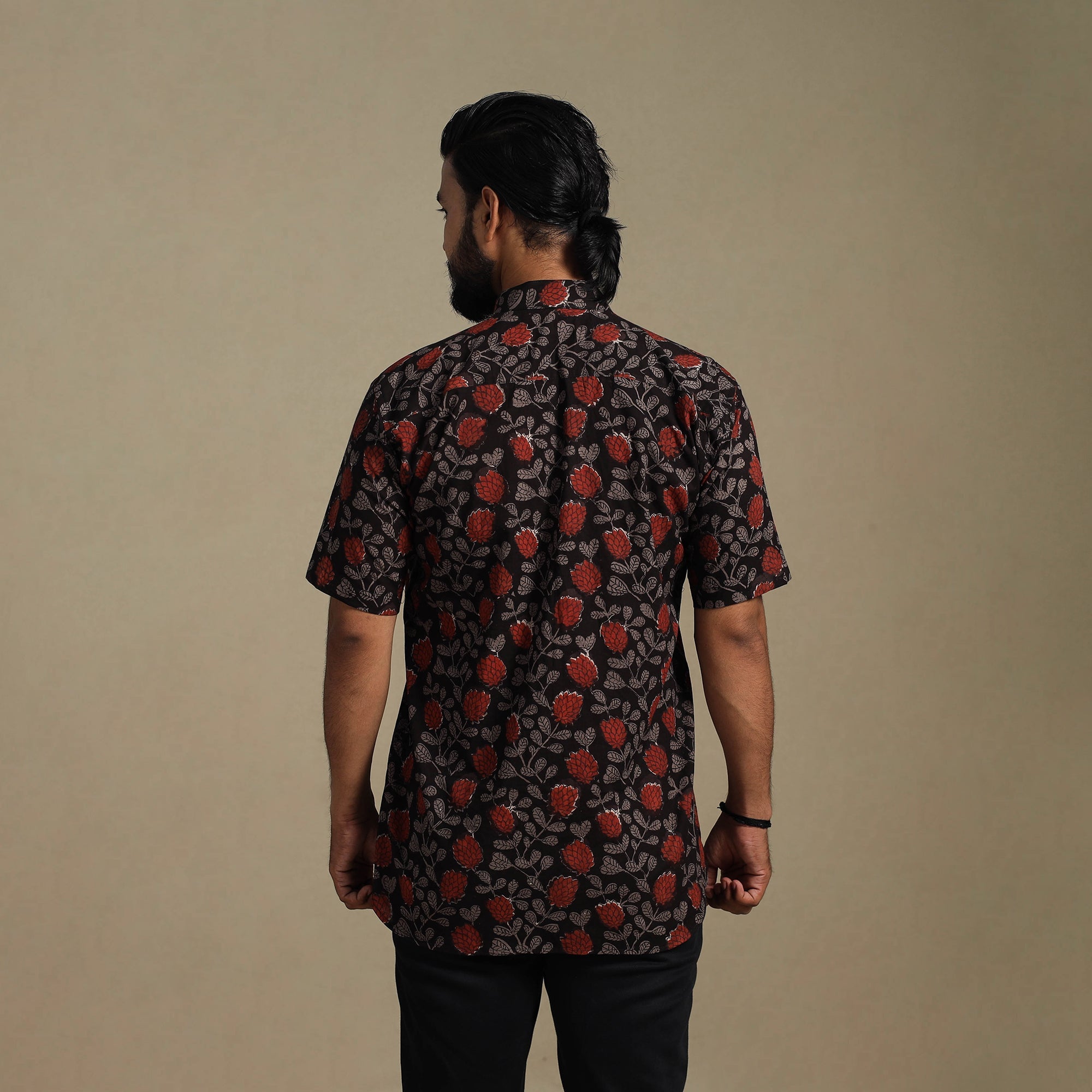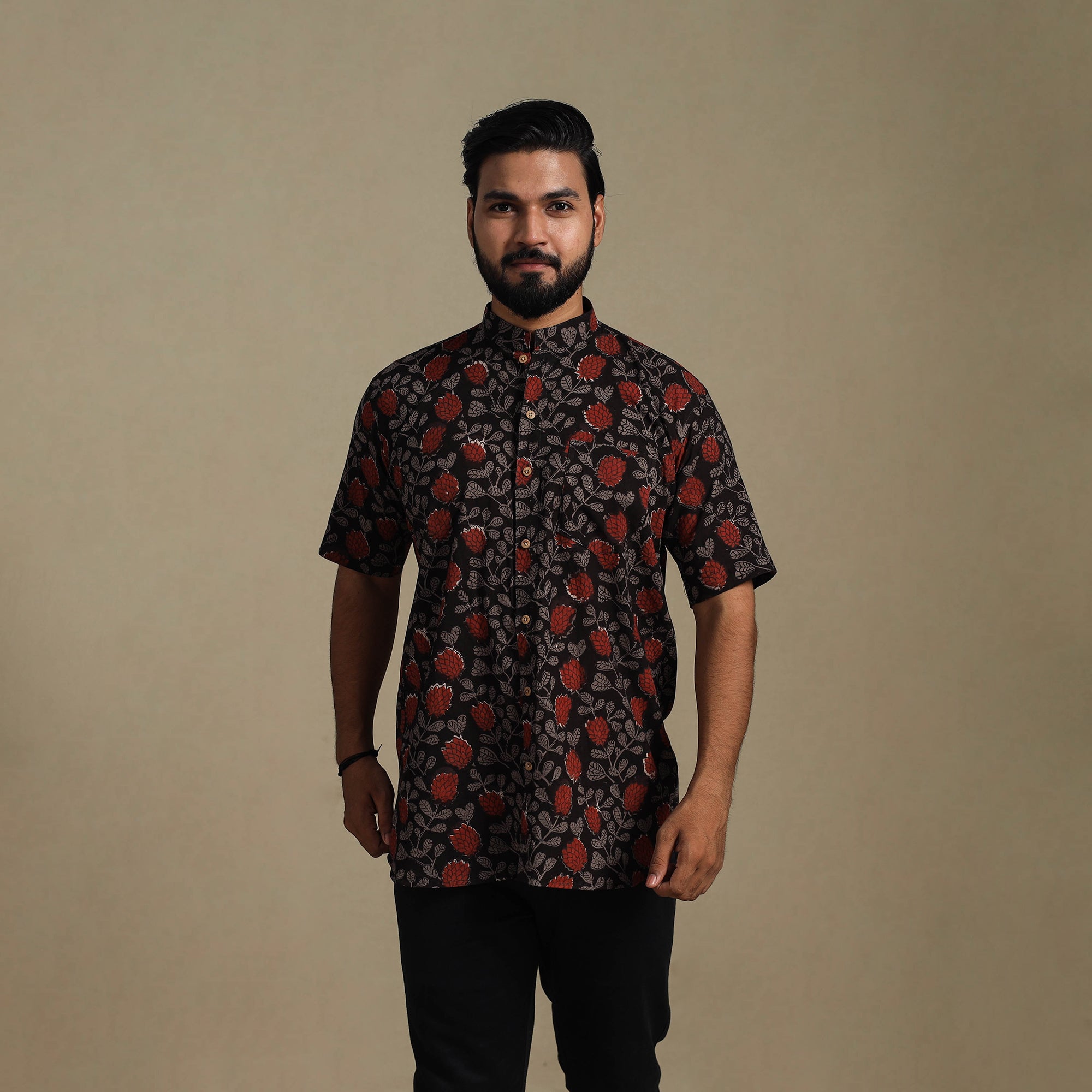 Made using the age-old bagru block printing technique from Rajasthan, this black naturally dyed cotton shirt blends tradition with everyday ease. Designed with a regular collar, half sleeves, and a functional front pocket, it’s perfect for casual wear. Wooden buttons add a natural touch to its appeal. A thoughtful pick for those who appreciate handmade charm and Indian craftsmanship.