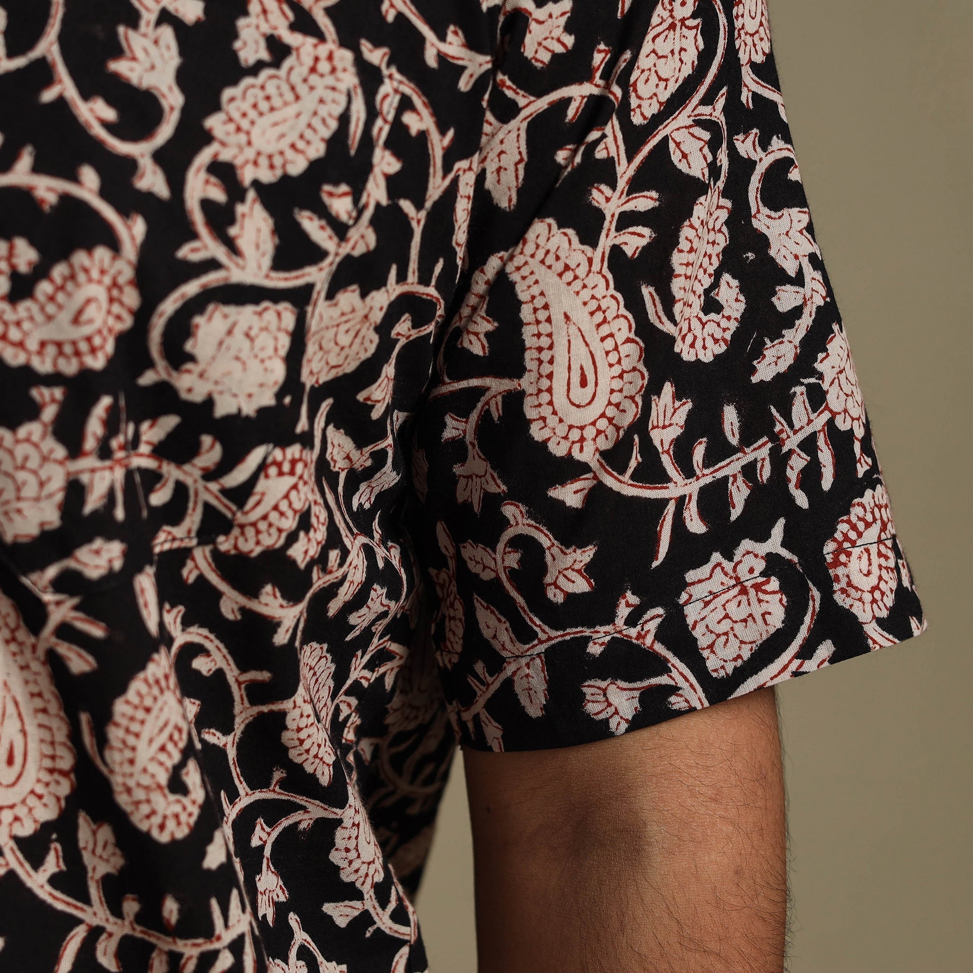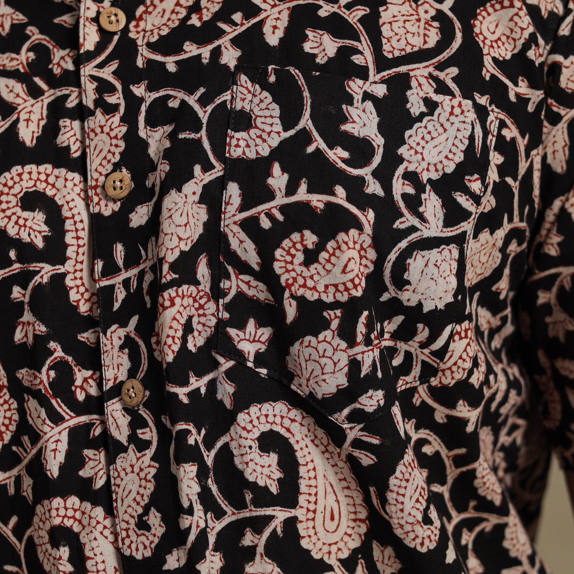 | Material | Made using the age-old bagru block printing technique from Rajasthan, this black naturally dyed cotton shirt blends tradition with everyday ease. Designed with a regular collar, half sleeves, and a functional front pocket, it’s perfect for casual wear. Wooden buttons add a natural touch to its appeal. A thoughtful pick for those who appreciate handmade charm and Indian craftsmanship. A Note on Handmade Beauty : |