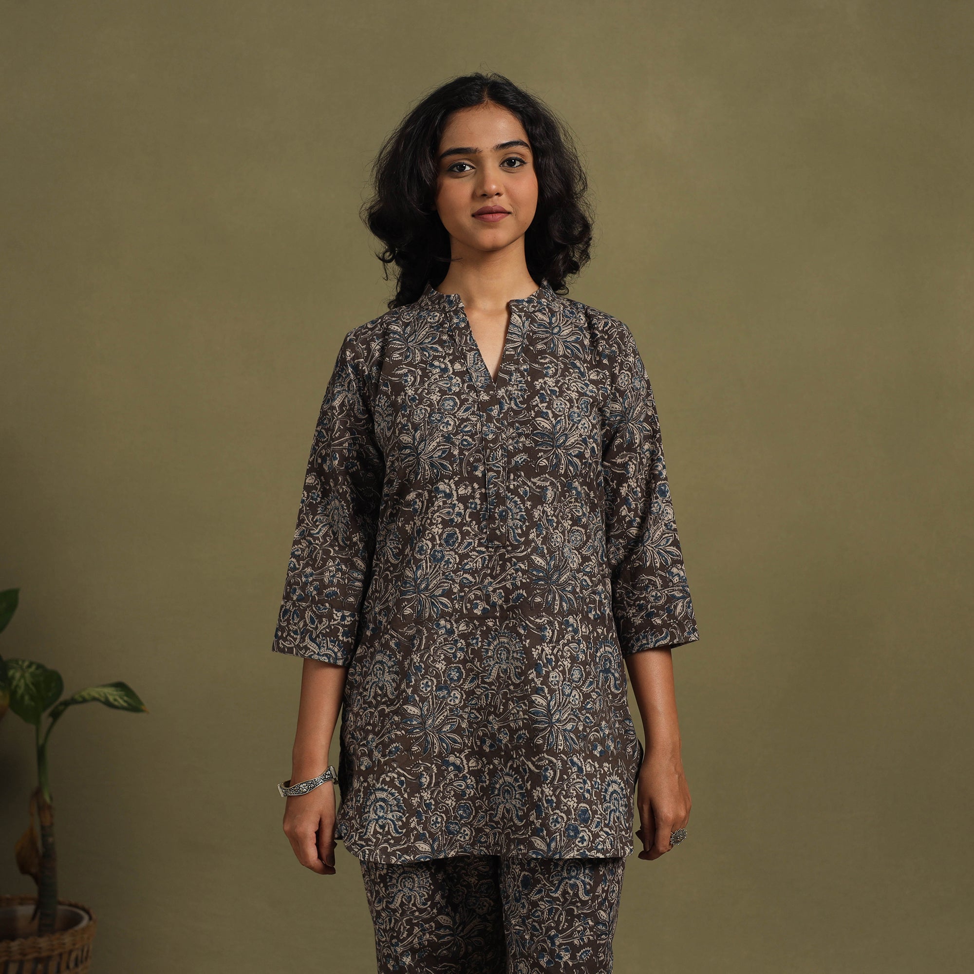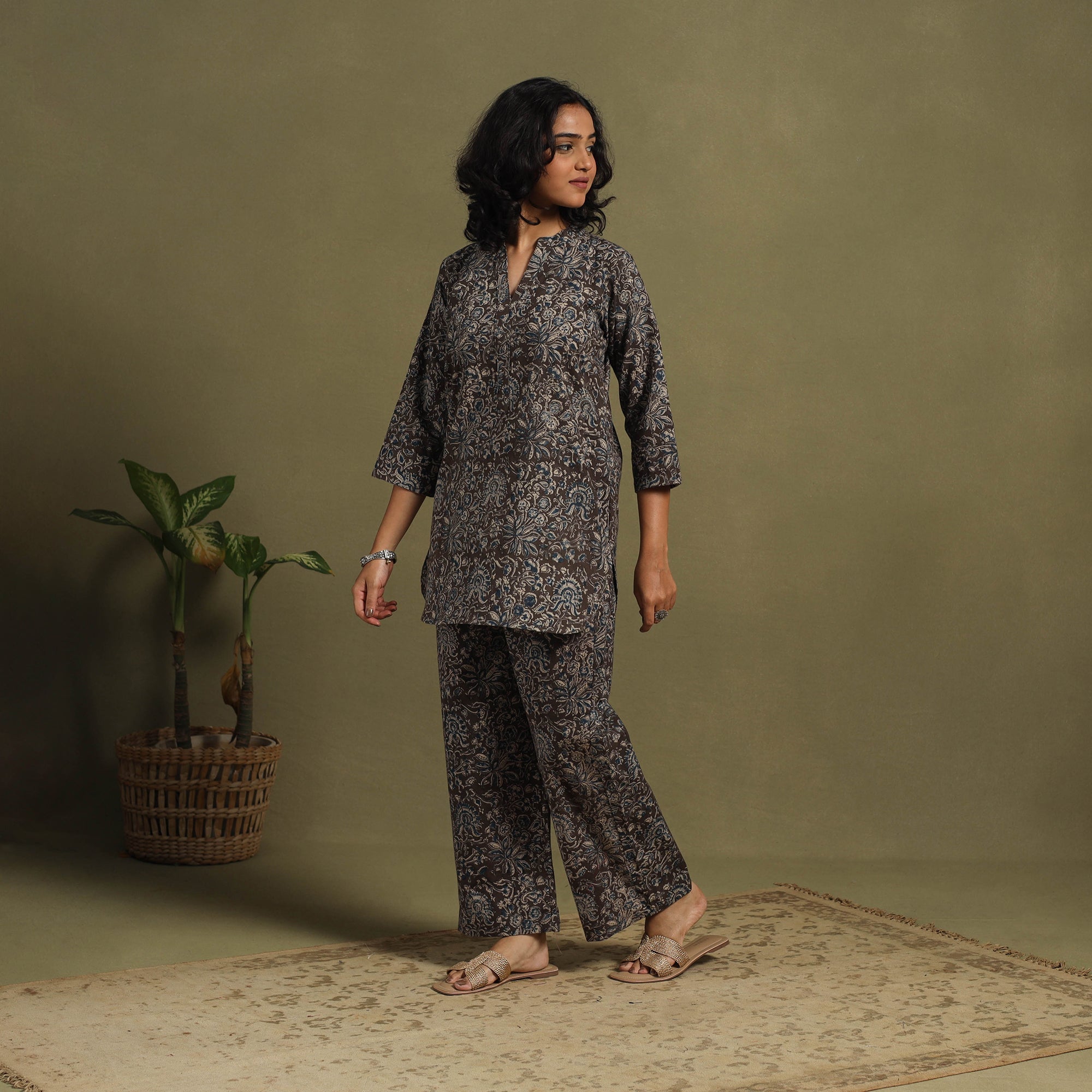 Stay relaxed yet stylish in our black cotton Kalamkari co-ord set, featuring traditional hand block printing from Pedana. Made with naturally dyed, breathable cotton, this coordinated two-piece includes a top and relaxed-fit palazzos with an elasticated waist and two side pockets. A perfect pick for effortless, all-day ease.