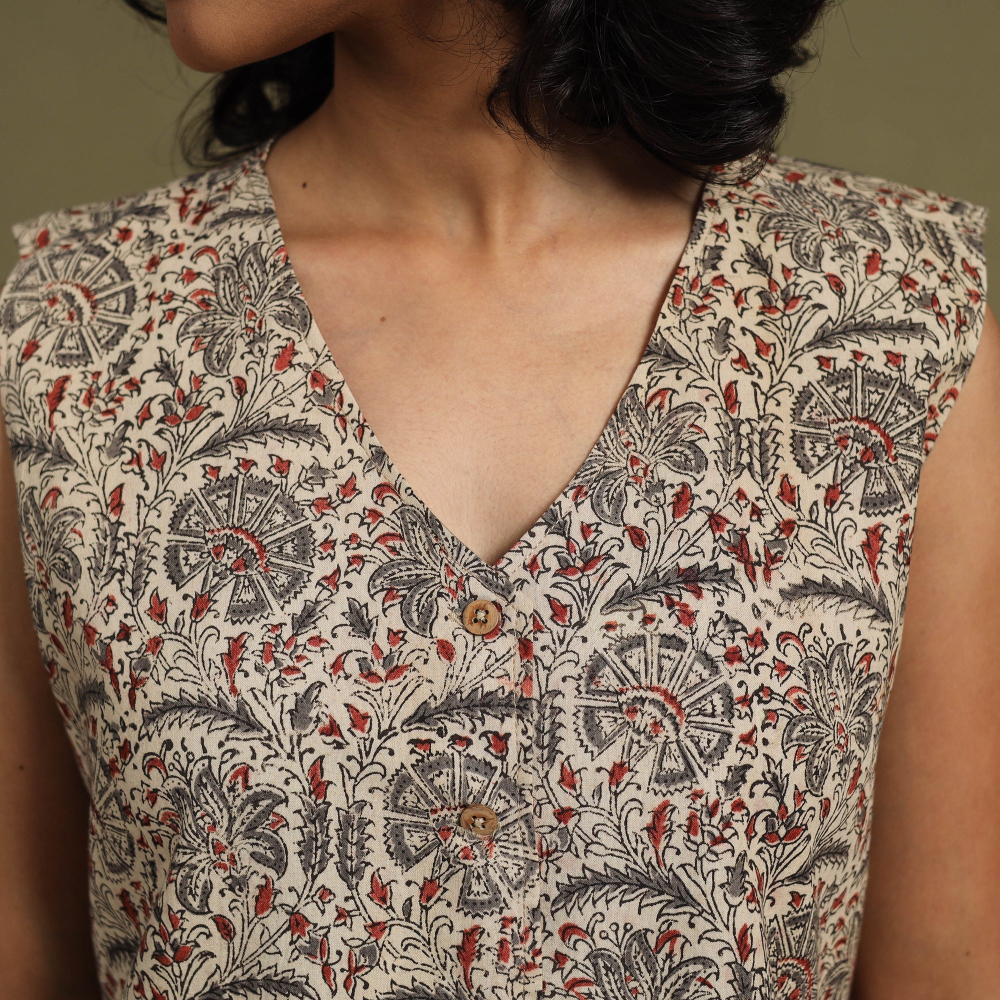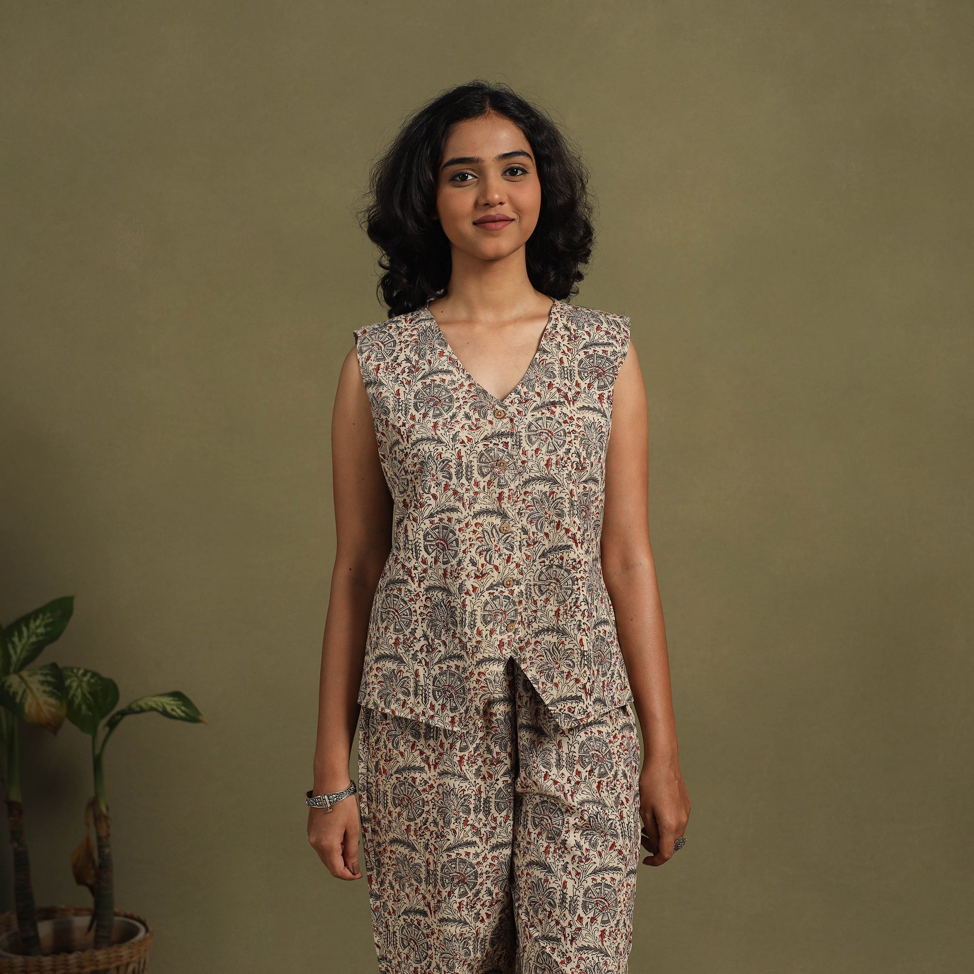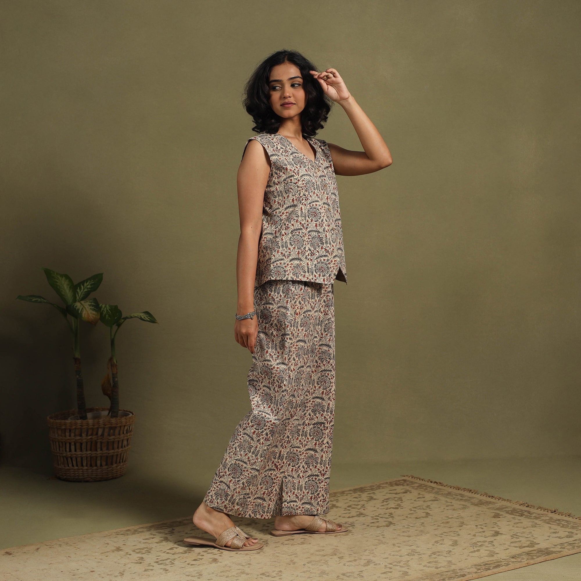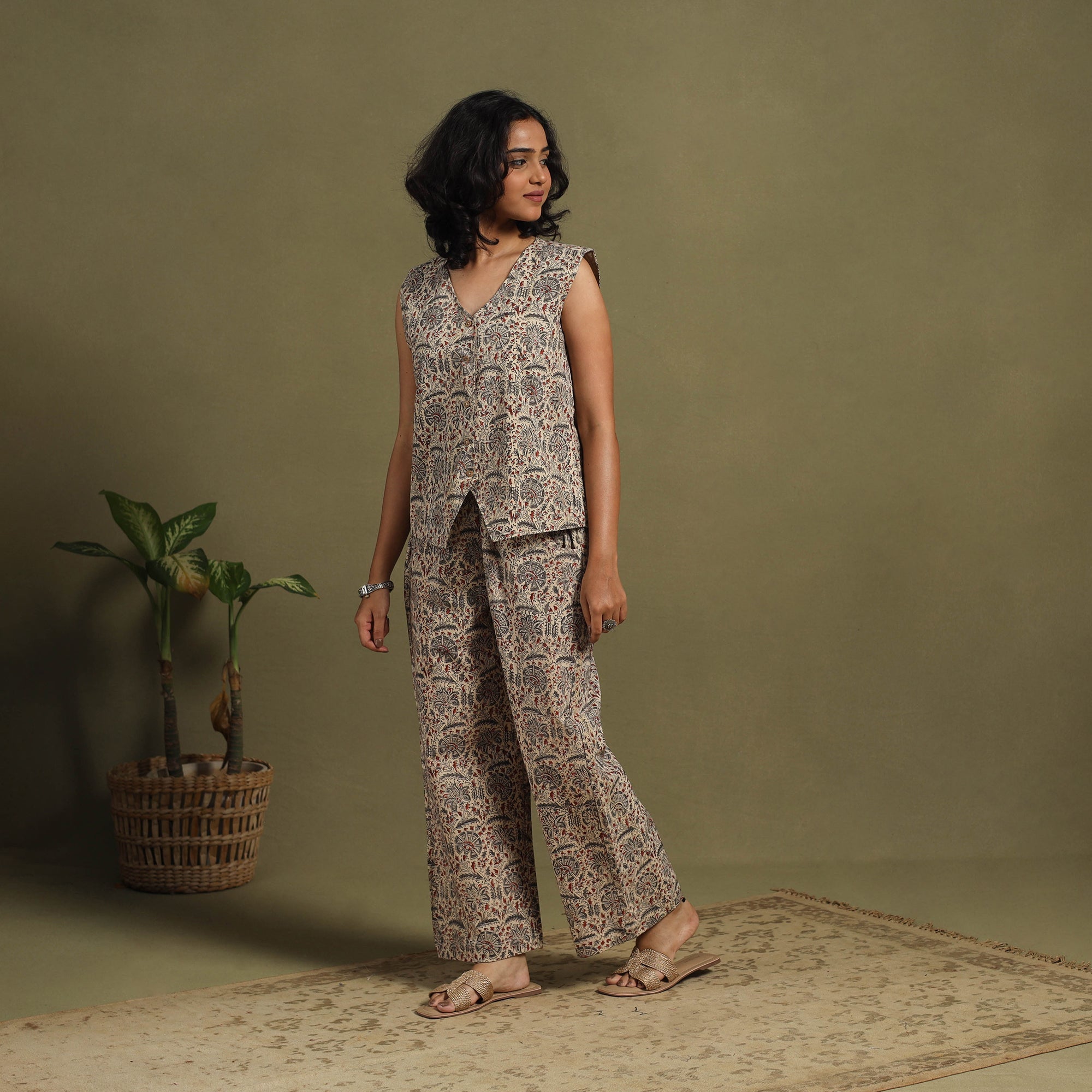 Stay stylish and comfortable in our beige Kalamkari cotton co-ord set, block printed using the traditional Pedana technique. Crafted from naturally dyed, breathable cotton, this two-piece ensemble features a sleeveless V-neck top with front-button detailing for a relaxed fit, paired with easy-going, elasticated waist palazzos featuring two practical side pockets. A perfect choice for all-day wear.