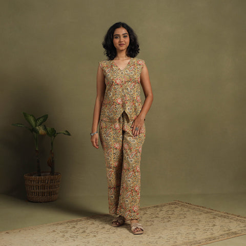Stay stylish and comfortable in our beige Kalamkari cotton co-ord set, block printed using the traditional Pedana technique. Crafted from naturally dyed, breathable cotton, this two-piece ensemble features a sleeveless V-neck top with front-button detailing for a relaxed fit, paired with easy-going, elasticated waist palazzos featuring two practical side pockets. A perfect choice for all-day wear.