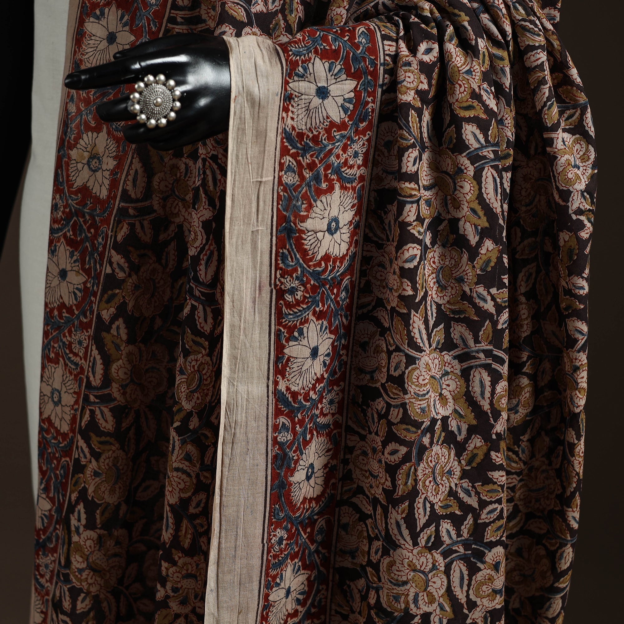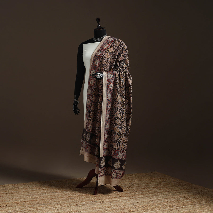 Black block-printed kalamkari cotton dupatta is made in Pedana using traditional wooden blocks. It features detailed motifs created with natural dyes, reflecting the true style of Kalamkari from the region. Known for its fine detailing and heritage value, this dupatta works well for both casual and formal wear.