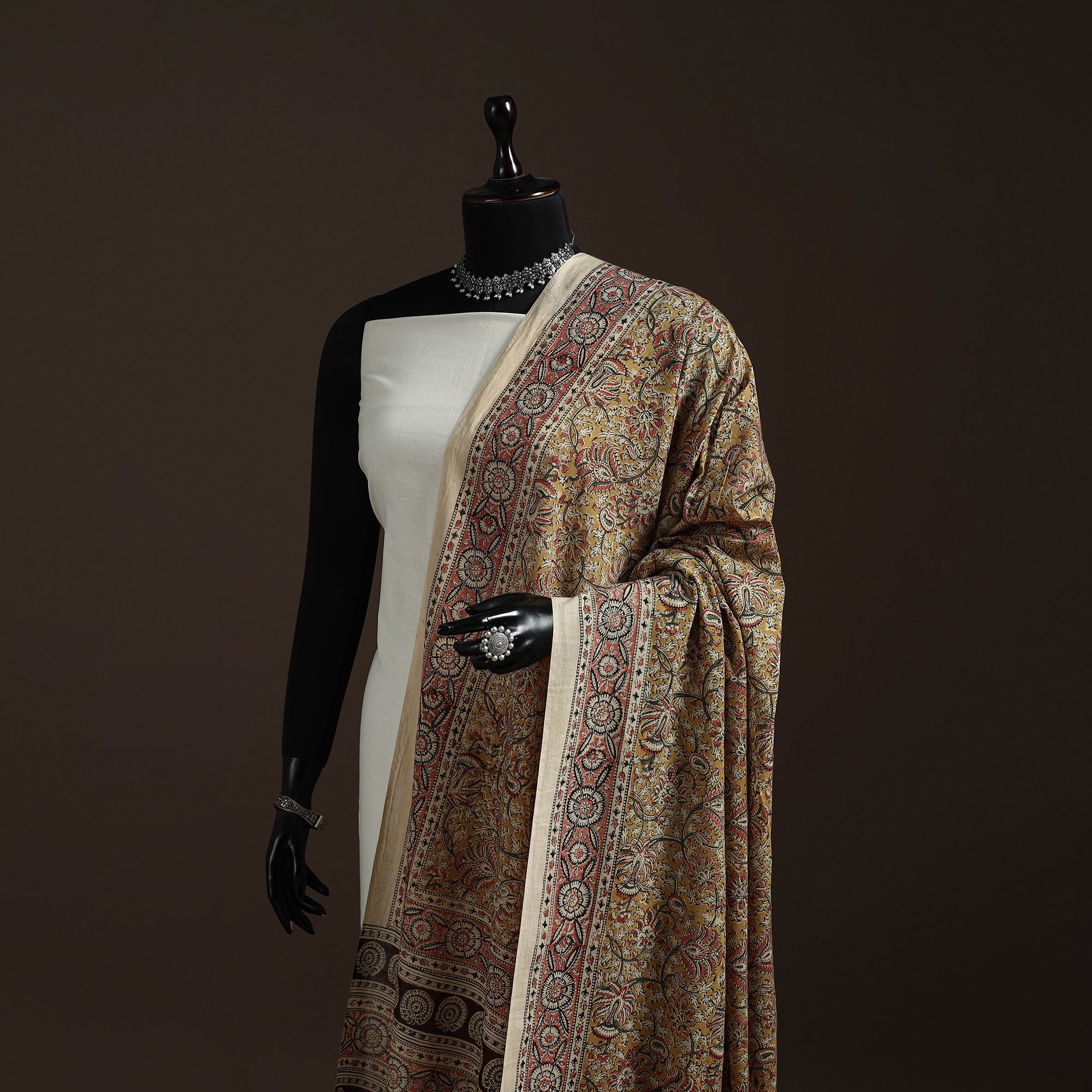 Yellow block-printed kalamkari cotton dupatta is made in Pedana using traditional wooden blocks. It features detailed motifs created with natural dyes, reflecting the true style of Kalamkari from the region. Known for its fine detailing and heritage value, this dupatta works well for both casual and formal wear.