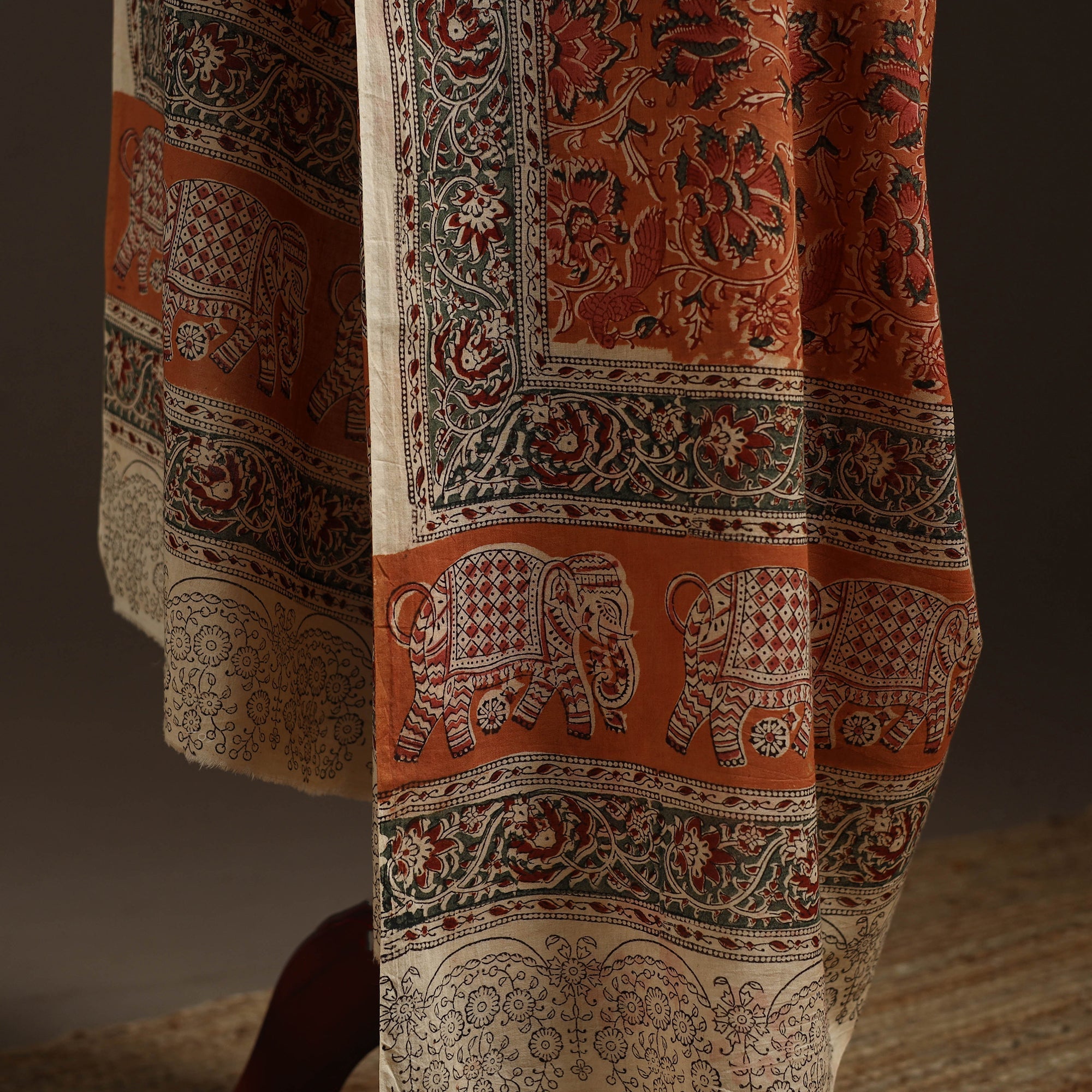 Orange block-printed kalamkari cotton dupatta is made in Pedana using traditional wooden blocks. It features detailed motifs created with natural dyes, reflecting the true style of Kalamkari from the region. Known for its fine detailing and heritage value, this dupatta works well for both casual and formal wear.