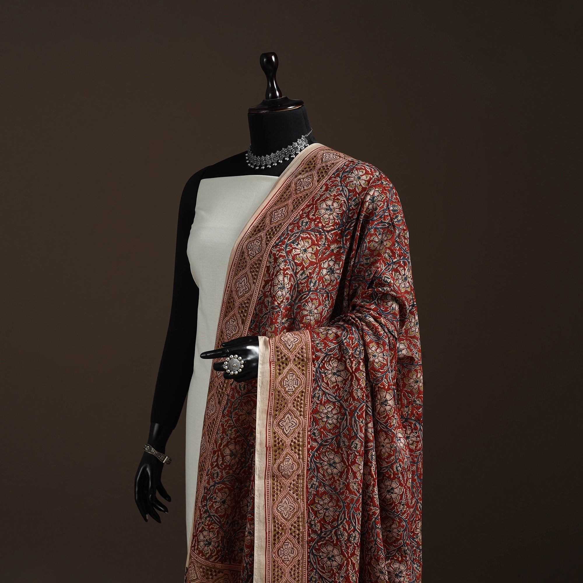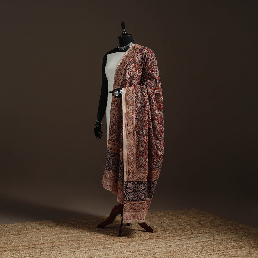 Red block-printed kalamkari cotton dupatta is made in Pedana using traditional wooden blocks. It features detailed motifs created with natural dyes, reflecting the true style of Kalamkari from the region. Known for its fine detailing and heritage value, this dupatta works well for both casual and formal wear.