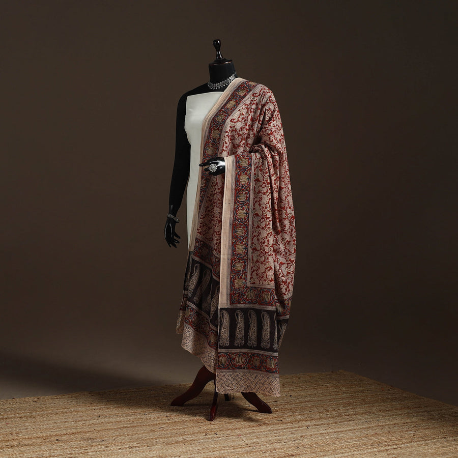 Red block-printed kalamkari cotton dupatta is made in Pedana using traditional wooden blocks. It features detailed motifs created with natural dyes, reflecting the true style of Kalamkari from the region. Known for its fine detailing and heritage value, this dupatta works well for both casual and formal wear.