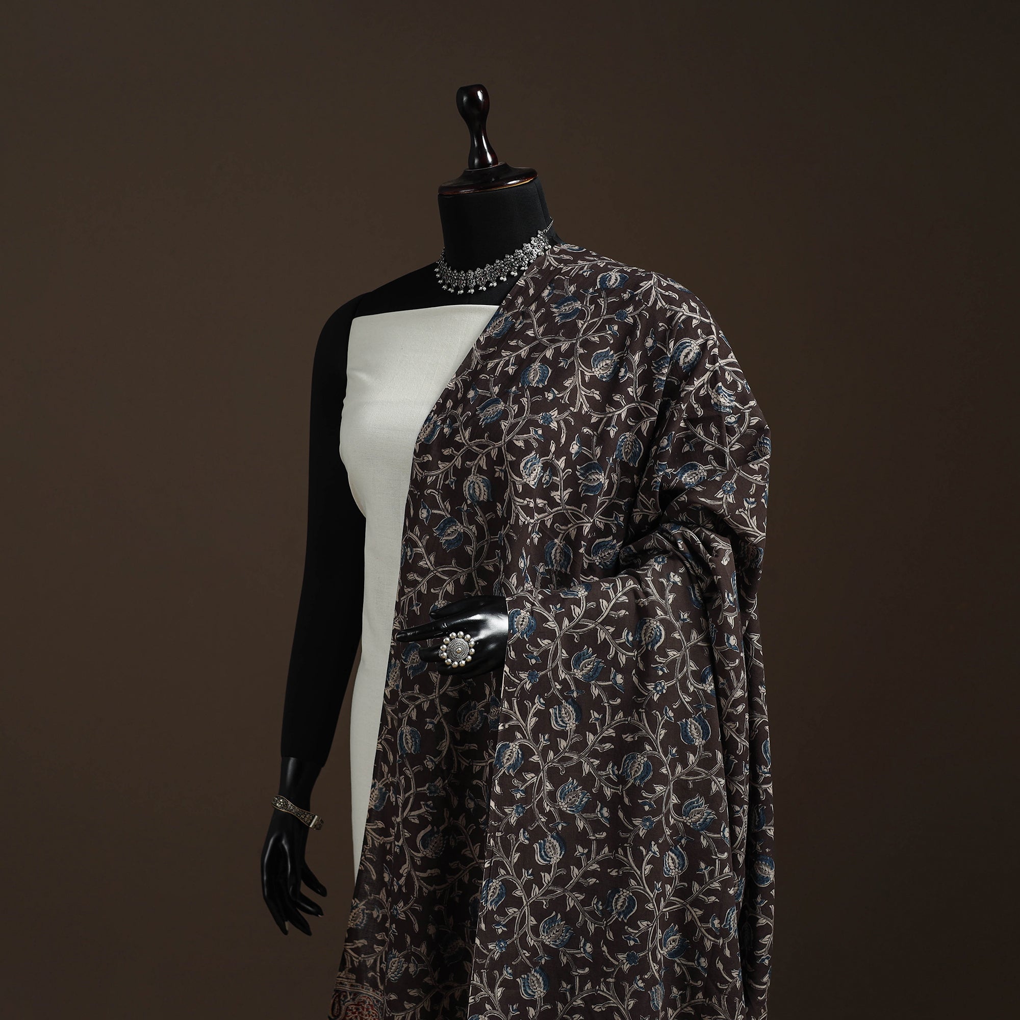 Black block-printed kalamkari cotton dupatta is made in Pedana using traditional wooden blocks. It features detailed motifs created with natural dyes, reflecting the true style of Kalamkari from the region. Known for its fine detailing and heritage value, this dupatta works well for both casual and formal wear.