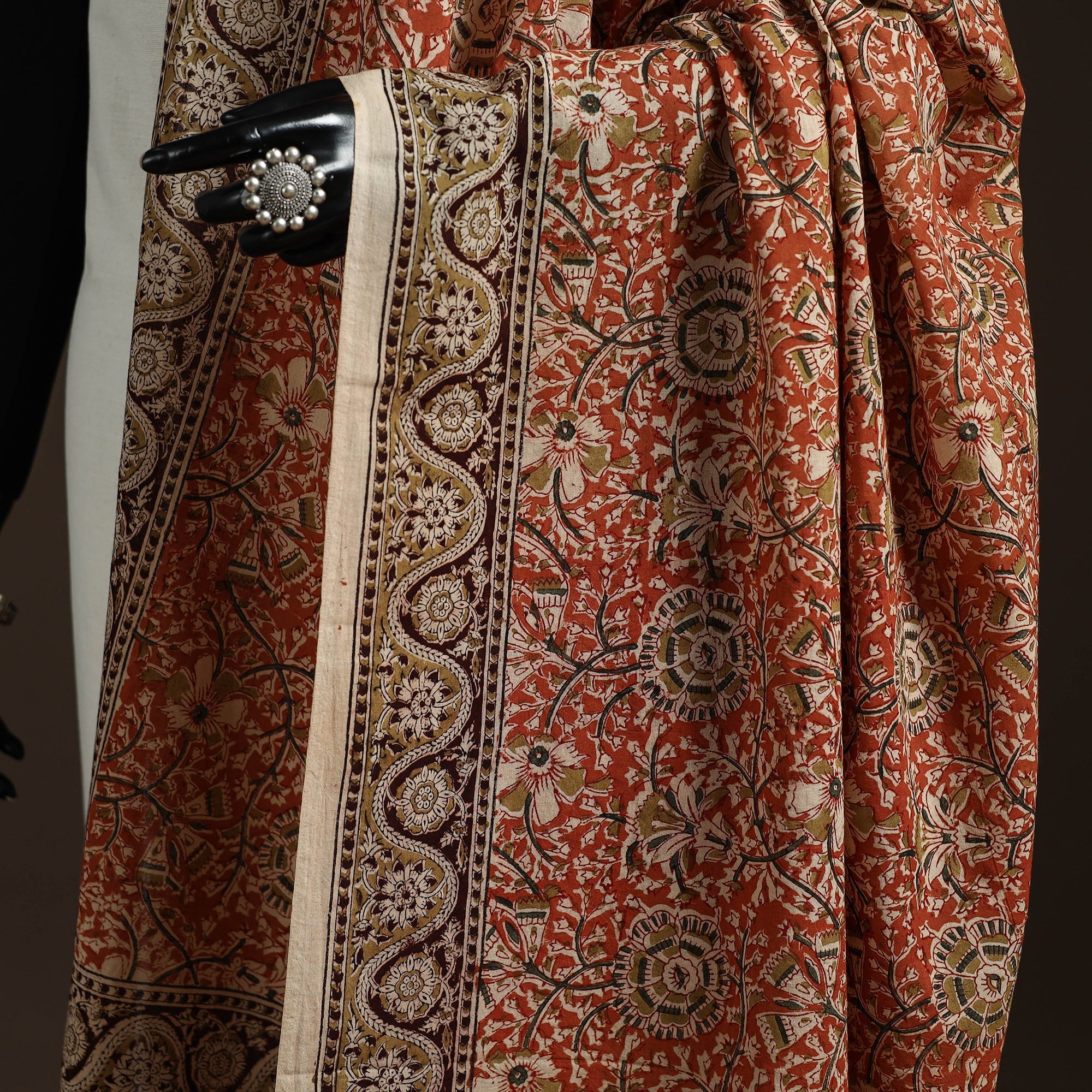 Block-printed kalamkari cotton dupatta is made in Pedana using traditional wooden blocks. It features detailed motifs created with natural dyes, reflecting the true style of Kalamkari from the region. Known for its fine detailing and heritage value, this dupatta works well for both casual and formal wear.