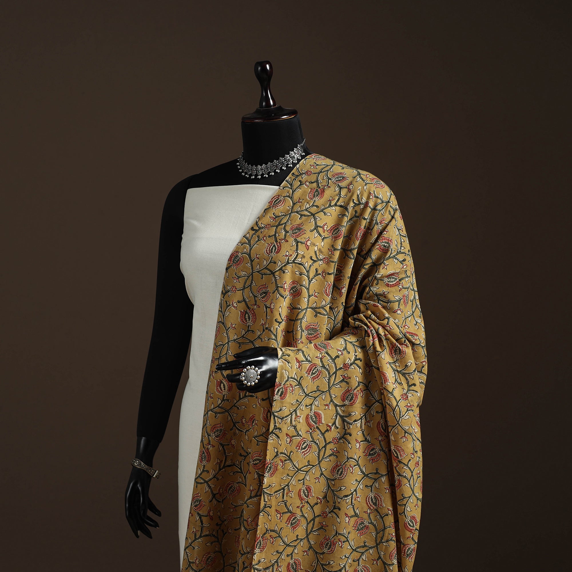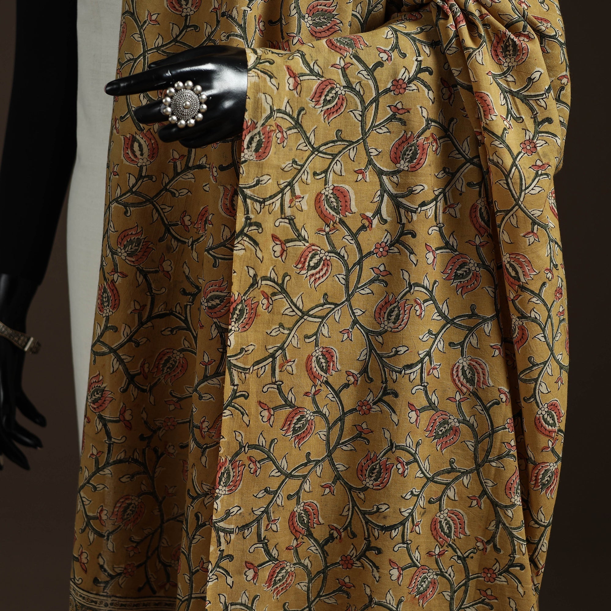 Yellow block-printed kalamkari cotton dupatta is made in Pedana using traditional wooden blocks. It features detailed motifs created with natural dyes, reflecting the true style of Kalamkari from the region. Known for its fine detailing and heritage value, this dupatta works well for both casual and formal wear.