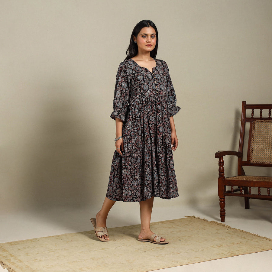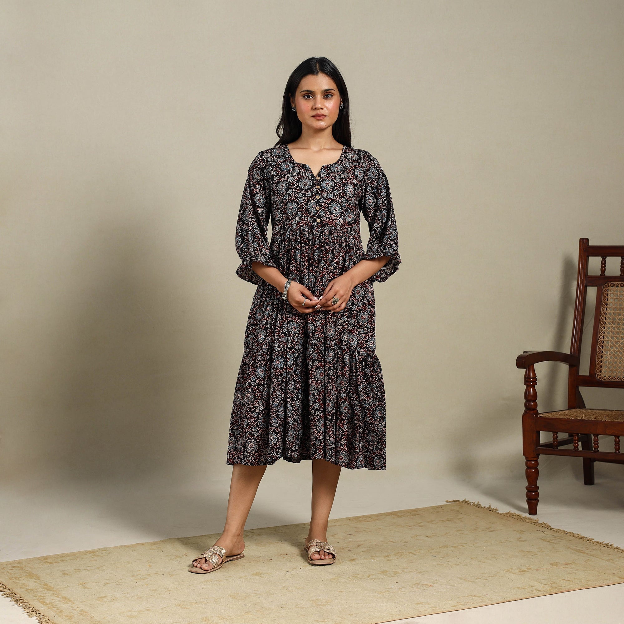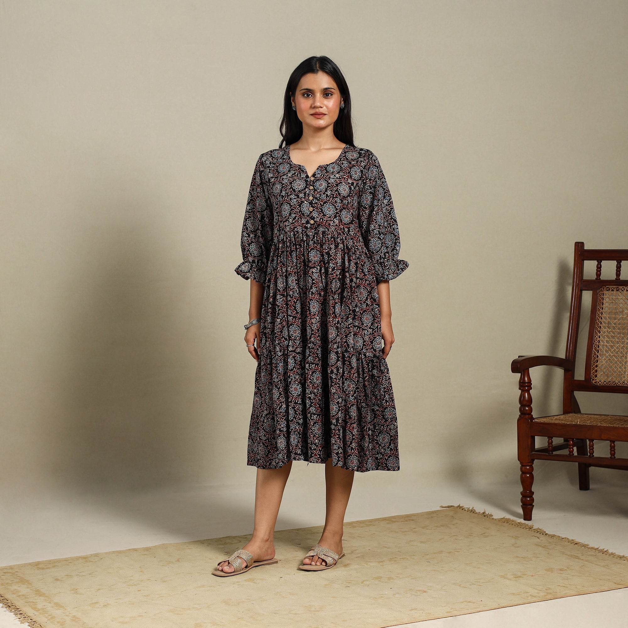 This black ajrakh hand block printed cotton tiered dress blends heritage with everyday ease. Made with traditional patterns and natural dyes, it feels light, breathable, and comfortable for all-day wear. Ideal for relaxed homewear, casual outings, or gifting, it’s a dress that effortlessly brings together style and comfort.