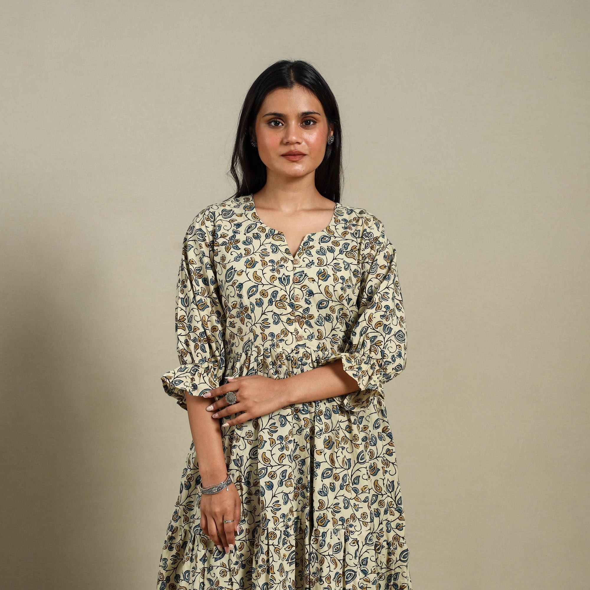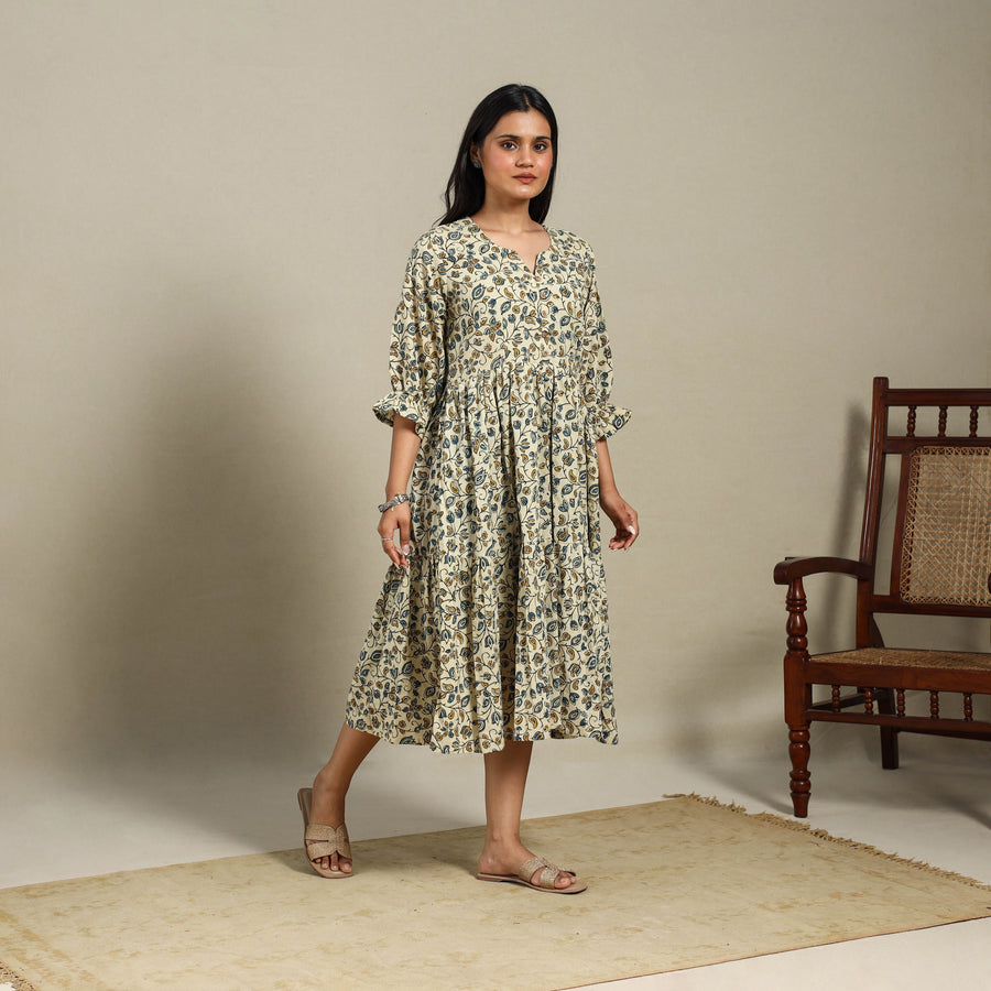 This beige ajrakh hand block printed cotton tiered dress blends heritage with everyday ease. Made with traditional patterns and natural dyes, it feels light, breathable, and comfortable for all-day wear. Ideal for relaxed homewear, casual outings, or gifting, it’s a dress that effortlessly brings together style and comfort.