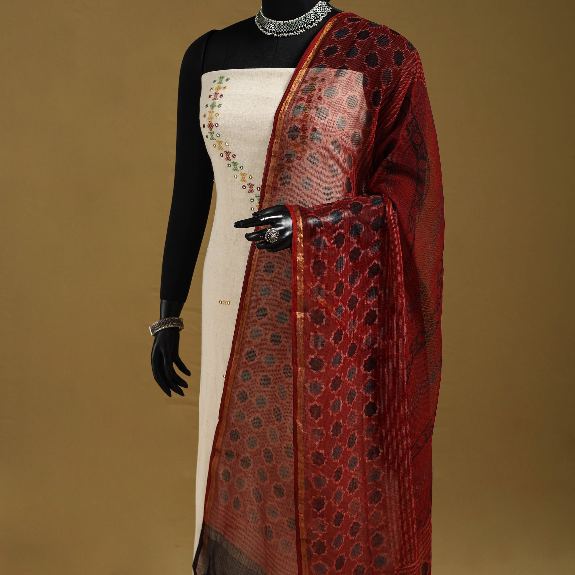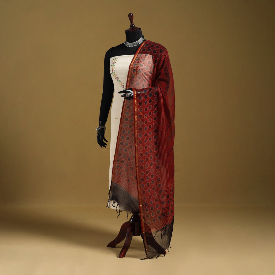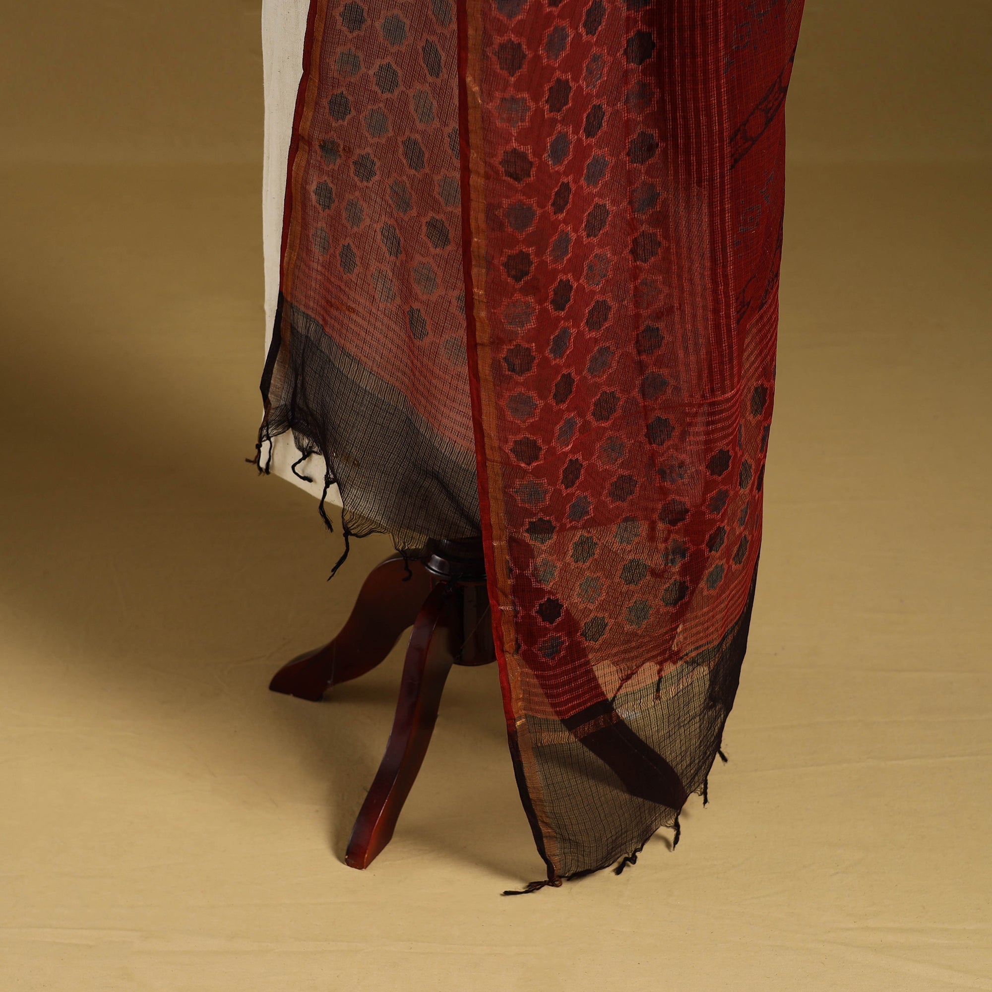 | Material | This red naturally dyed block-printed kota doria cotton ajrakh dupatta is crafted by artisans from Gujarat using traditional ajrakh techniques. Designed with natural dyes, it features delicate tassels and a zari border that lend a subtle charm. The airy texture and timeless patterns make it suitable for everyday wear as well as festive occasions. |