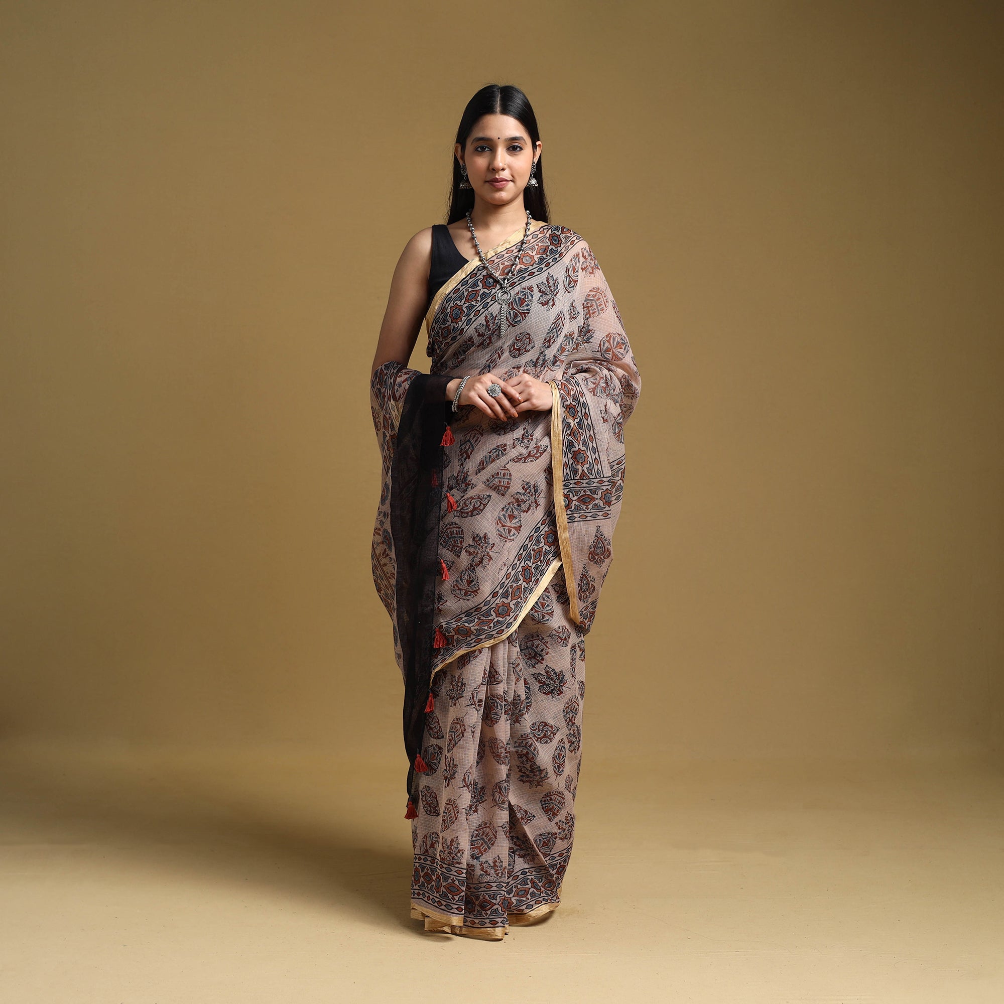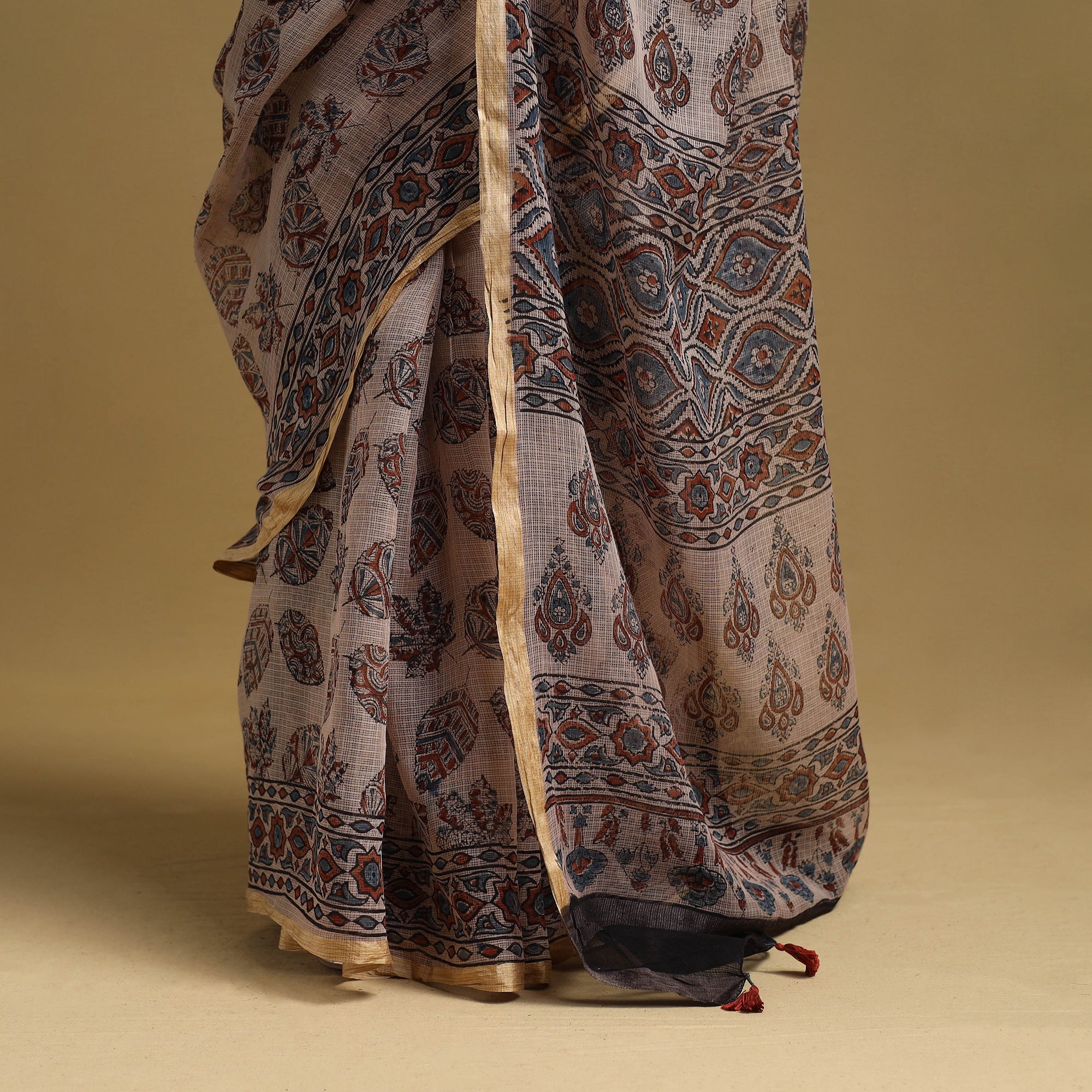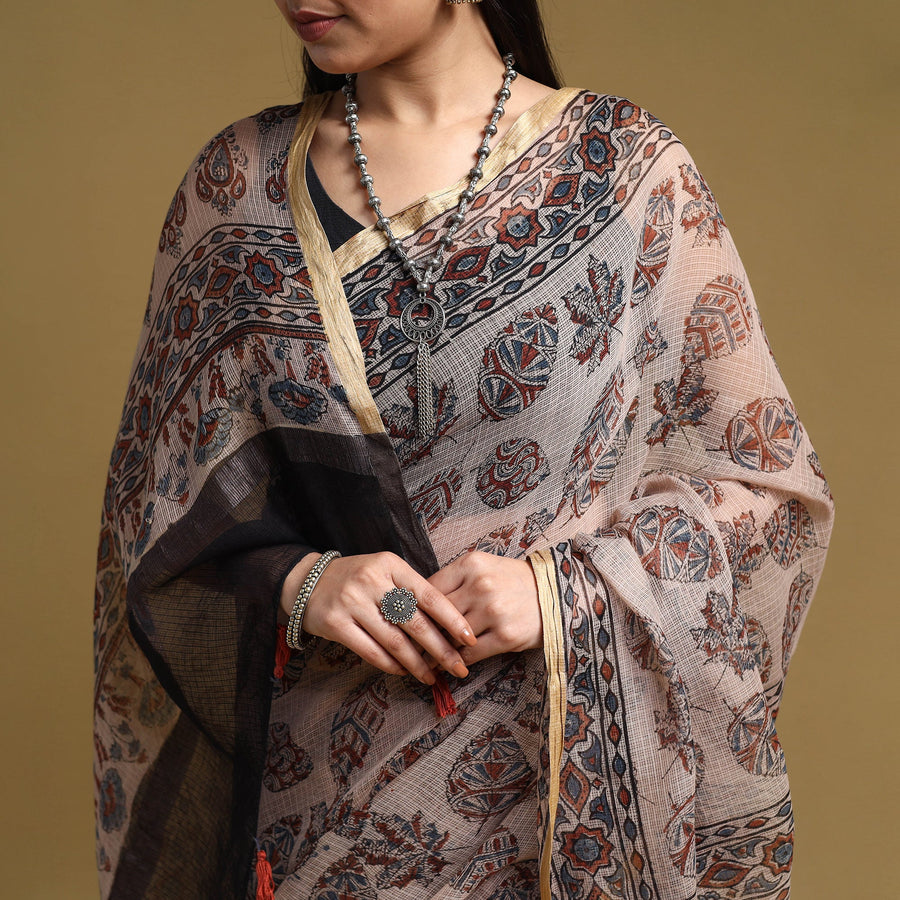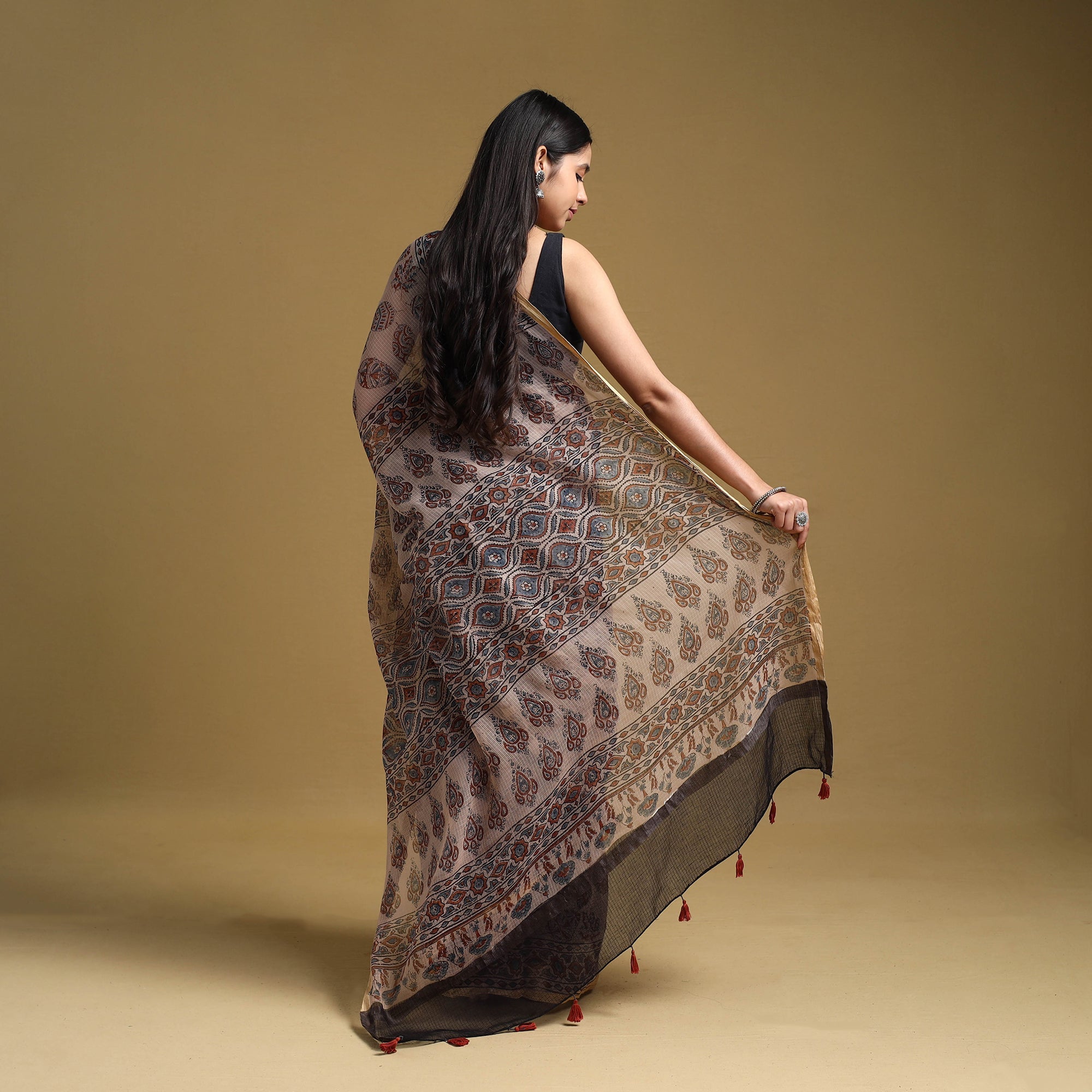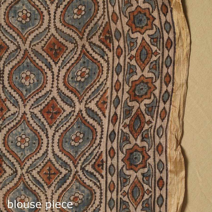 This exquisite natural dyed block print kota doria cotton beige ajrakh saree with ghicha silk border showcases the timeless craftsmanship of the Kutch artisans. Made with natural dyes using a resist-dyeing technique, each saree tells a story of heritage and skill. The Ajrakh process is intricate, involving multiple stages of printing and dyeing to create its iconic geometric motifs. Perfect for special occasions, this saree offers elegance with sustainability.