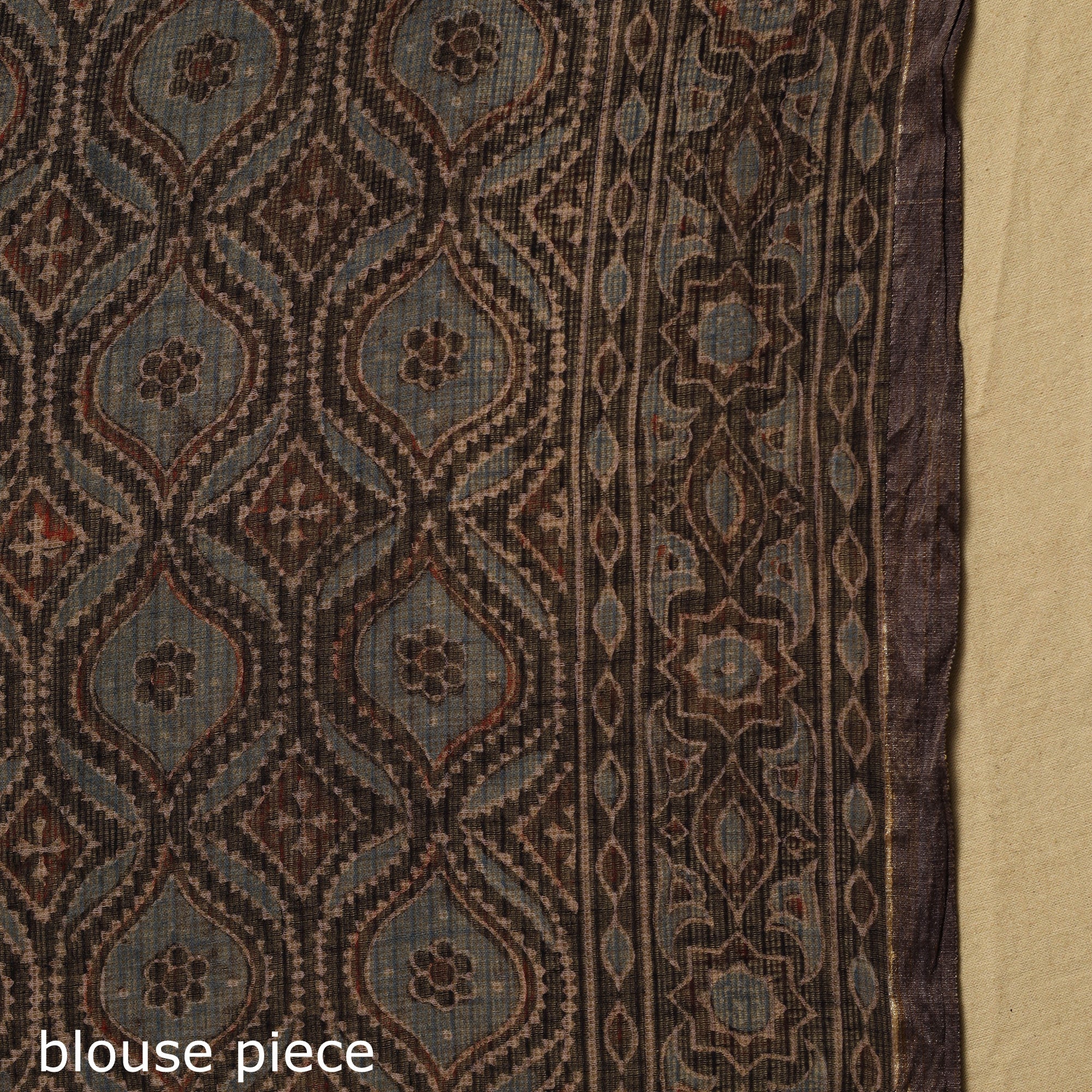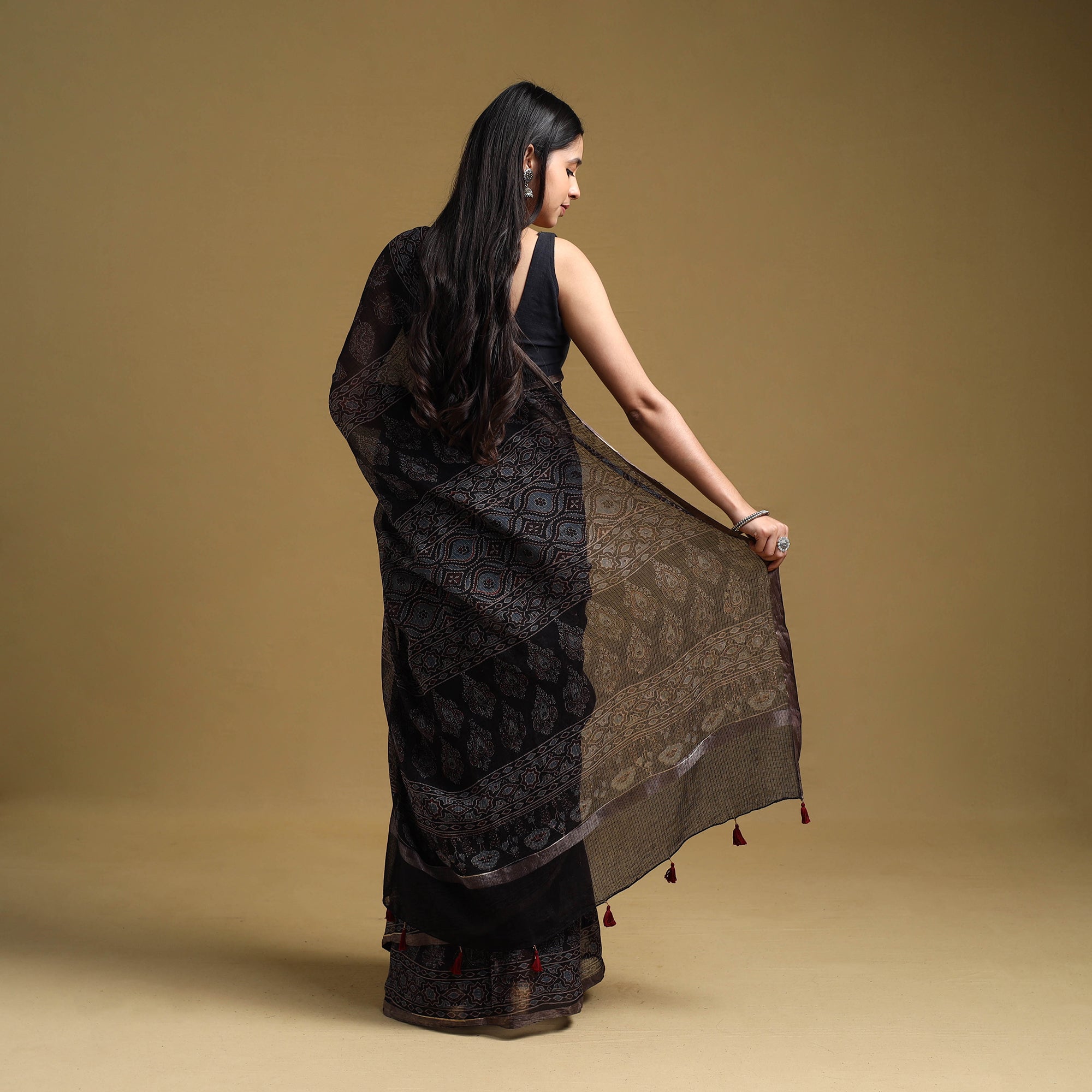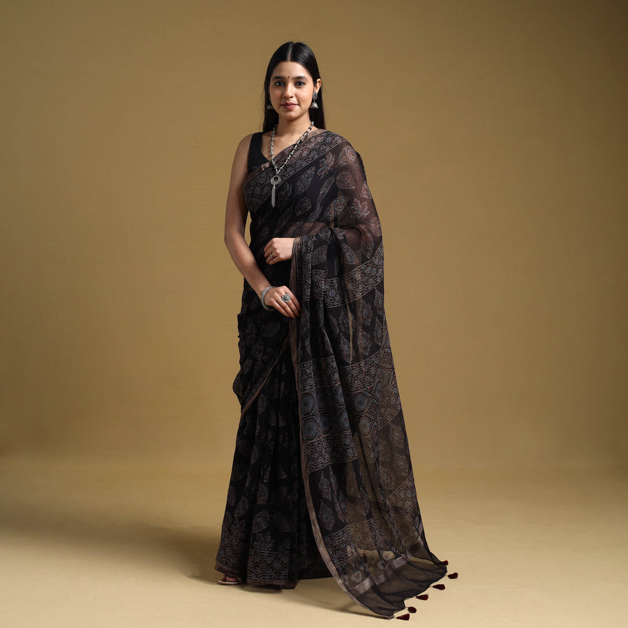 This exquisite natural dyed block print kota doria cotton black ajrakh saree with ghicha silk border showcases the timeless craftsmanship of the Kutch artisans. Made with natural dyes using a resist-dyeing technique, each saree tells a story of heritage and skill. The Ajrakh process is intricate, involving multiple stages of printing and dyeing to create its iconic geometric motifs. Perfect for special occasions, this saree offers elegance with sustainability.