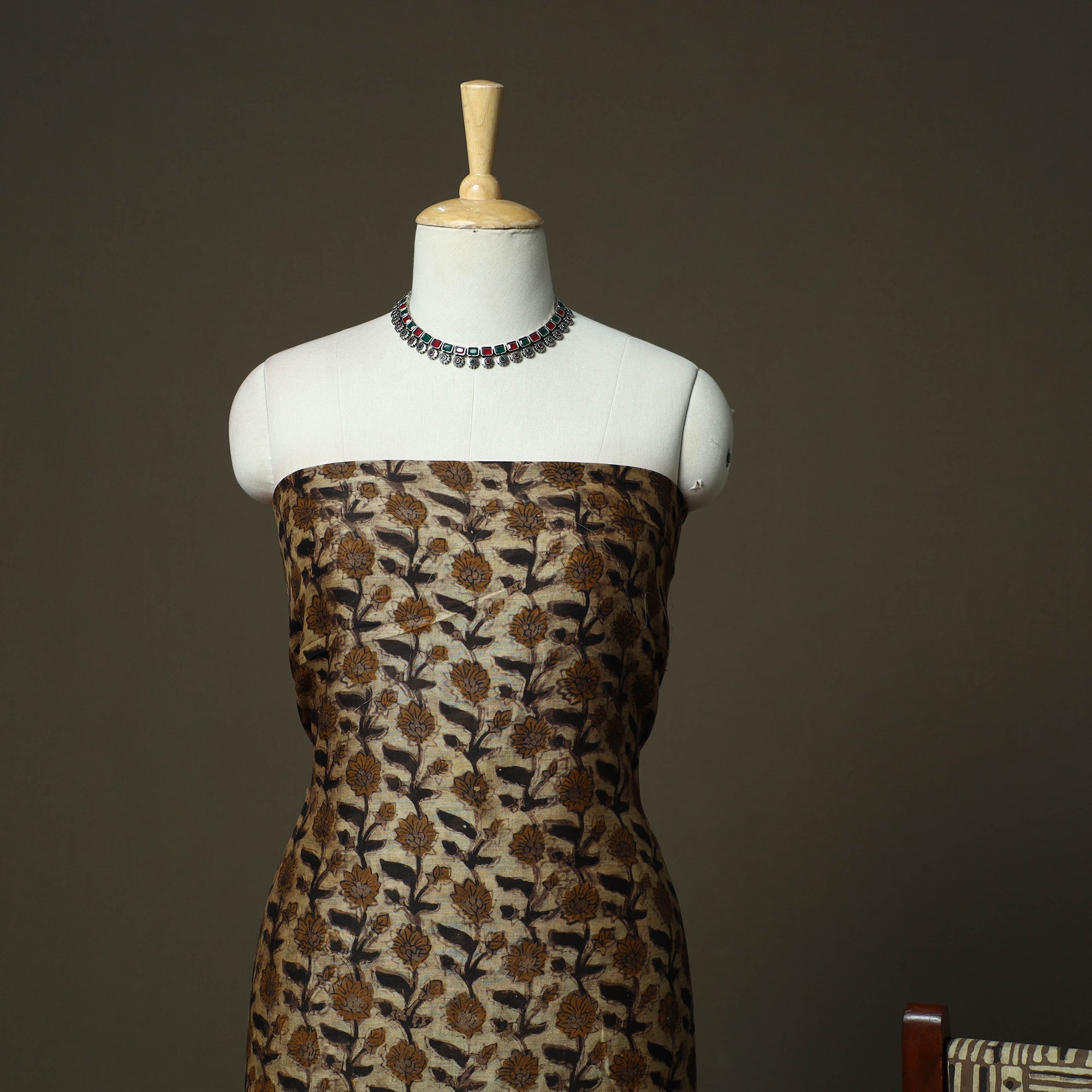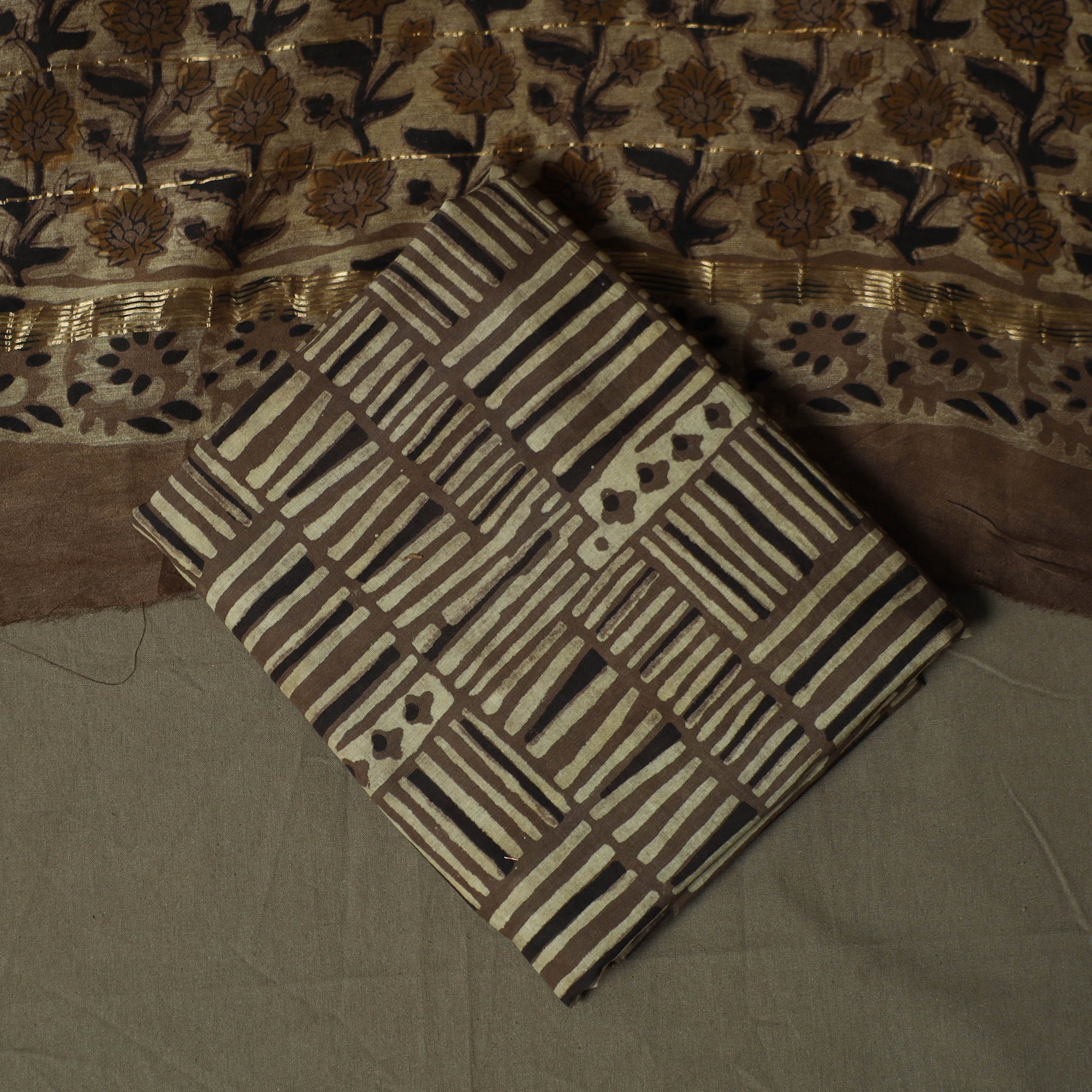 Brown jahota hand block print natural dyed maheshwari silk cotton 3pc unstitched dress material is crafted using a 400–500 year old mud-resist printing technique practiced by artisans in Rajasthan. Skilled artisans use carved wooden blocks and a hand-prepared mud resist. Once washed, the resist reveals jahota inspired motifs in soft, earthy tones. The set includes kurta fabric and a dupatta finished with a subtle zari border, along with a cotton bottom and can be tailored into a graceful ethnic outfit.