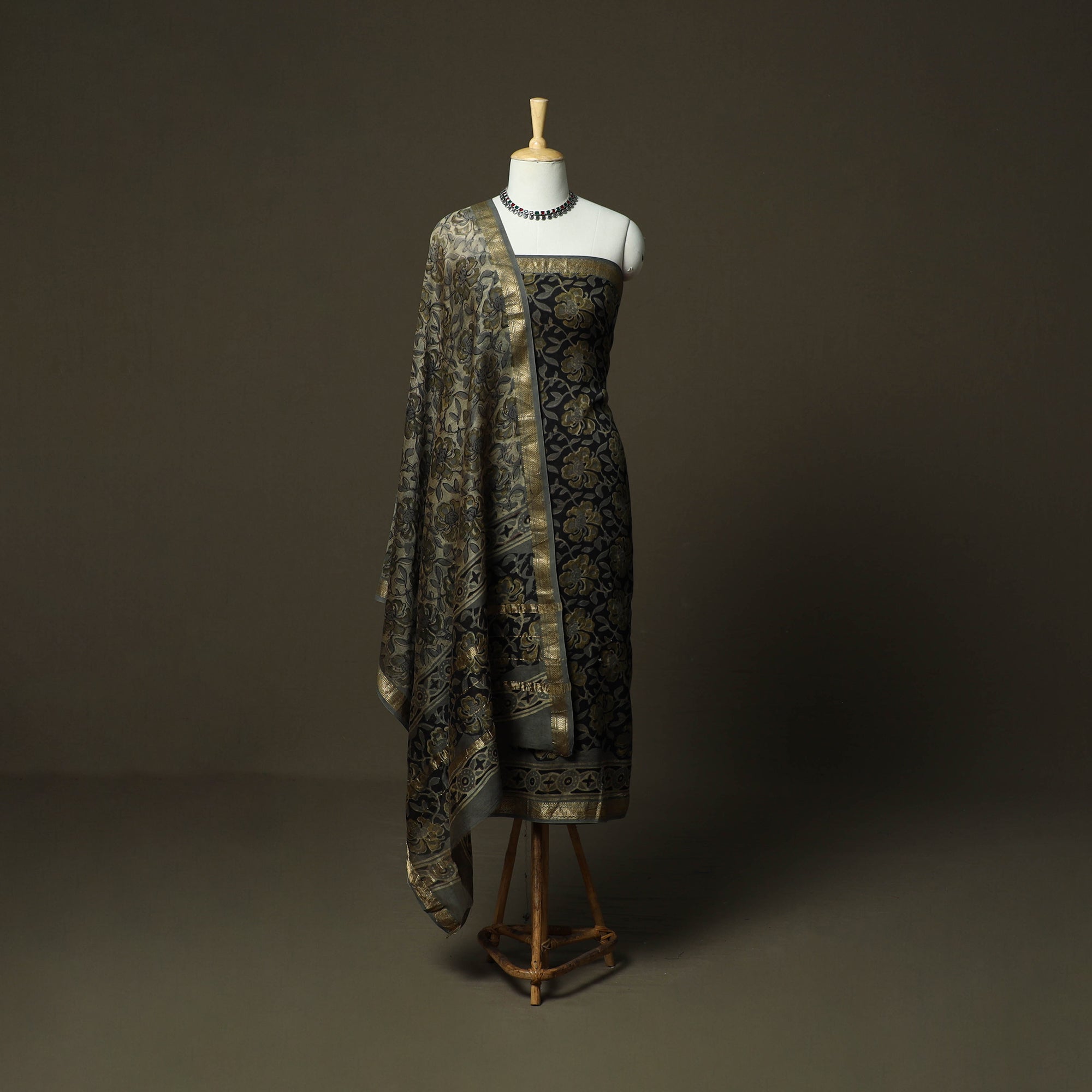Black vanaspati bagru hand block print natural dyed maheshwari silk cotton 3pc unstitched dress material is crafted using a 400–450 year old Bagru printing technique from Rajasthan. Skilled artisans apply a hand-prepared mud resist with carved wooden blocks. Once washed, the resist reveals nature-inspired Vanaspati motifs in soft, earthy tones. The set includes kurta fabric and a dupatta finished with a subtle zari border, along with a cotton bottom and can be tailored into a graceful ethnic outfit.
