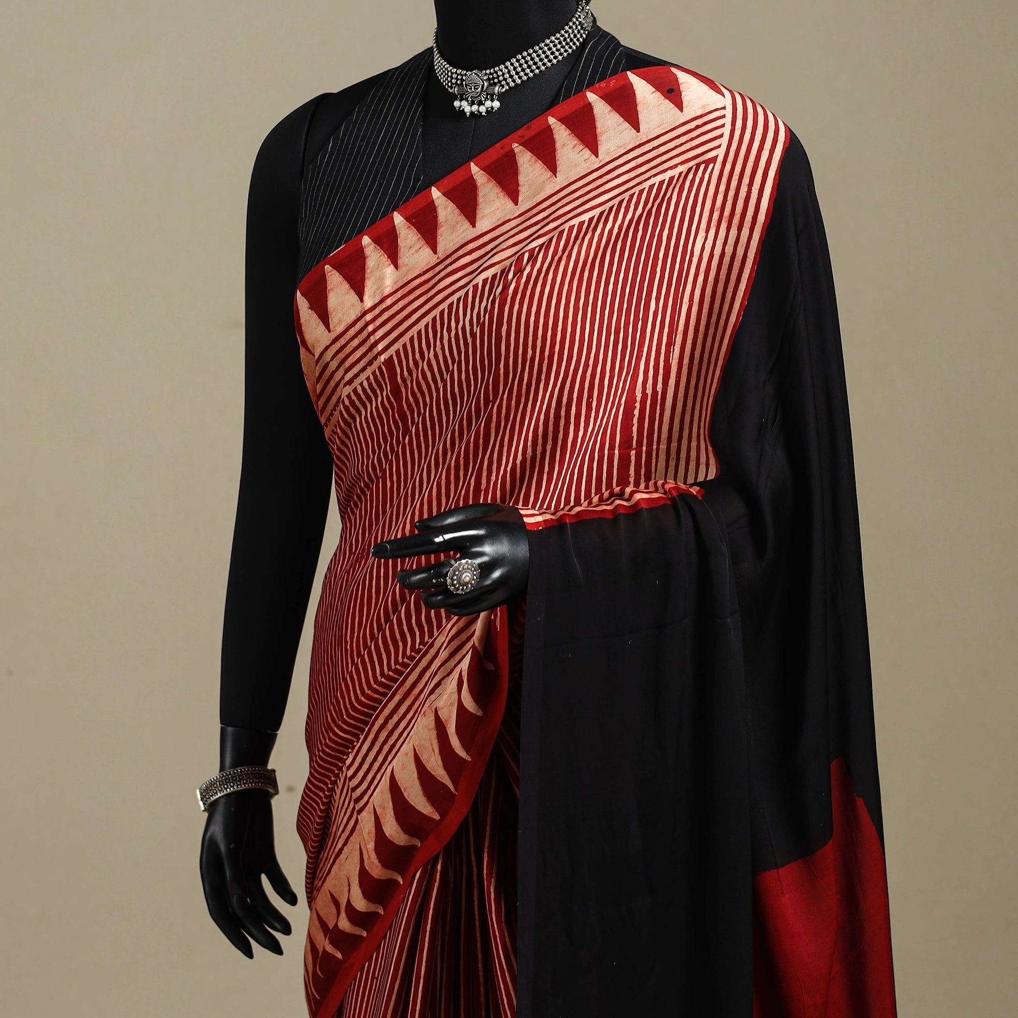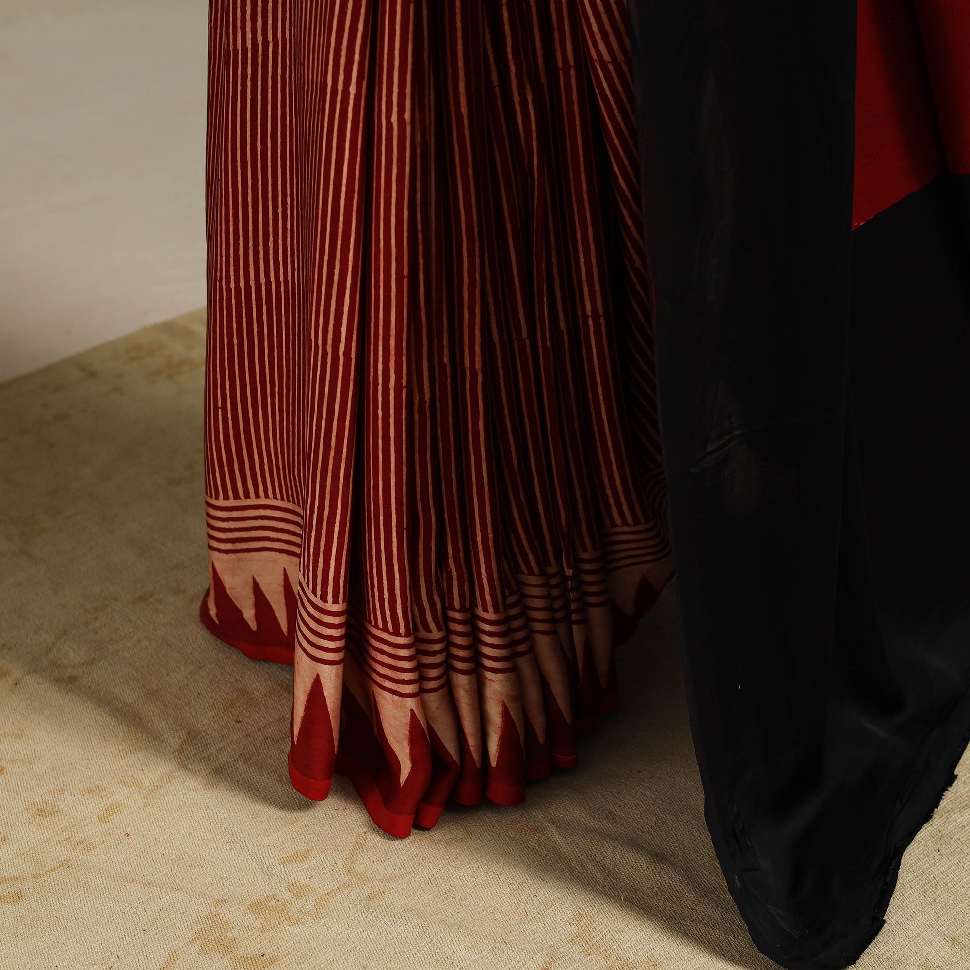 This red naturally dyed hand block print modal silk ajrakh saree showcases the artistry of Kutch artisans. Made with natural dyes using one of the world’s oldest resist-dyeing traditions rooted in the Indus Valley era, each saree tells a story of heritage and skill. The ajrakh process is intricate, involving multiple stages of printing and dyeing to create its iconic geometric motifs. Perfect for special occasions, this saree blends elegance with sustainability. Celebrate culture and artistry with every drape.