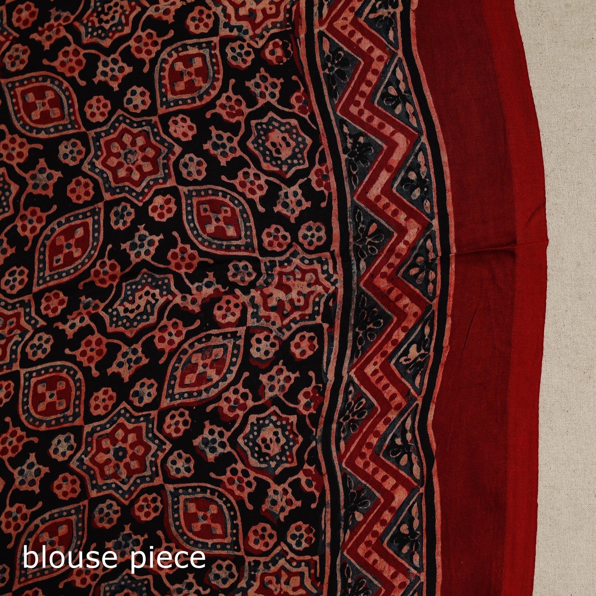 | Material | This red naturally dyed hand block print modal silk ajrakh saree showcases the artistry of Kutch artisans. Made with natural dyes using one of the world’s oldest resist-dyeing traditions rooted in the Indus Valley era, each saree tells a story of heritage and skill. The ajrakh process is intricate, involving multiple stages of printing and dyeing to create its iconic geometric motifs. Perfect for special occasions, this saree blends elegance with sustainability. Celebrate culture and artistry with every drape. A Note on Handmade Beauty: |